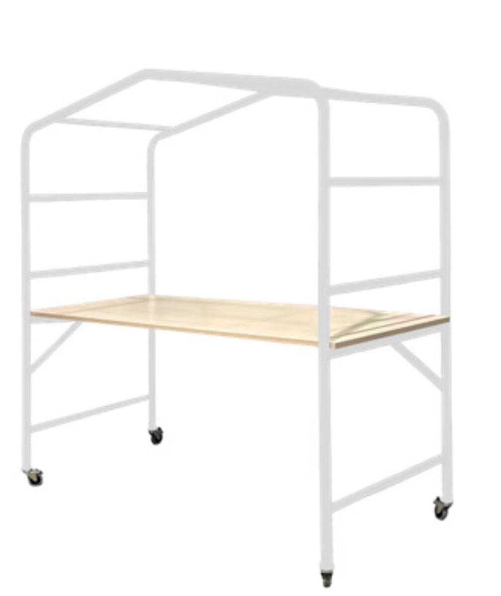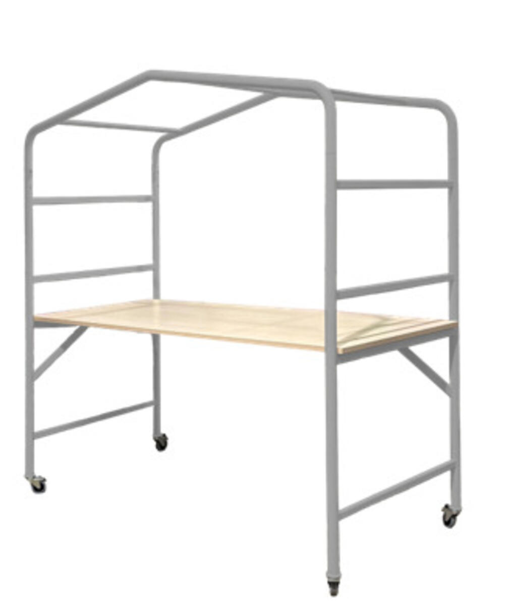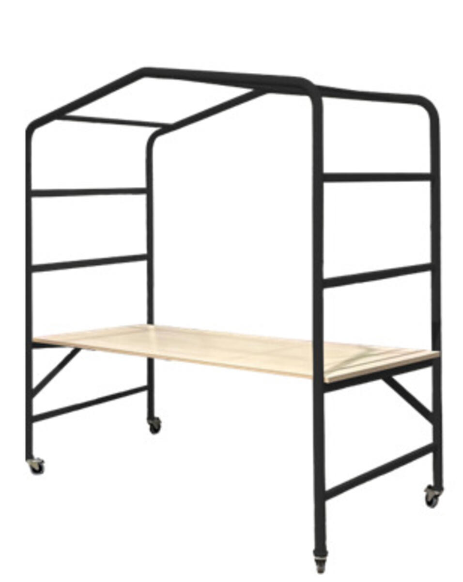Tøft, allsidig multibord/møtebord/arbeidsbord/konferansebord til all slags bruk; flytt det hvor som helst på store, lett dreibare hjul. Bordplate i MDF belagt med høytrykkslaminat. Høye endegavler/sidevanger. Pulverlakkert understell i fargene sort, hvit og sølv. 4 dreibare hjul, låsbare. Bordplaten kan justeres i høyde 72 eller 90 cm. Støttestag oppe og nede mellom gavlene. Disse fungerer også som fothviler og «tak» for oppheng av lamper, planter eller andre innredningsdetaljer.