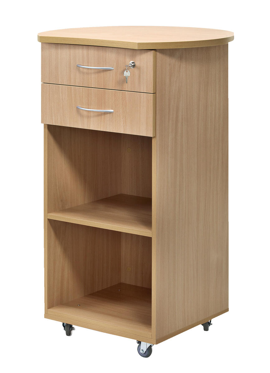Talerstol/kateter/lærerbord i laminat. 1 hylle og 2 skuffer (en låsbar). Mål: 46x44x105 cm. Topplaten er belagt med høytrykkslaminat og 2mm støtabsorberende ABS kantlist. Mål: Ø65 cm med magebue. Med hjul, to låsbare.
