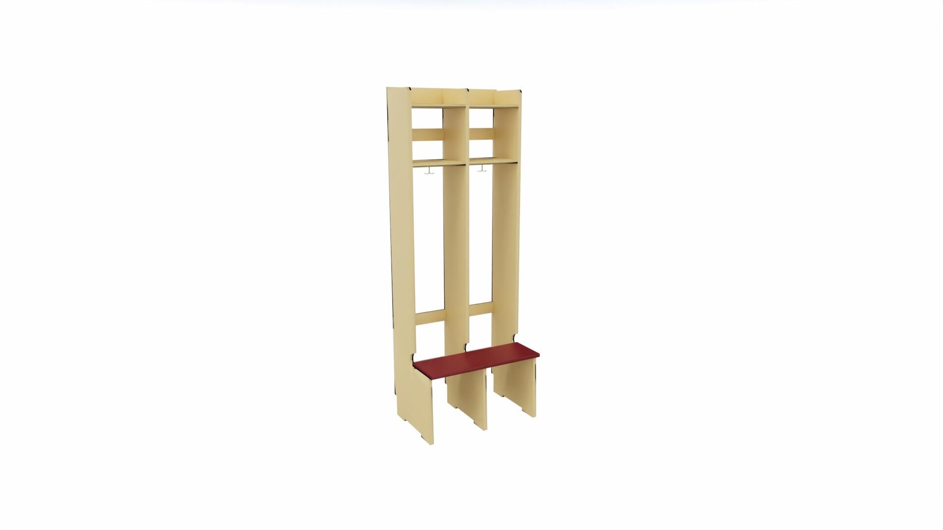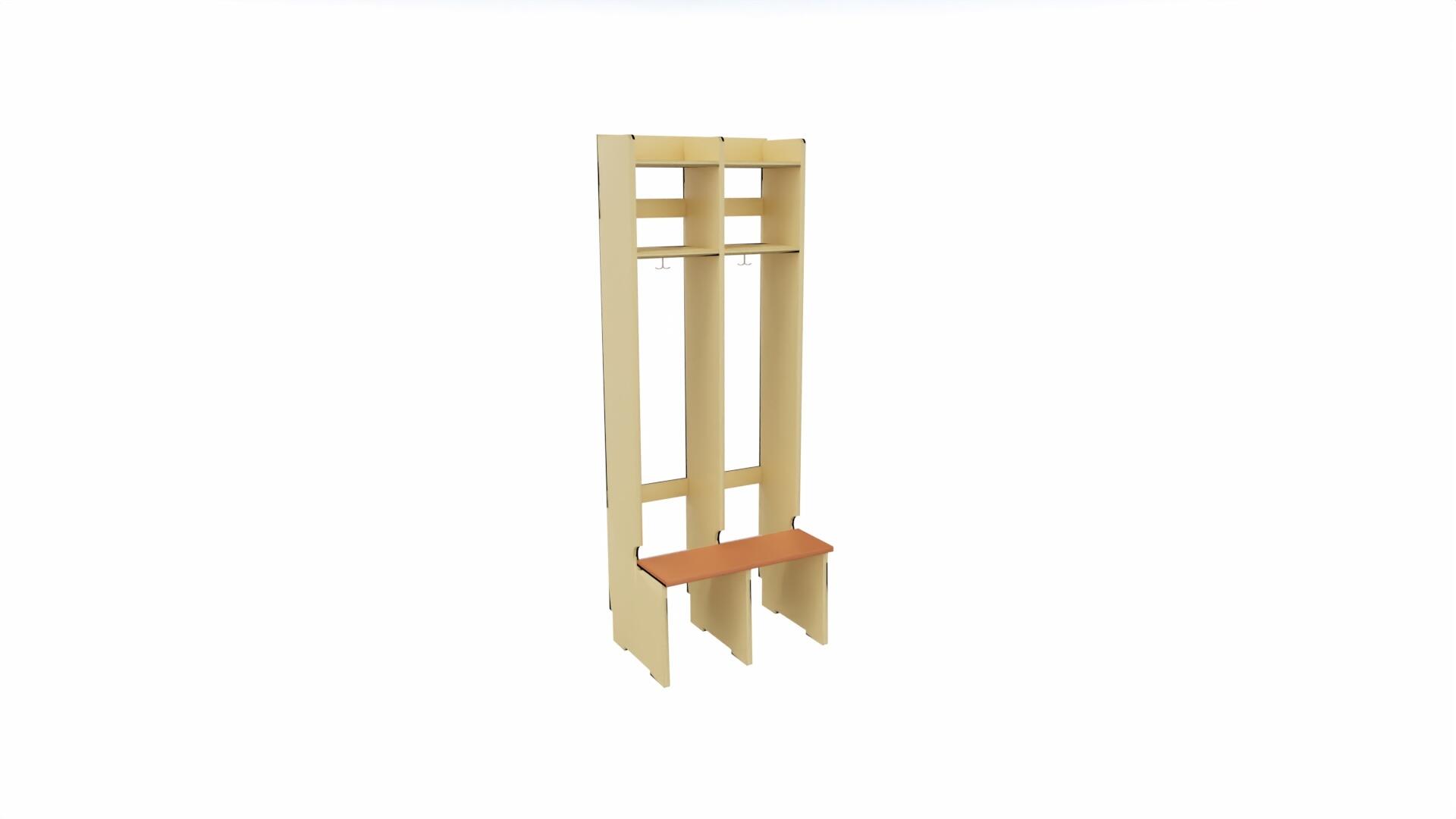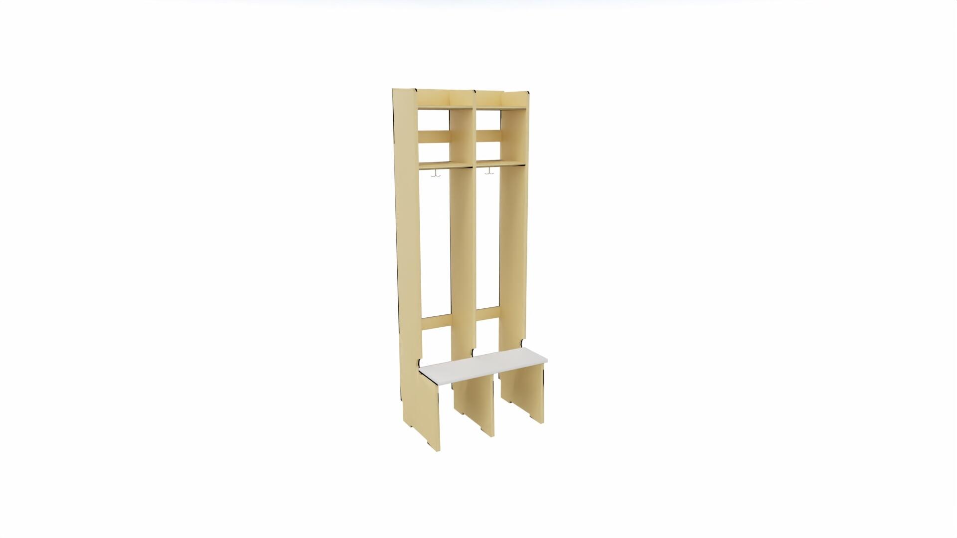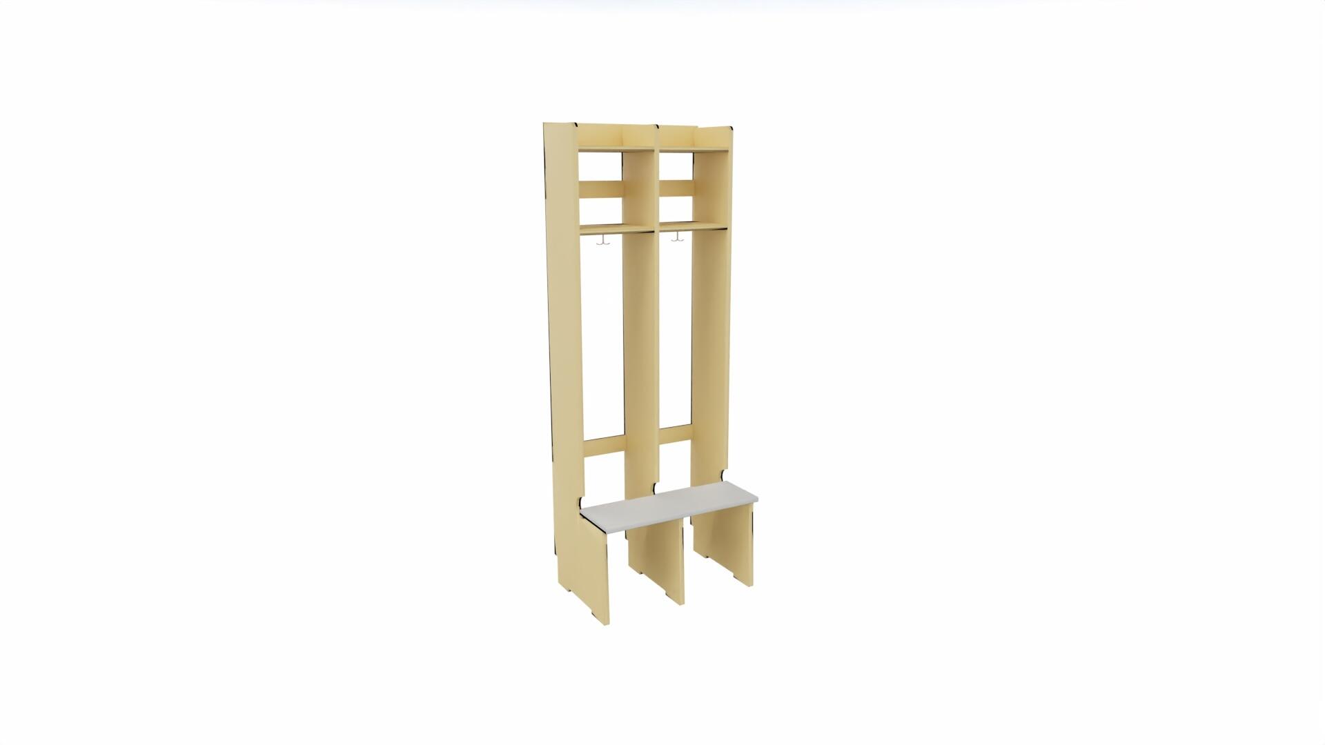 Produsert i 18 mm bjørkekryssfiner. Med sittebenk, skohylle og dobbelkrok på hver plass. Dører finnes som tillegg. Avstand fra kleskrok til skohylle 100 cm. Høyde 168 cm, dybde 24 cm, dybde ved sittebenk 44 cm. Svanemerket, lisensnummer 50310099.