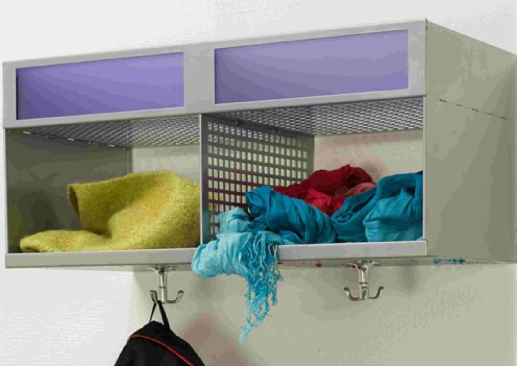 Dobbel kurvhylle i stål med nettingdesign. Karusellkroker med fire armer. Nederste kurv med åpen front, øverste kurv med farvetpleksiglass. 2 rom á 20 cm