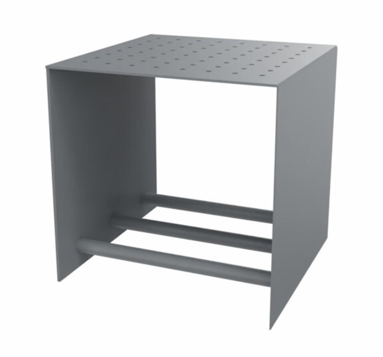 Påkledningsbenk med håndtak og trapp slik at 2 barn kan bruke benken samtidig. Helan har 6 ben, noe som gjør den stødig og stabil. Et sammenleggbart trinn på den ene langsiden gjør det enkelt for barna å komme seg opp på benken. Benkeplaten er laget med en kjerne av bjørkekryssfiner som er dekket med slitesterk bjørkemønstret laminat for å tåle våte og skitne sko og støvler. Grå ben. Lengden 140 cm, bredden 50 cm og høyden 37 cm.