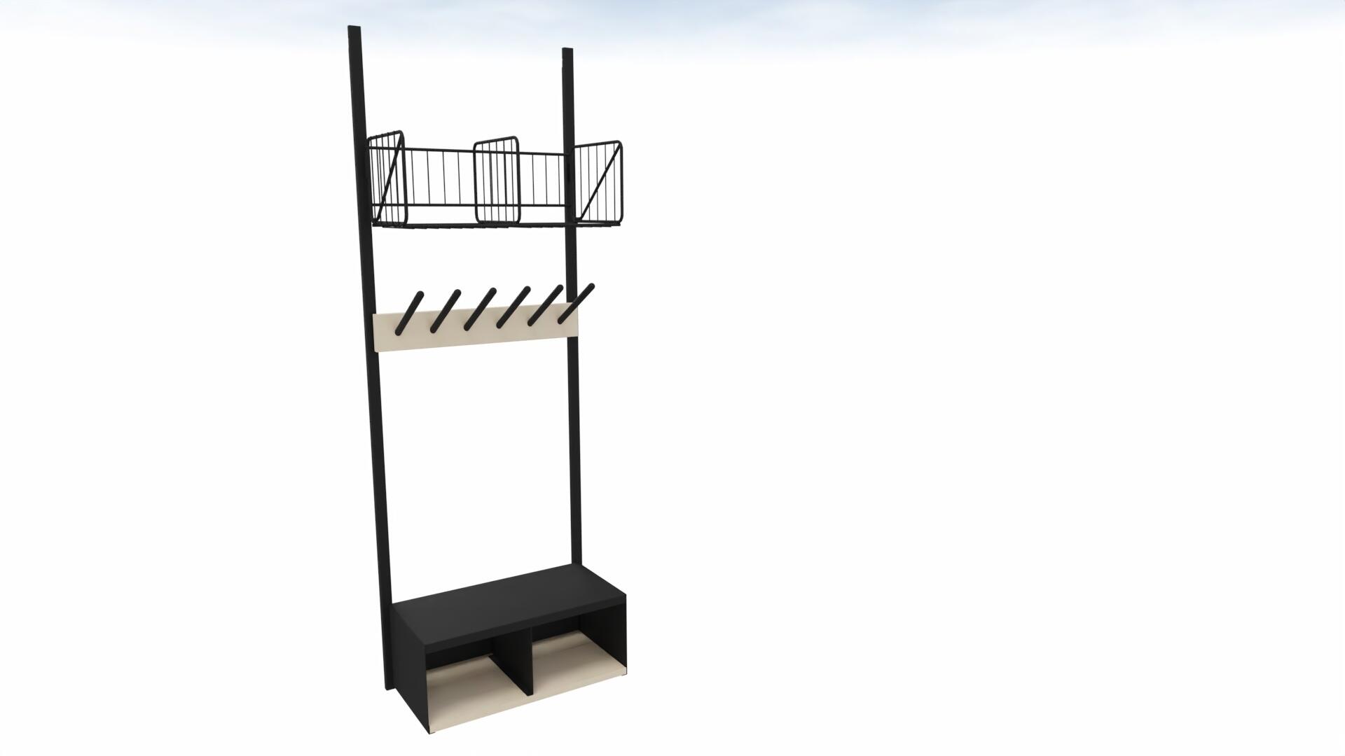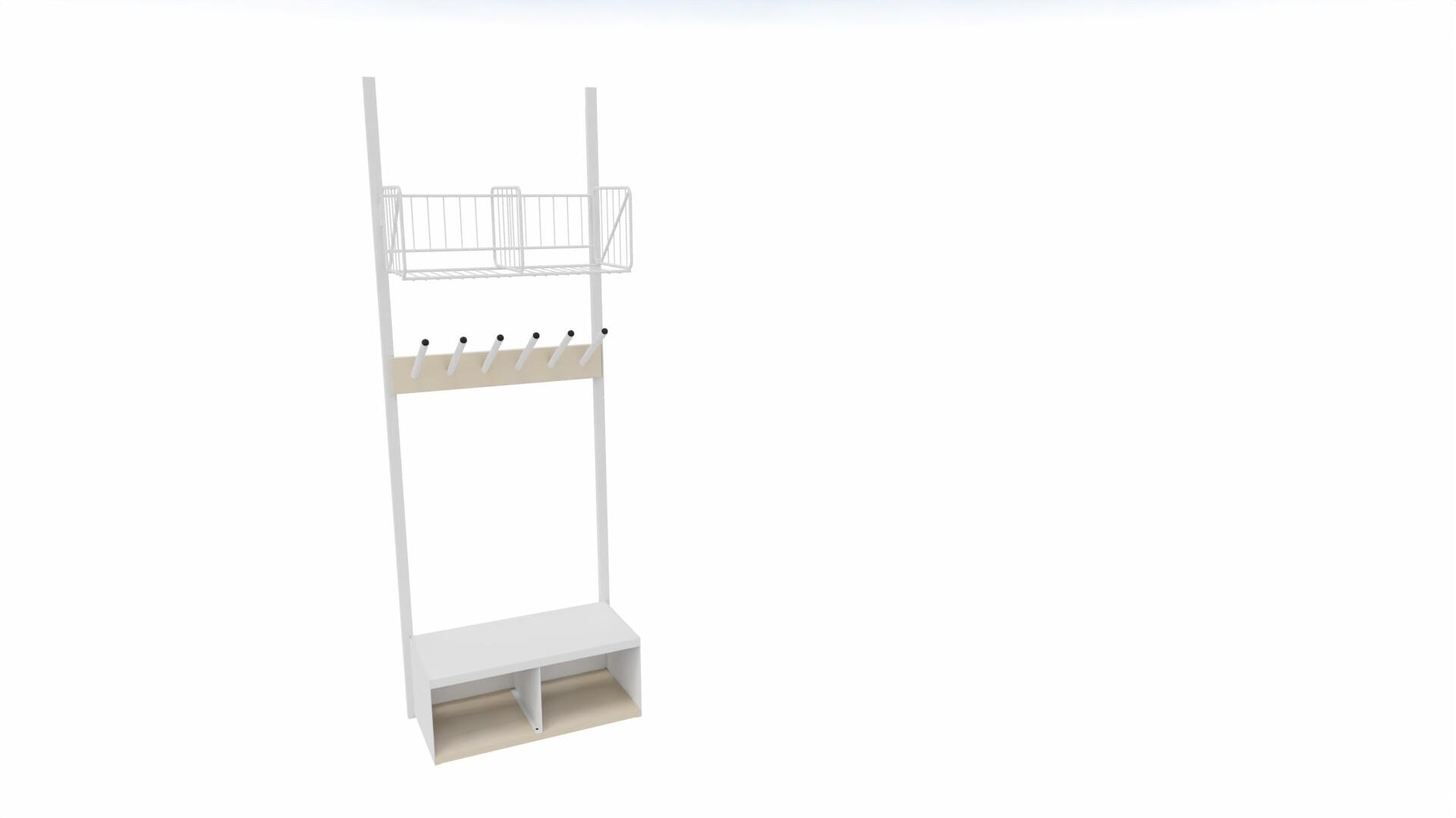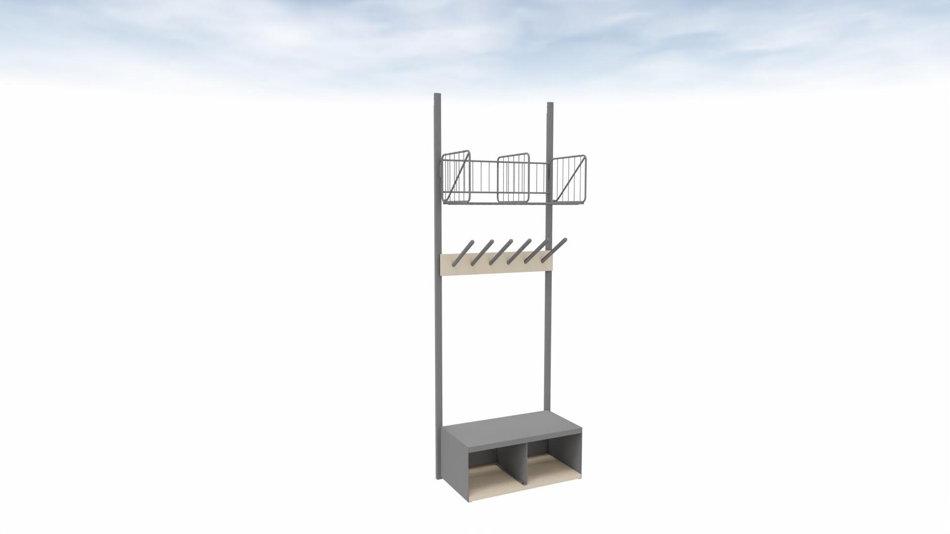 Kombinasjon som består av 1 veggskinner, 1 garderoberom med 2 rom i perforert metall og hylle, knagglist og sittebenk i heltre. Kan enkelt kompletteres med andre komponenter i Wille-systemet. Alle metalldeler til Wille-serien er pulverlakkert. Bredde 60 cm.