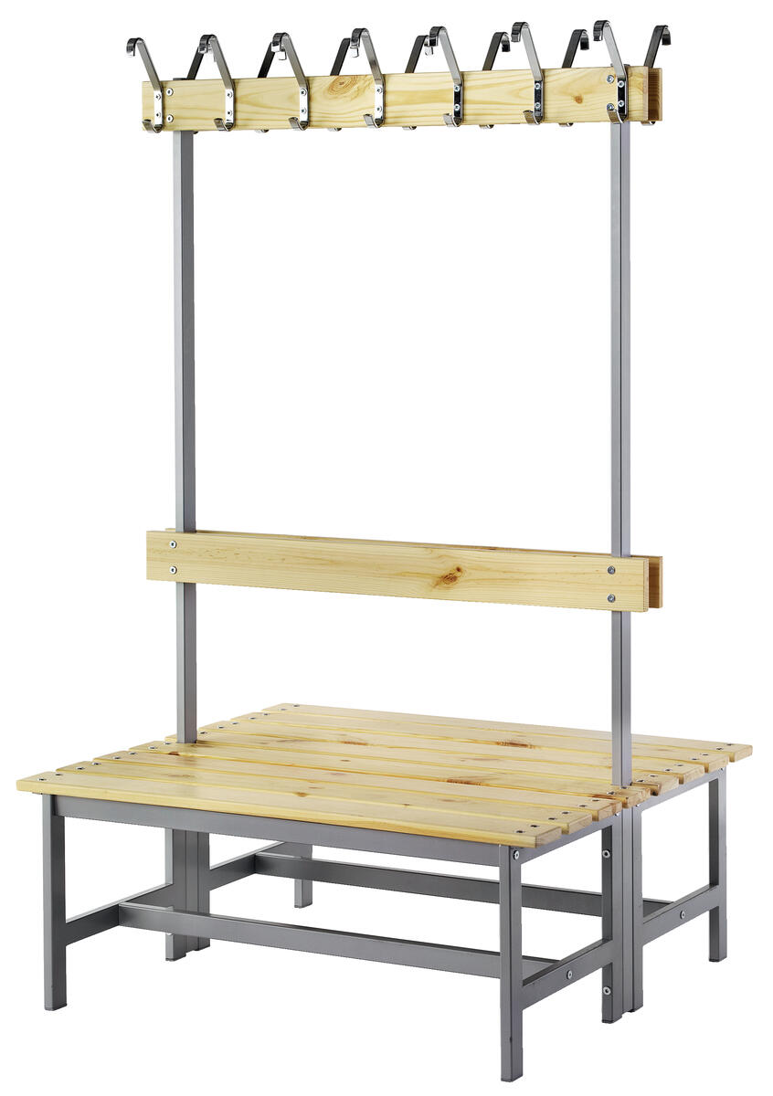 Tosidig garderobebenk og knaggrekke i klarlakkert furu. Stålstativ i sølvgrå RAL9006. 22 elforsinkete knagger, 11 på hver side. Sittehøyde 40 cm. Totaldybde 86,5 cm.