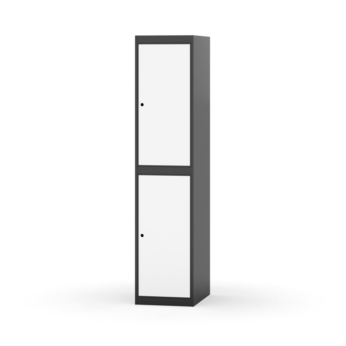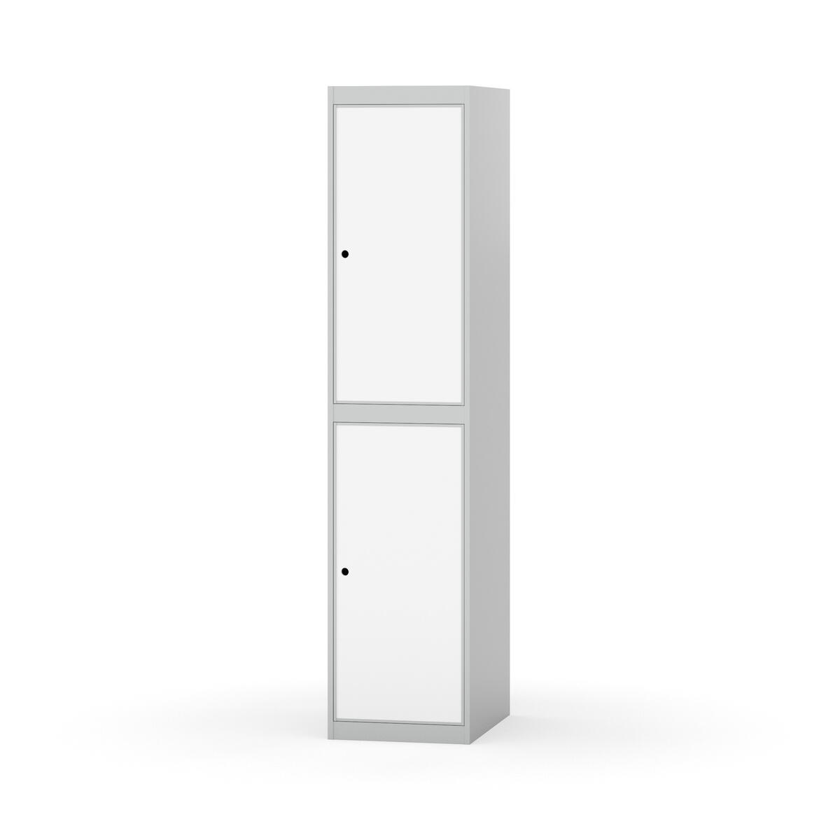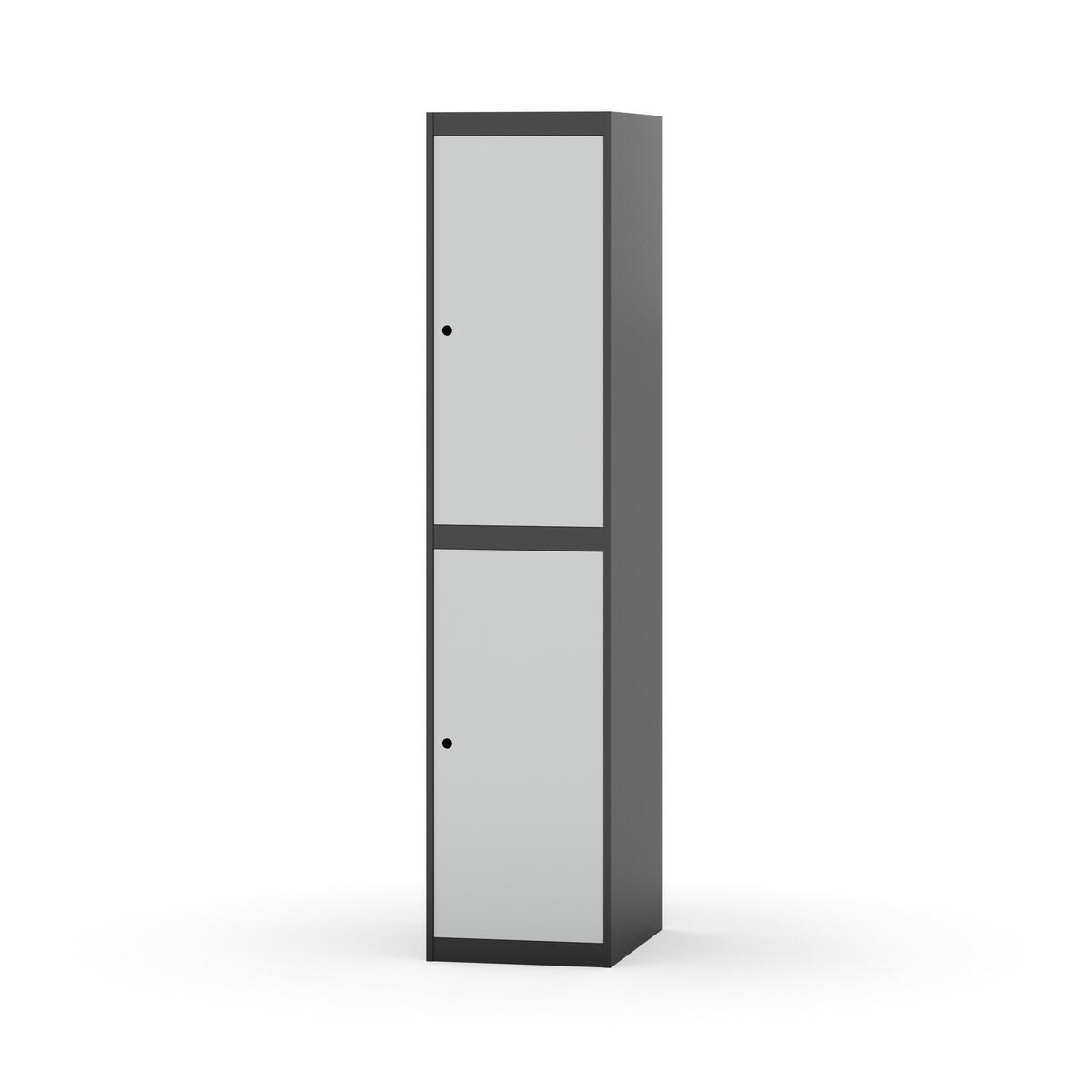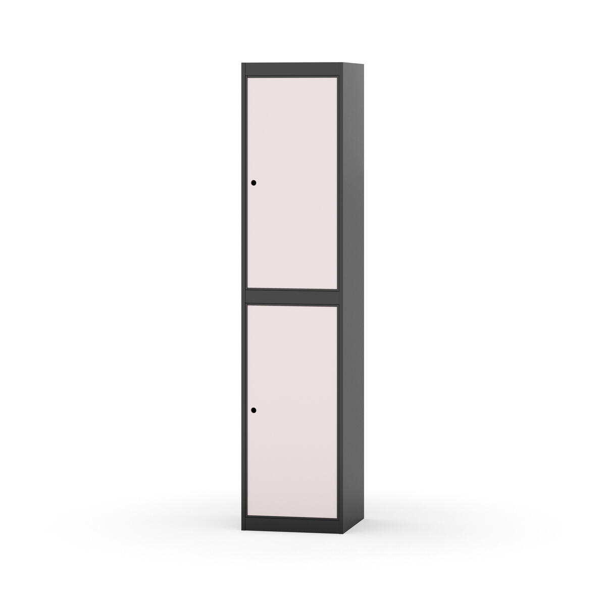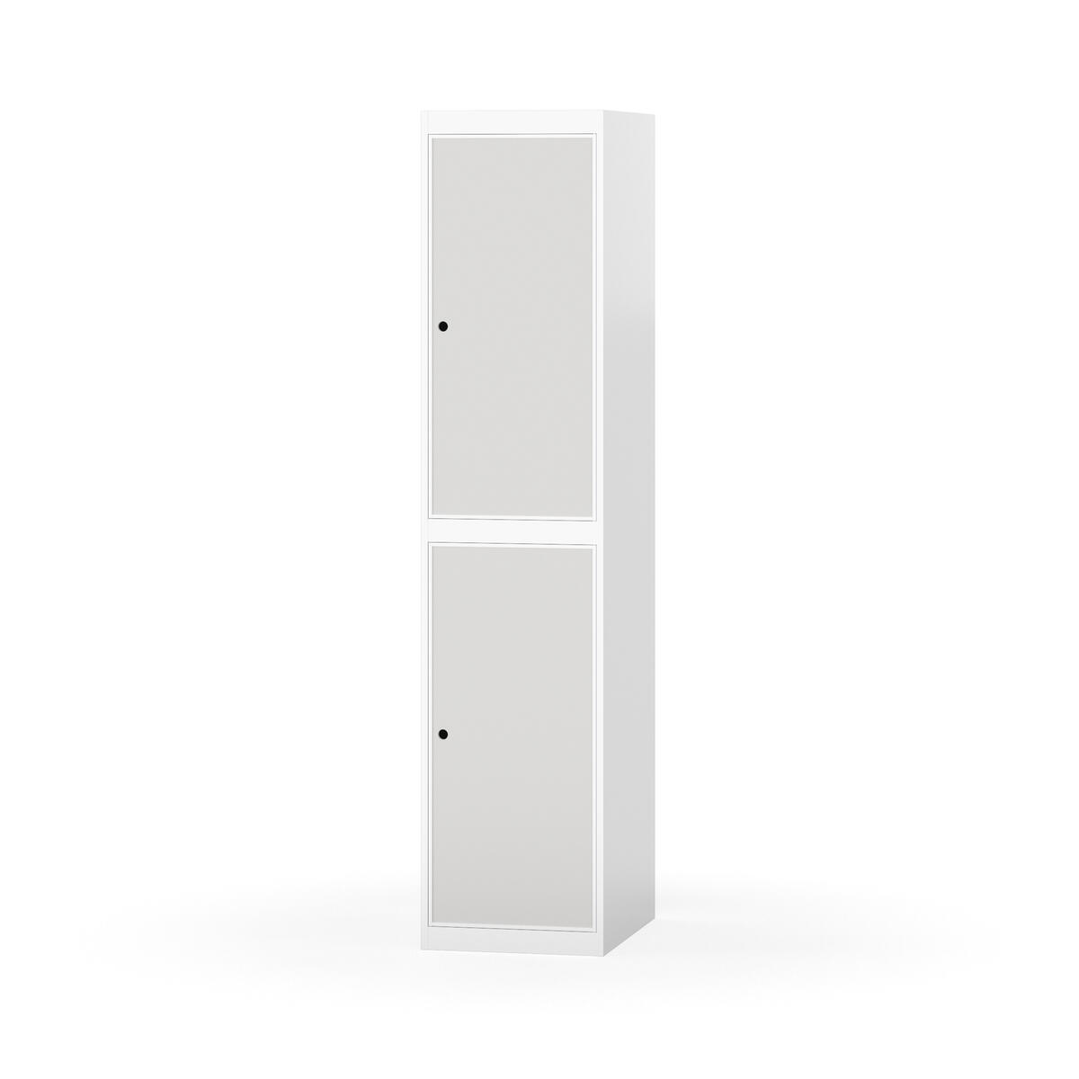 Garderobeskap med helsveiset stamme. Velg mellom dør i metall eller laminat. Metalldøren er utstyrt med dørstopper i stål og innfelt forsterkning rundt låsehullet. Laminatdøren er innfelt i stålramme utstyrt med dørstopper i stål. Dørene kan åpnes 90 grader. Interiør: Hylle og klesstang med to ankerkroker. Glatt gulvflate uten terskel. Ventilasjon gjennom hull i tak/bunnplate. - Vær oppmerksom på at lås/hasp for hengelås og sokkel/ben bestilles på egne artikkelnummer. Lås/hasp for hengelås vil da være montert på skap ved levering. Valgt understell monteres på stedet.