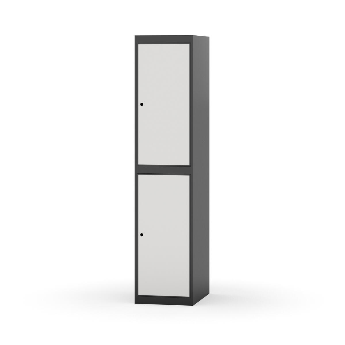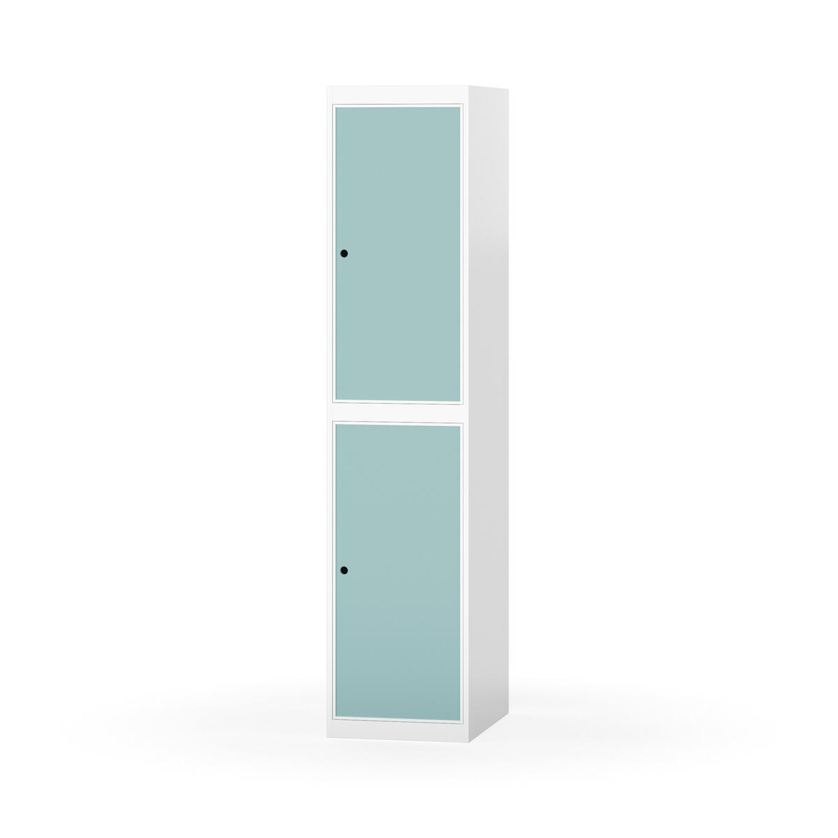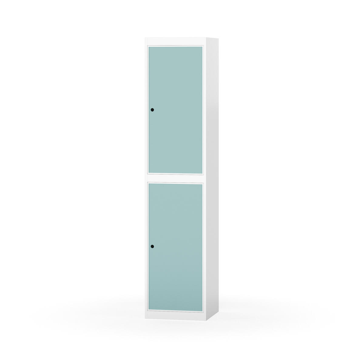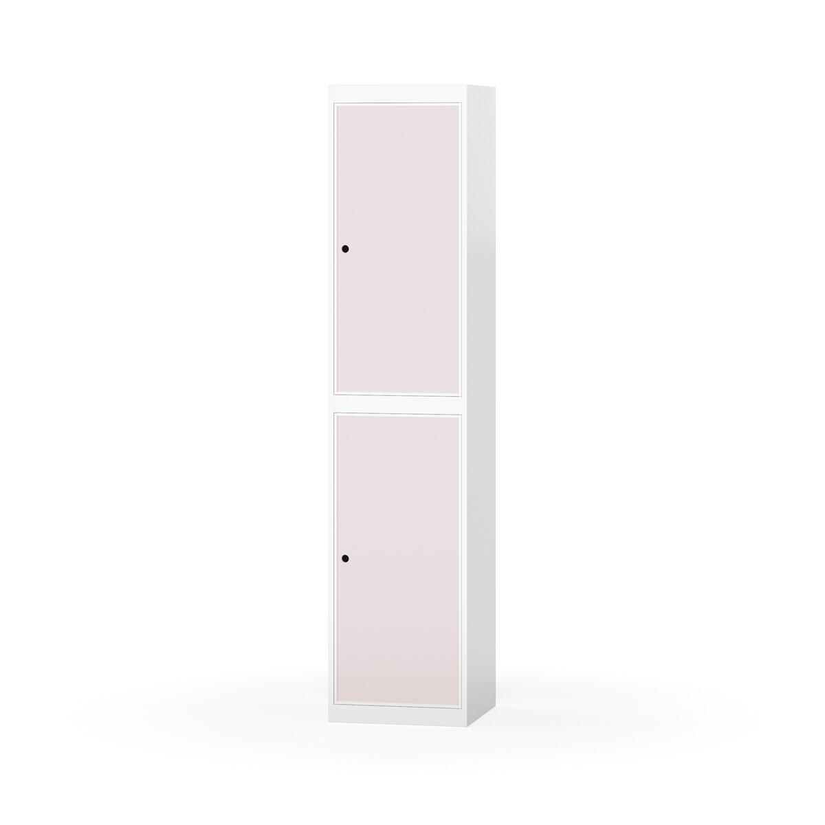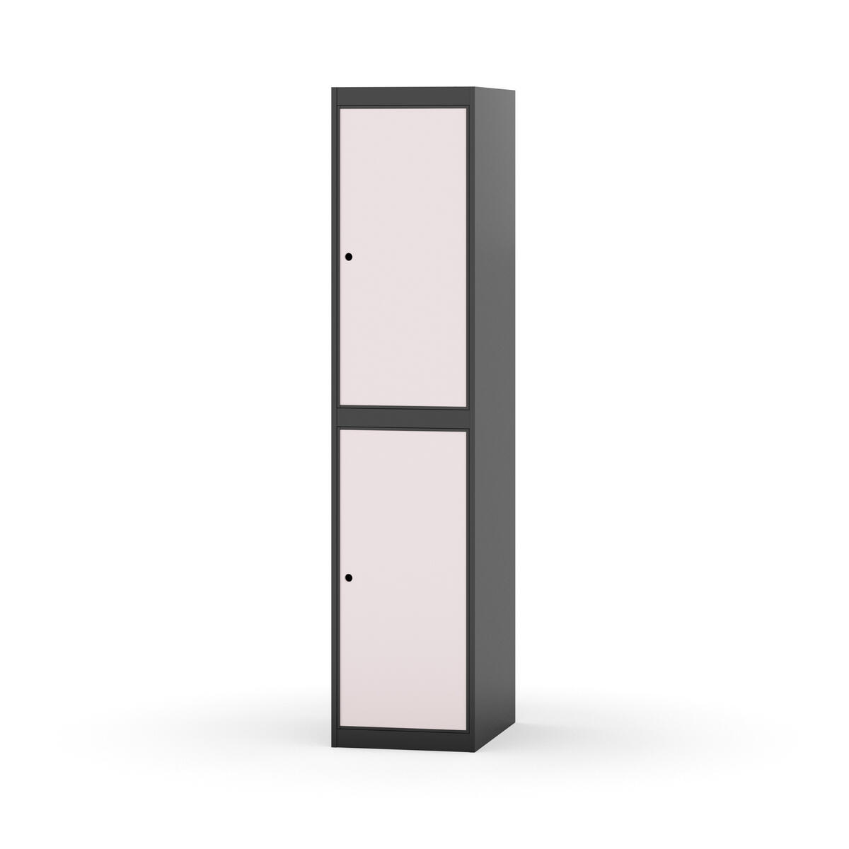 Garderobeskap med helsveiset stamme. Velg mellom dør i metall eller laminat. Metalldøren er utstyrt med dørstopper i stål og innfelt forsterkning rundt låsehullet. Laminatdøren er innfelt i stålramme utstyrt med dørstopper i stål. Dørene kan åpnes 90 grader. Interiør: Hylle og klesstang med to ankerkroker. Glatt gulvflate uten terskel. Ventilasjon gjennom hull i tak/bunnplate. - Vær oppmerksom på at lås/hasp for hengelås og sokkel/ben bestilles på egne artikkelnummer. Lås/hasp for hengelås vil da være montert på skap ved levering. Valgt understell monteres på stedet.