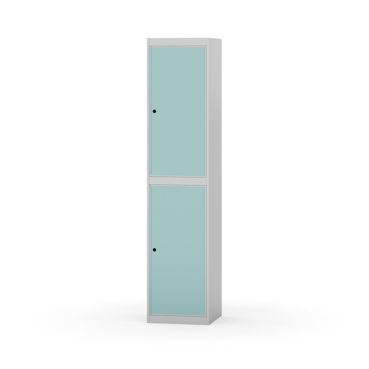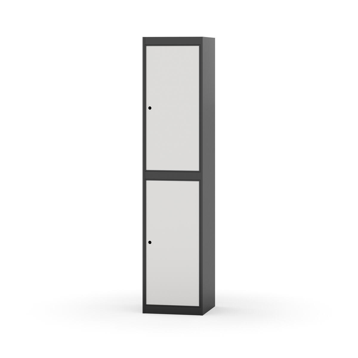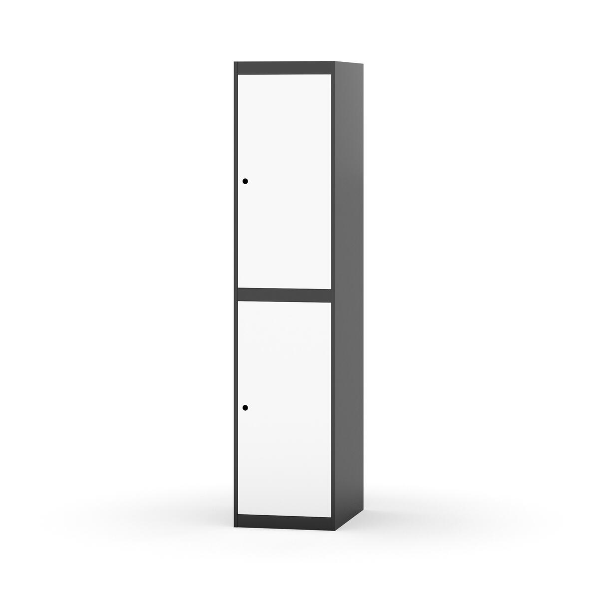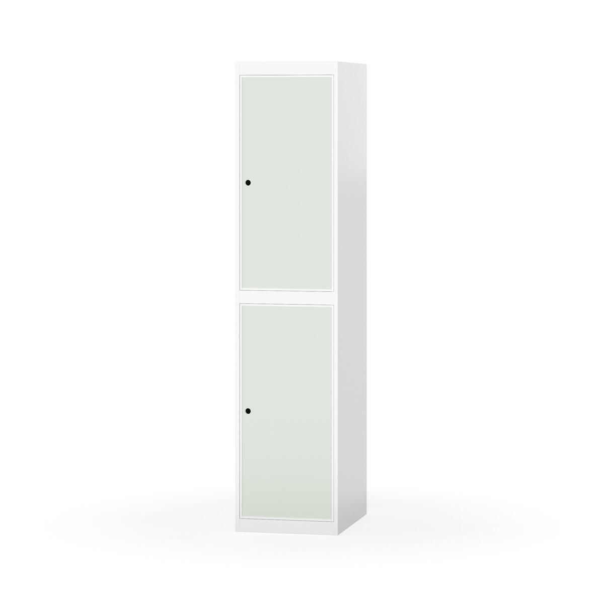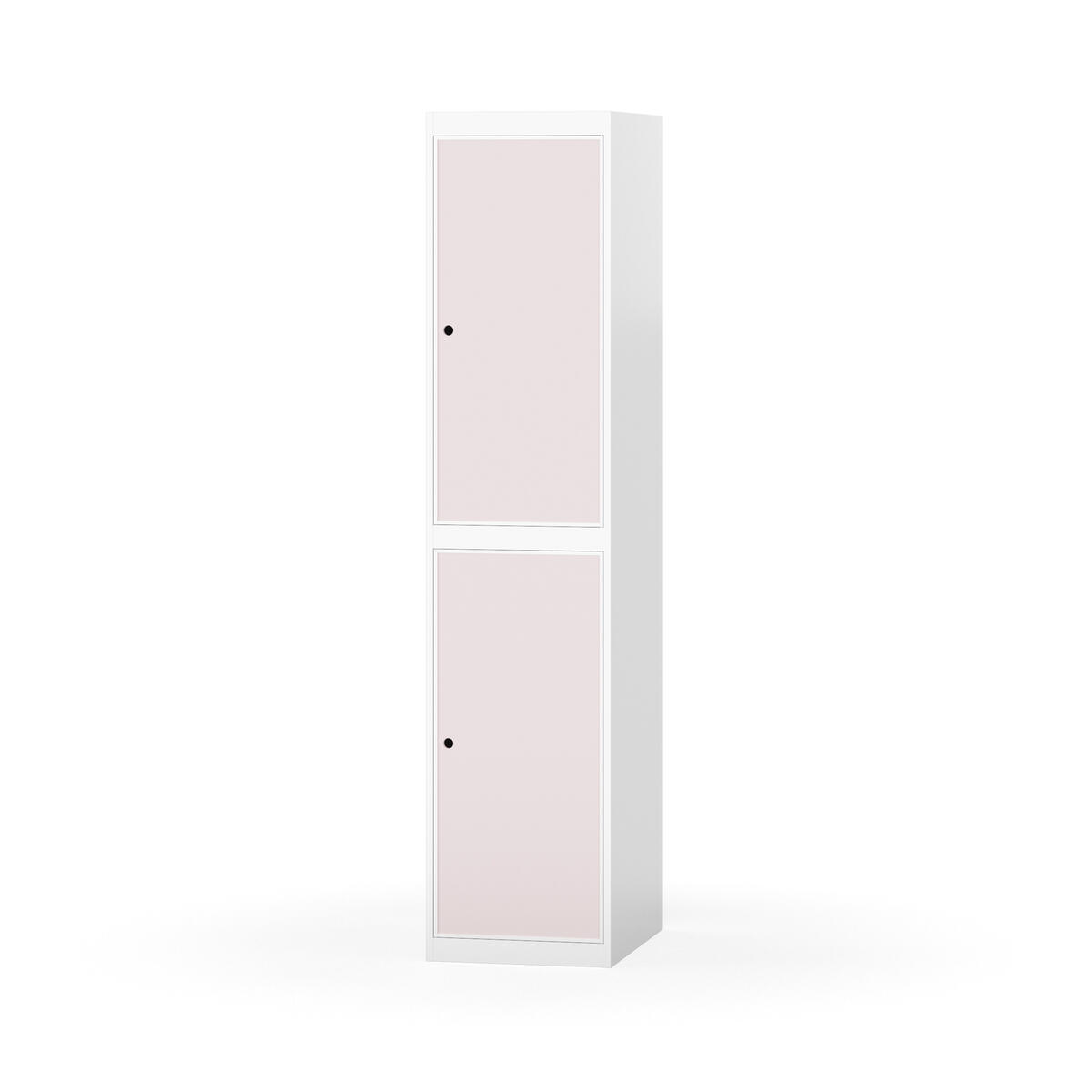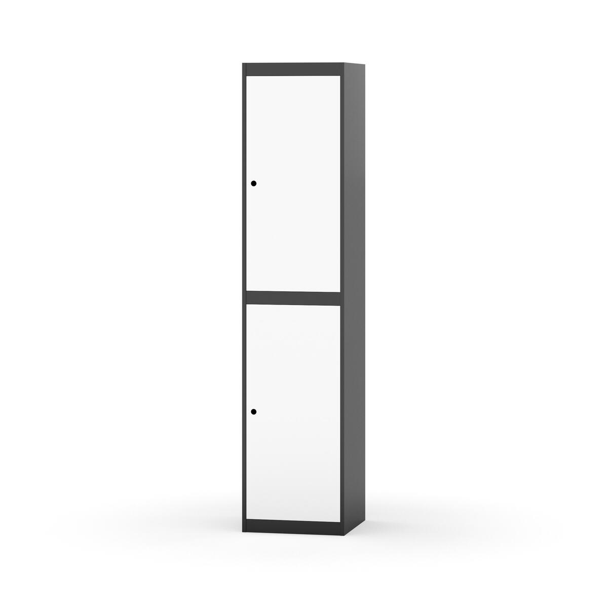 Garderobeskap med helsveiset stamme. Velg mellom dør i metall eller laminat. Metalldøren er utstyrt med dørstopper i stål og innfelt forsterkning rundt låsehullet. Laminatdøren er innfelt i stålramme utstyrt med dørstopper i stål. Dørene kan åpnes 90 grader. Interiør: Hylle og klesstang med to ankerkroker. Glatt gulvflate uten terskel. Ventilasjon gjennom hull i tak/bunnplate. - Vær oppmerksom på at lås/hasp for hengelås og sokkel/ben bestilles på egne artikkelnummer. Lås/hasp for hengelås vil da være montert på skap ved levering. Valgt understell monteres på stedet.