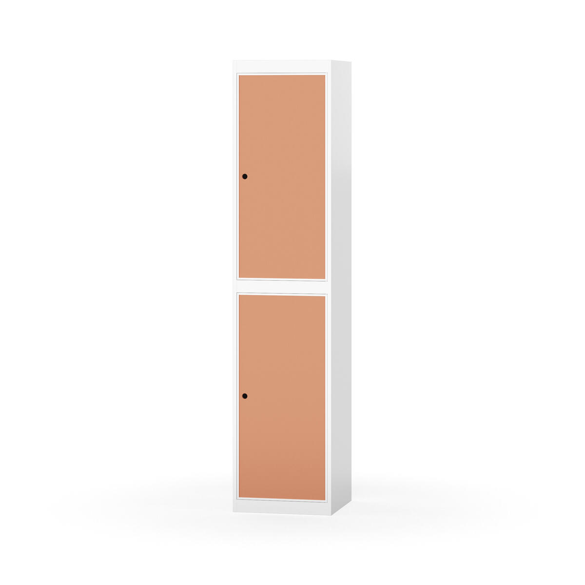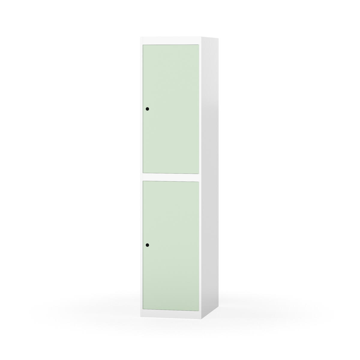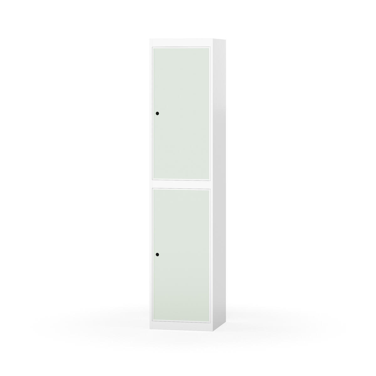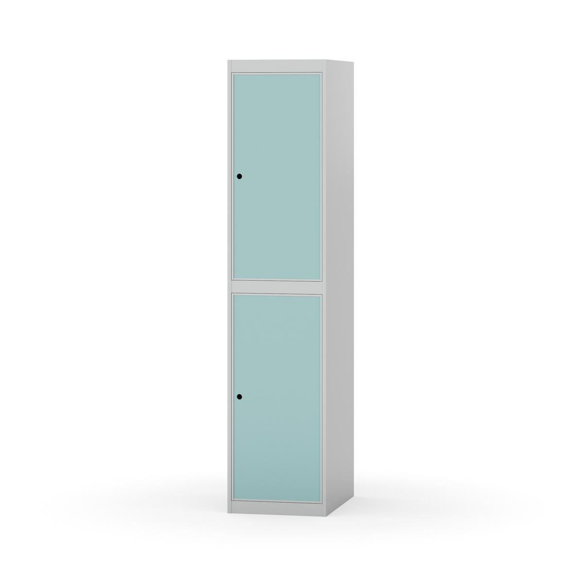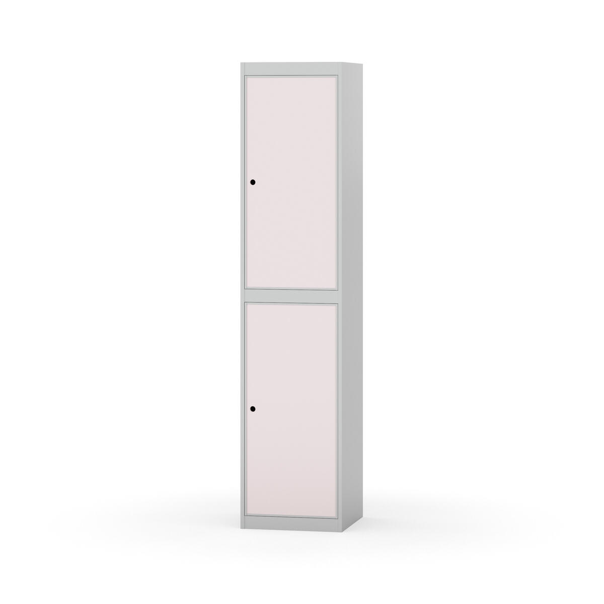 Garderobeskap med helsveiset stamme. Velg mellom dør i metall eller laminat. Metalldøren er utstyrt med dørstopper i stål og innfelt forsterkning rundt låsehullet. Laminatdøren er innfelt i stålramme utstyrt med dørstopper i stål. Dørene kan åpnes 90 grader. Interiør: Hylle og klesstang med to ankerkroker. Glatt gulvflate uten terskel. Ventilasjon gjennom hull i tak/bunnplate. - Vær oppmerksom på at lås/hasp for hengelås og sokkel/ben bestilles på egne artikkelnummer. Lås/hasp for hengelås vil da være montert på skap ved levering. Valgt understell monteres på stedet.