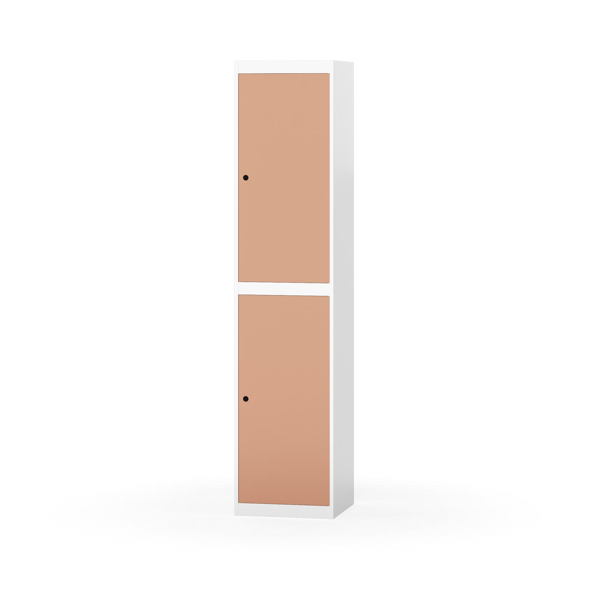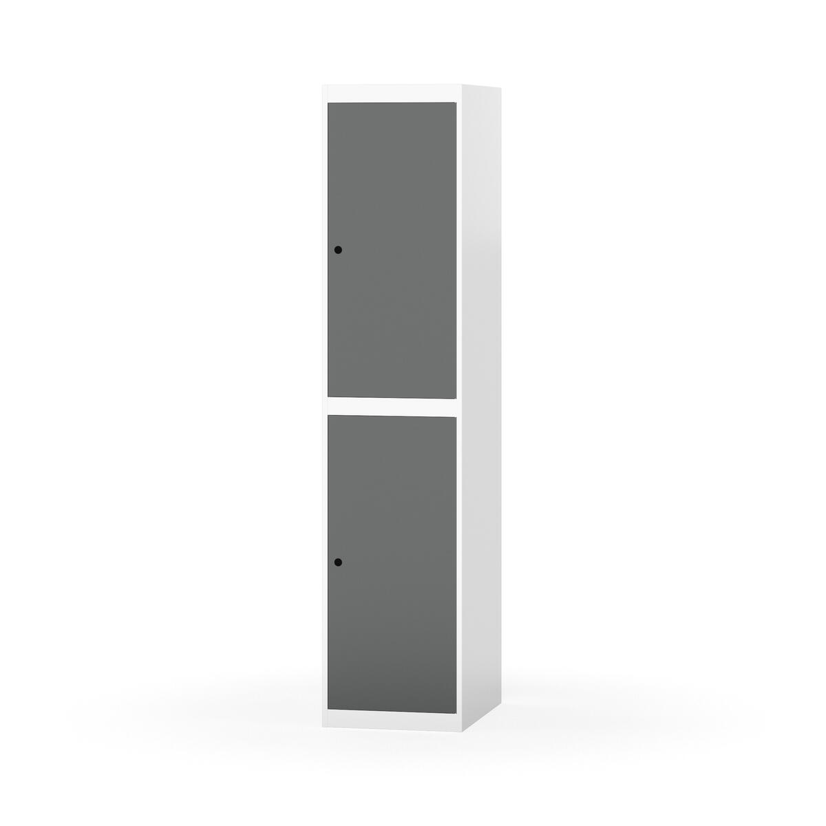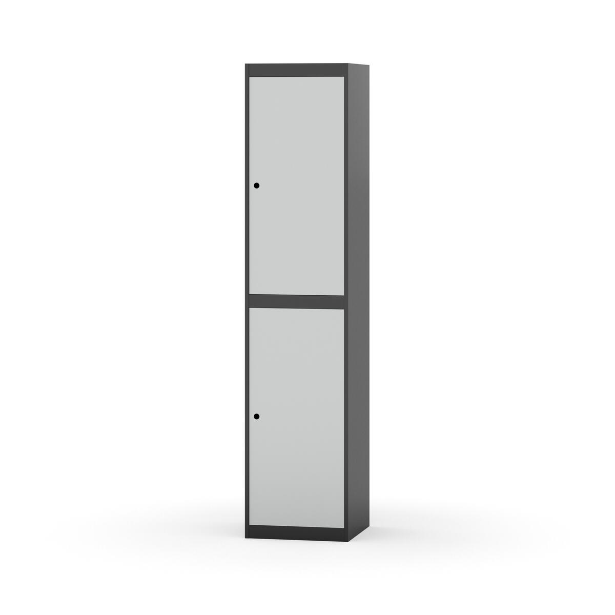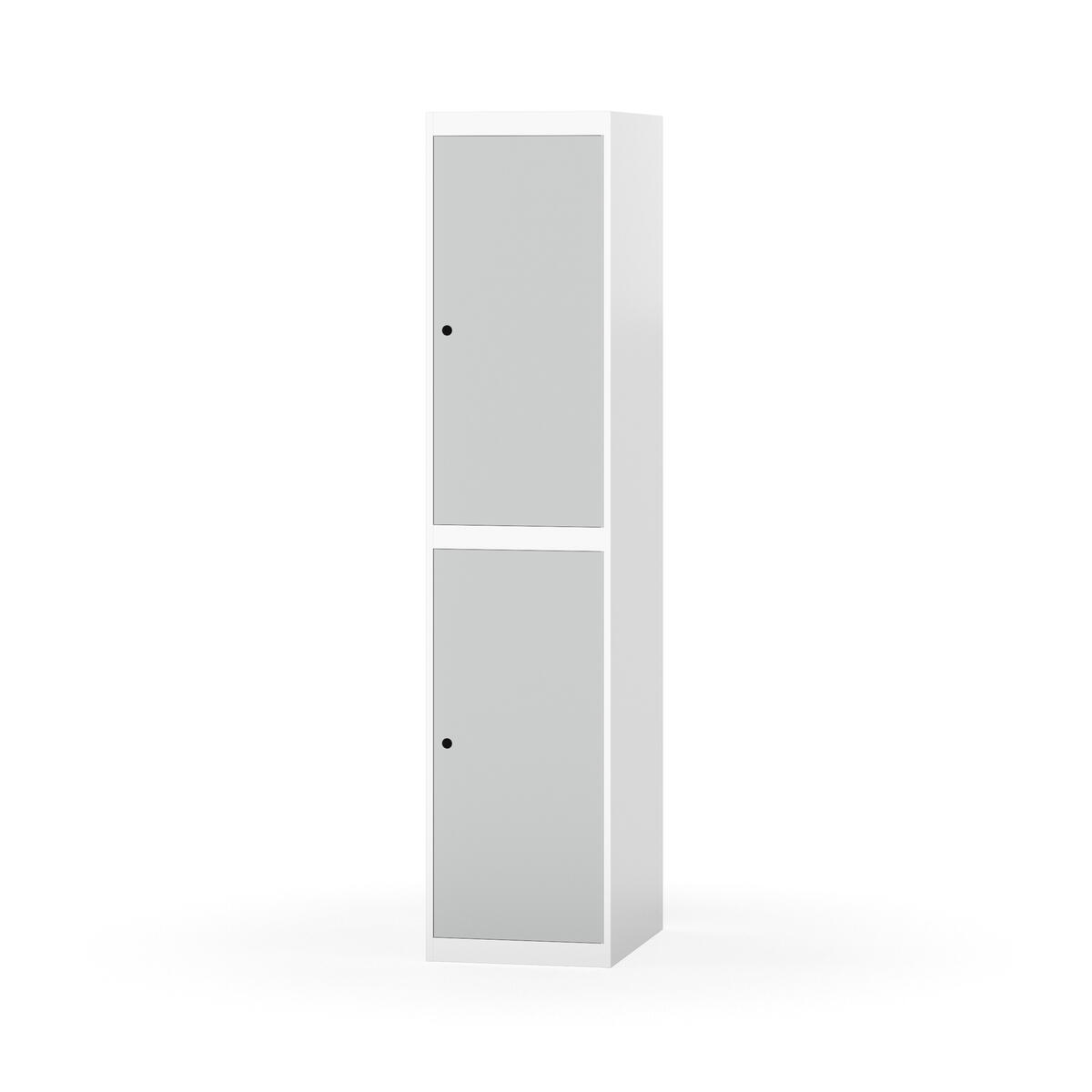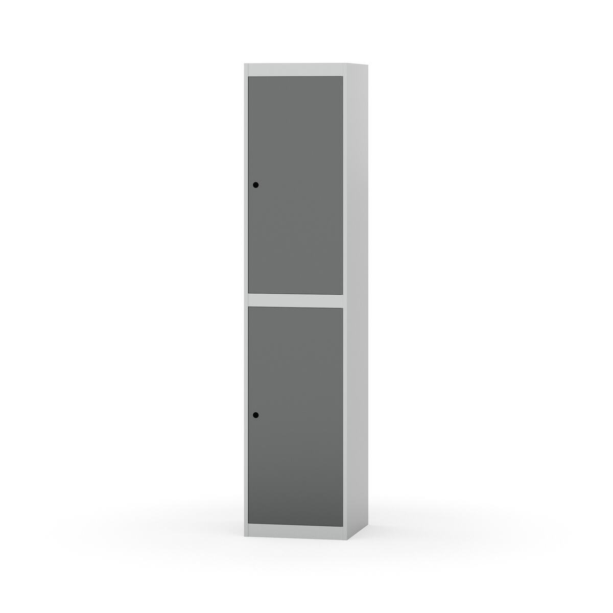 Garderobeskap med helsveiset stamme. Velg mellom dør i metall eller laminat. Metalldøren er utstyrt med dørstopper i stål og innfelt forsterkning rundt låsehullet. Laminatdøren er innfelt i stålramme utstyrt med dørstopper i stål. Dørene kan åpnes 90 grader. Interiør: Hylle og klesstang med to ankerkroker. Glatt gulvflate uten terskel. Ventilasjon gjennom hull i tak/bunnplate. - Vær oppmerksom på at lås/hasp for hengelås og sokkel/ben bestilles på egne artikkelnummer. Lås/hasp for hengelås vil da være montert på skap ved levering. Valgt understell monteres på stedet.