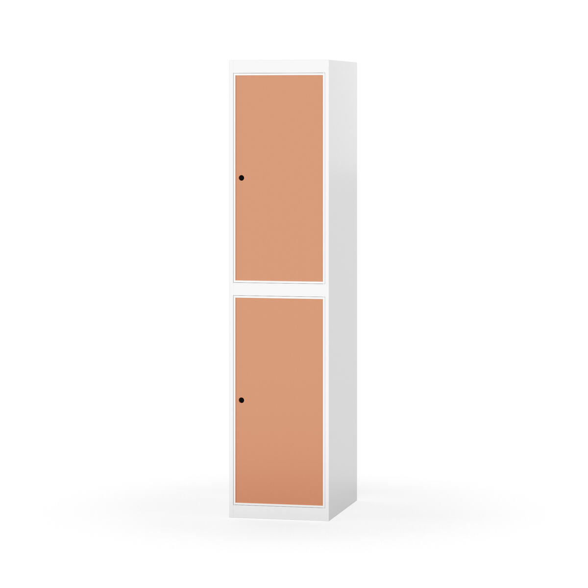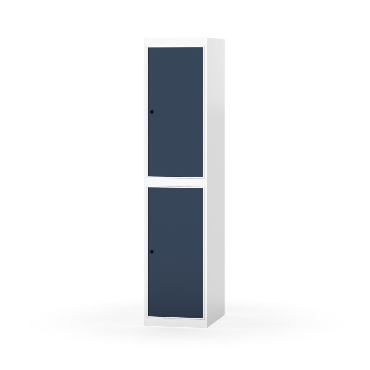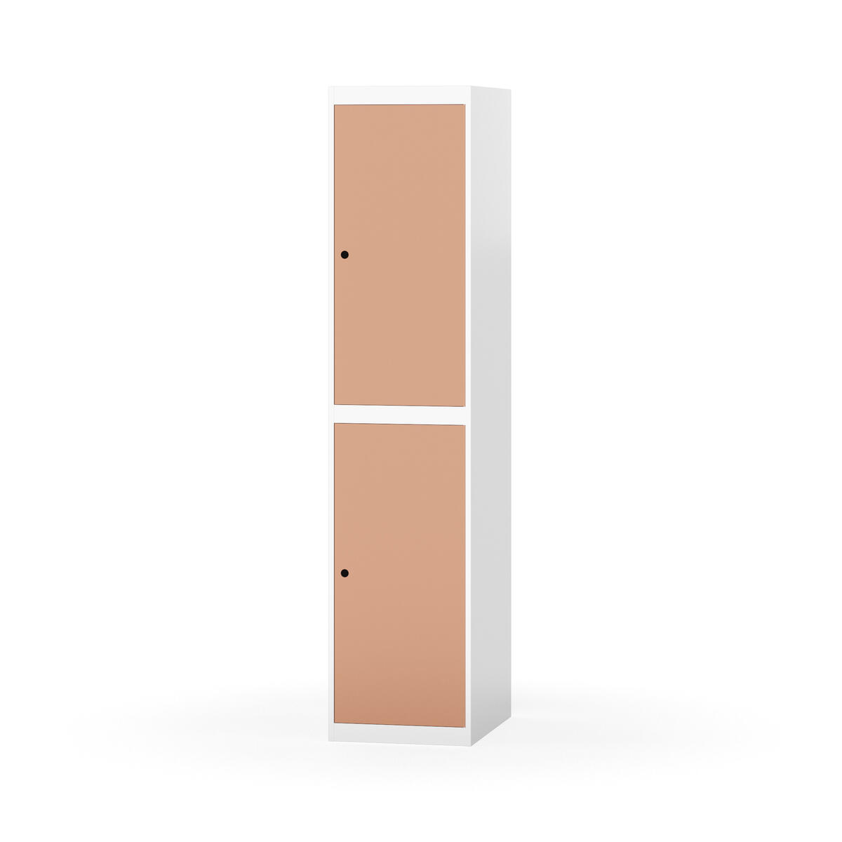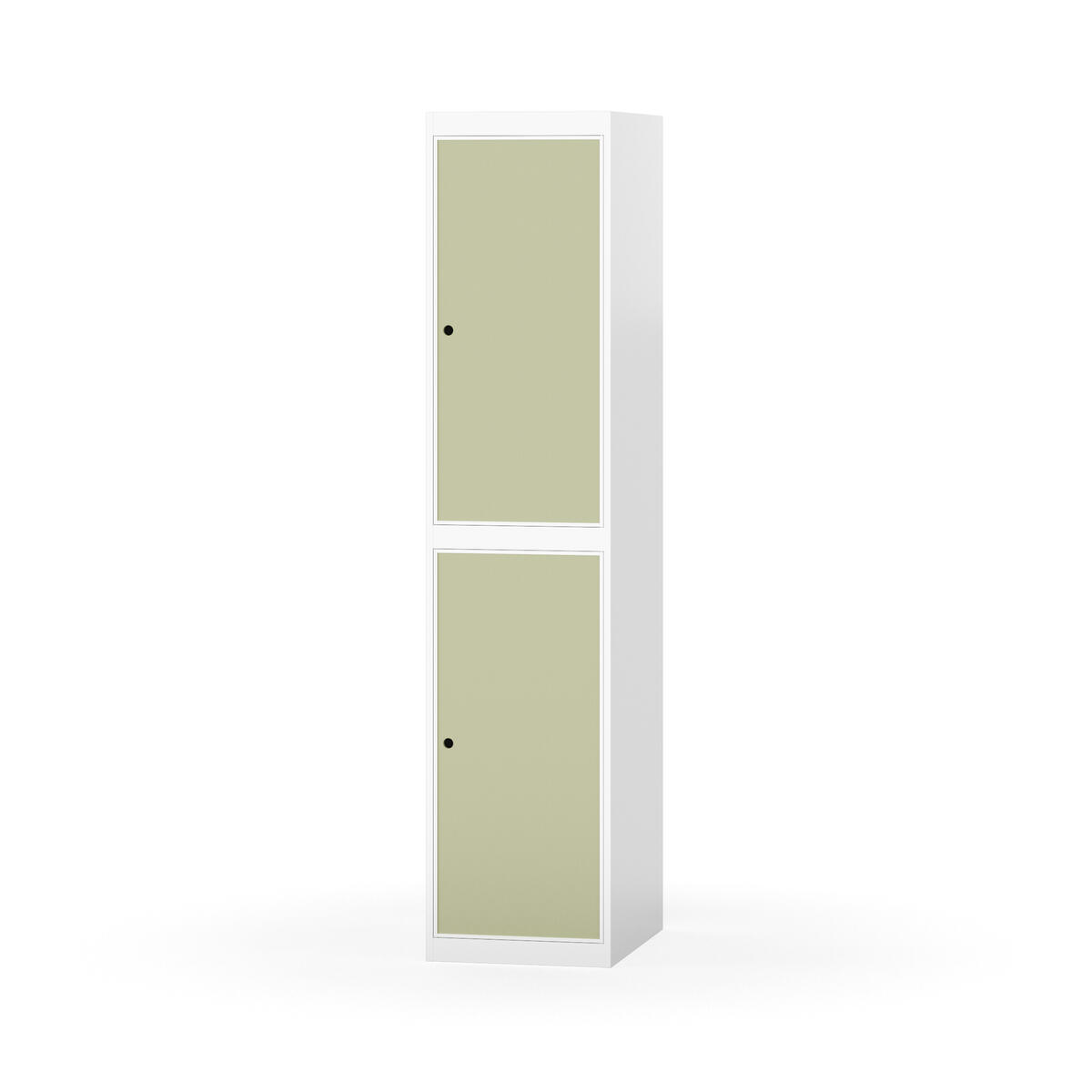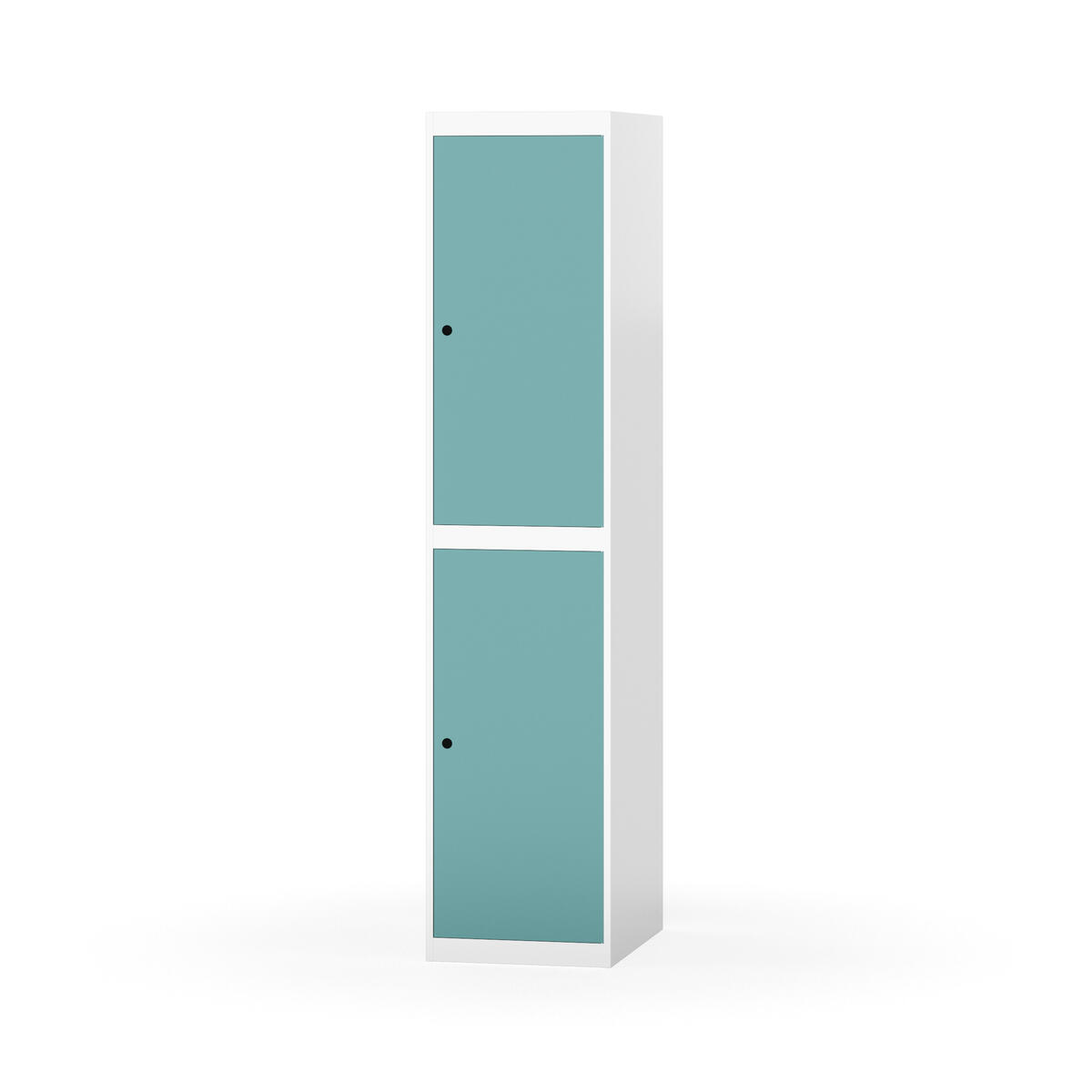 Garderobeskap med helsveiset stamme. Velg mellom dør i metall eller laminat. Metalldøren er utstyrt med dørstopper i stål og innfelt forsterkning rundt låsehullet. Laminatdøren er innfelt i stålramme utstyrt med dørstopper i stål. Dørene kan åpnes 90 grader. Interiør: Hylle og klesstang med to ankerkroker. Glatt gulvflate uten terskel. Ventilasjon gjennom hull i tak/bunnplate. - Vær oppmerksom på at lås/hasp for hengelås og sokkel/ben bestilles på egne artikkelnummer. Lås/hasp for hengelås vil da være montert på skap ved levering. Valgt understell monteres på stedet.