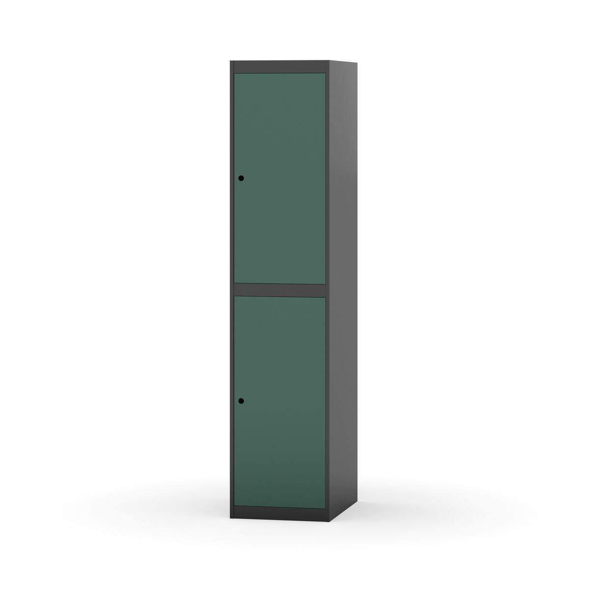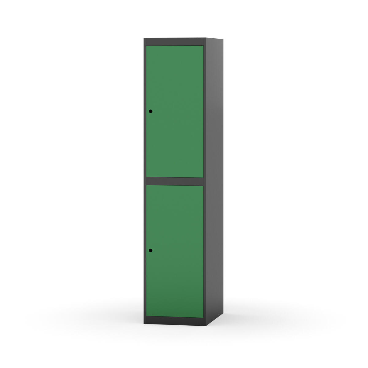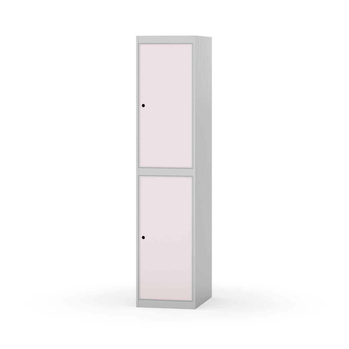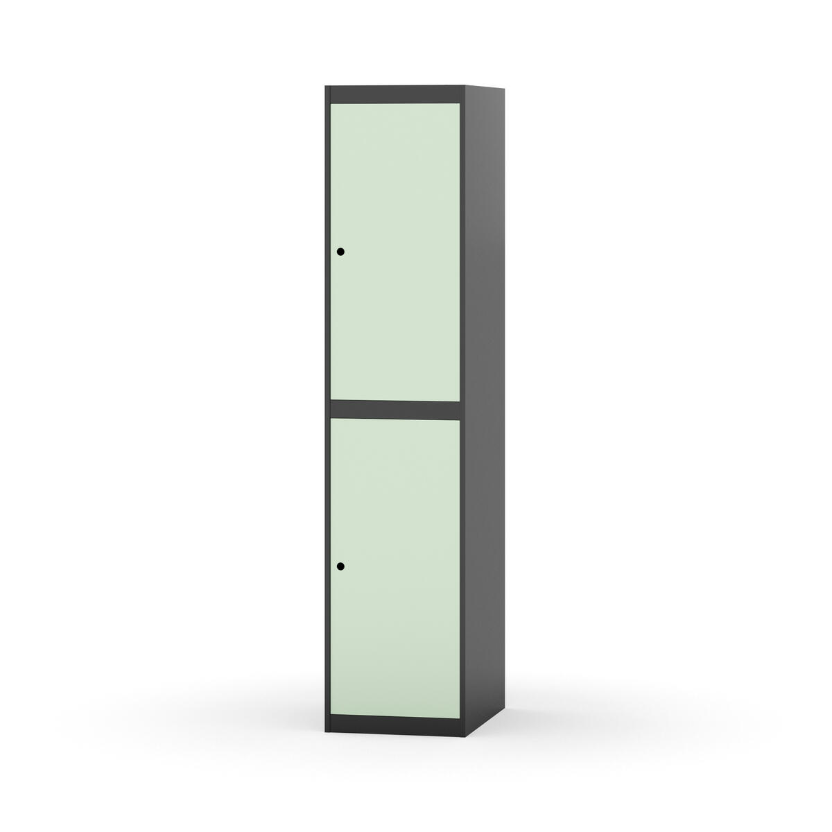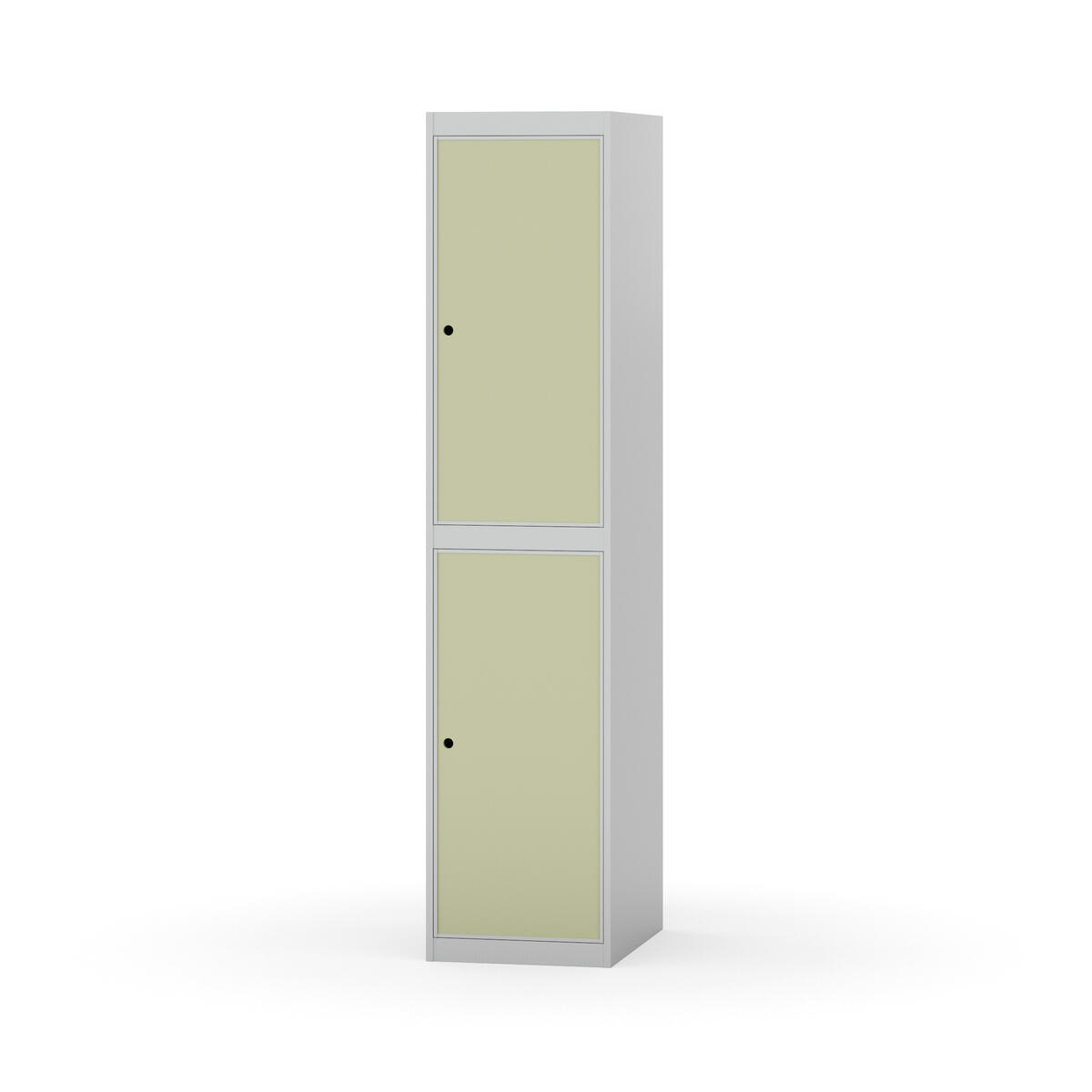 Garderobeskap med helsveiset stamme. Velg mellom dør i metall eller laminat. Metalldøren er utstyrt med dørstopper i stål og innfelt forsterkning rundt låsehullet. Laminatdøren er innfelt i stålramme utstyrt med dørstopper i stål. Dørene kan åpnes 90 grader. Interiør: Hylle og klesstang med to ankerkroker. Glatt gulvflate uten terskel. Ventilasjon gjennom hull i tak/bunnplate. - Vær oppmerksom på at lås/hasp for hengelås og sokkel/ben bestilles på egne artikkelnummer. Lås/hasp for hengelås vil da være montert på skap ved levering. Valgt understell monteres på stedet.