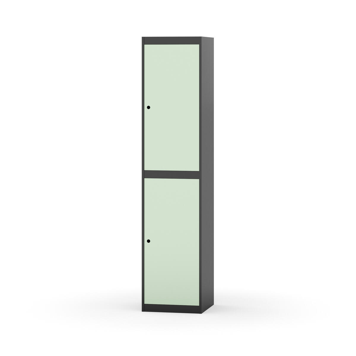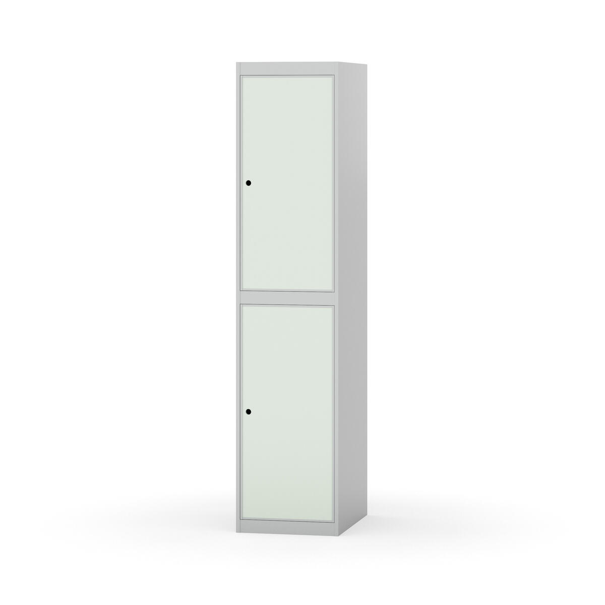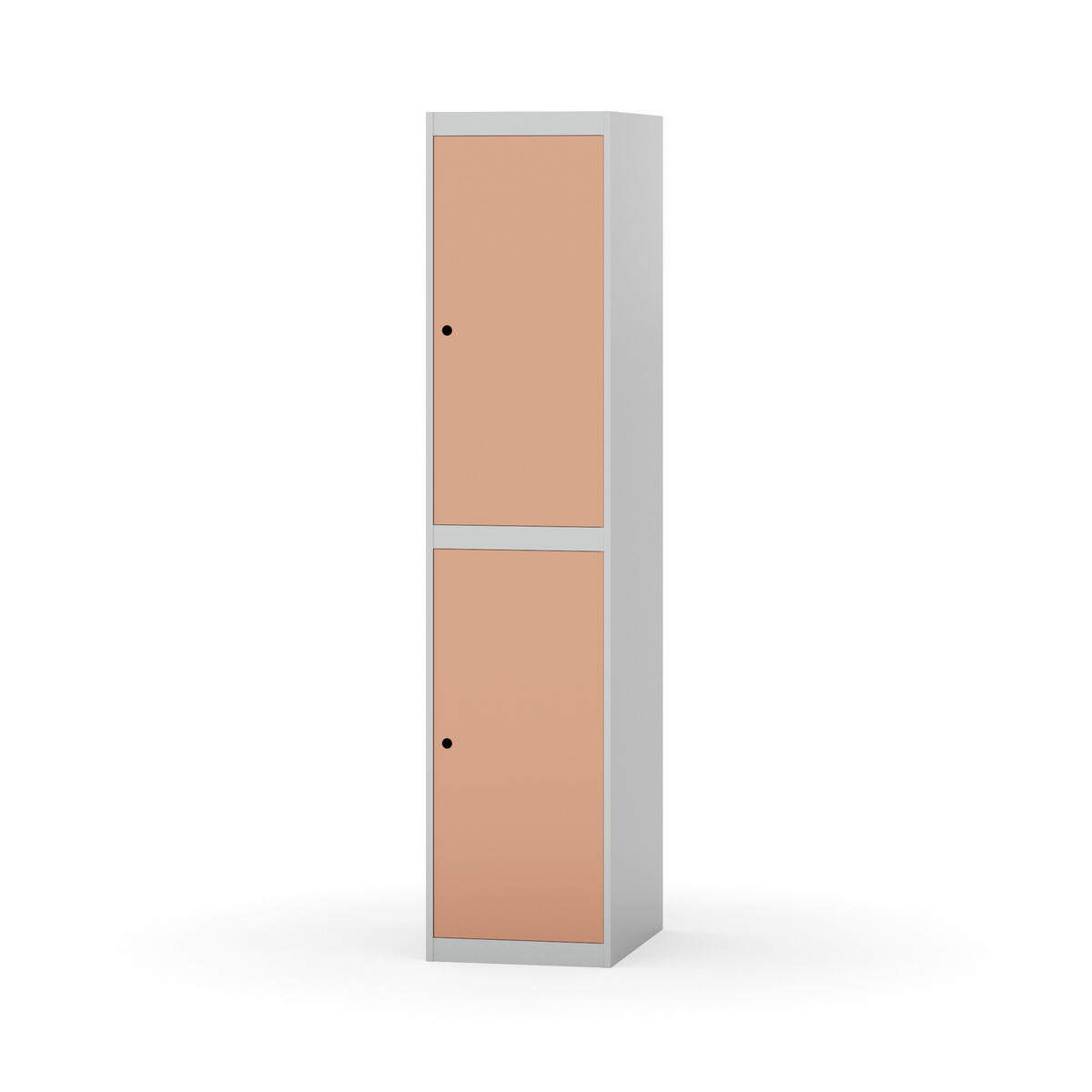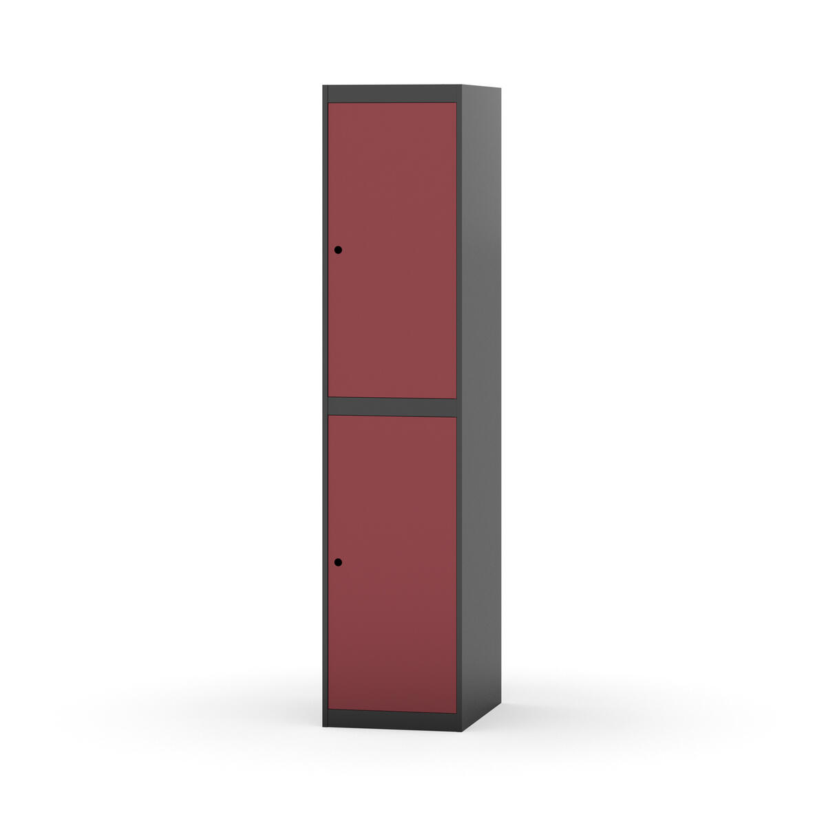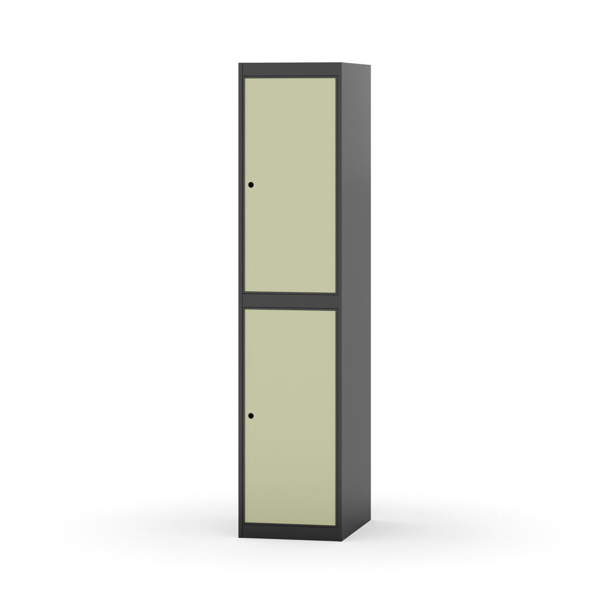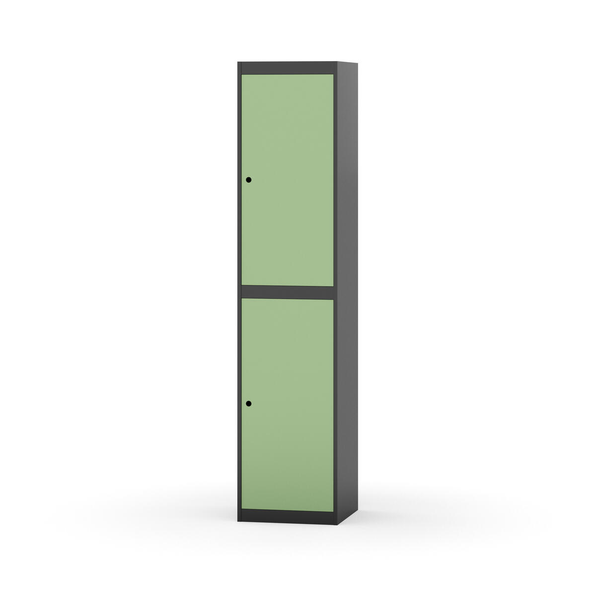 Garderobeskap med helsveiset stamme. Velg mellom dør i metall eller laminat. Metalldøren er utstyrt med dørstopper i stål og innfelt forsterkning rundt låsehullet. Laminatdøren er innfelt i stålramme utstyrt med dørstopper i stål. Dørene kan åpnes 90 grader. Interiør: Hylle og klesstang med to ankerkroker. Glatt gulvflate uten terskel. Ventilasjon gjennom hull i tak/bunnplate. - Vær oppmerksom på at lås/hasp for hengelås og sokkel/ben bestilles på egne artikkelnummer. Lås/hasp for hengelås vil da være montert på skap ved levering. Valgt understell monteres på stedet.