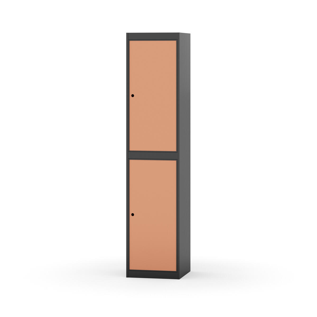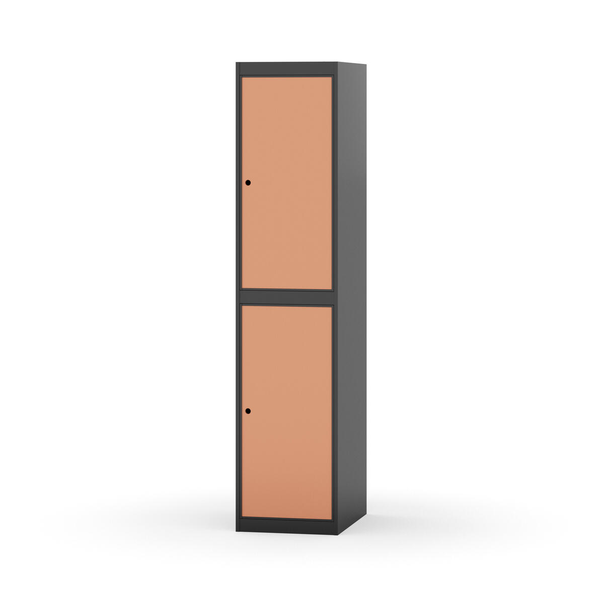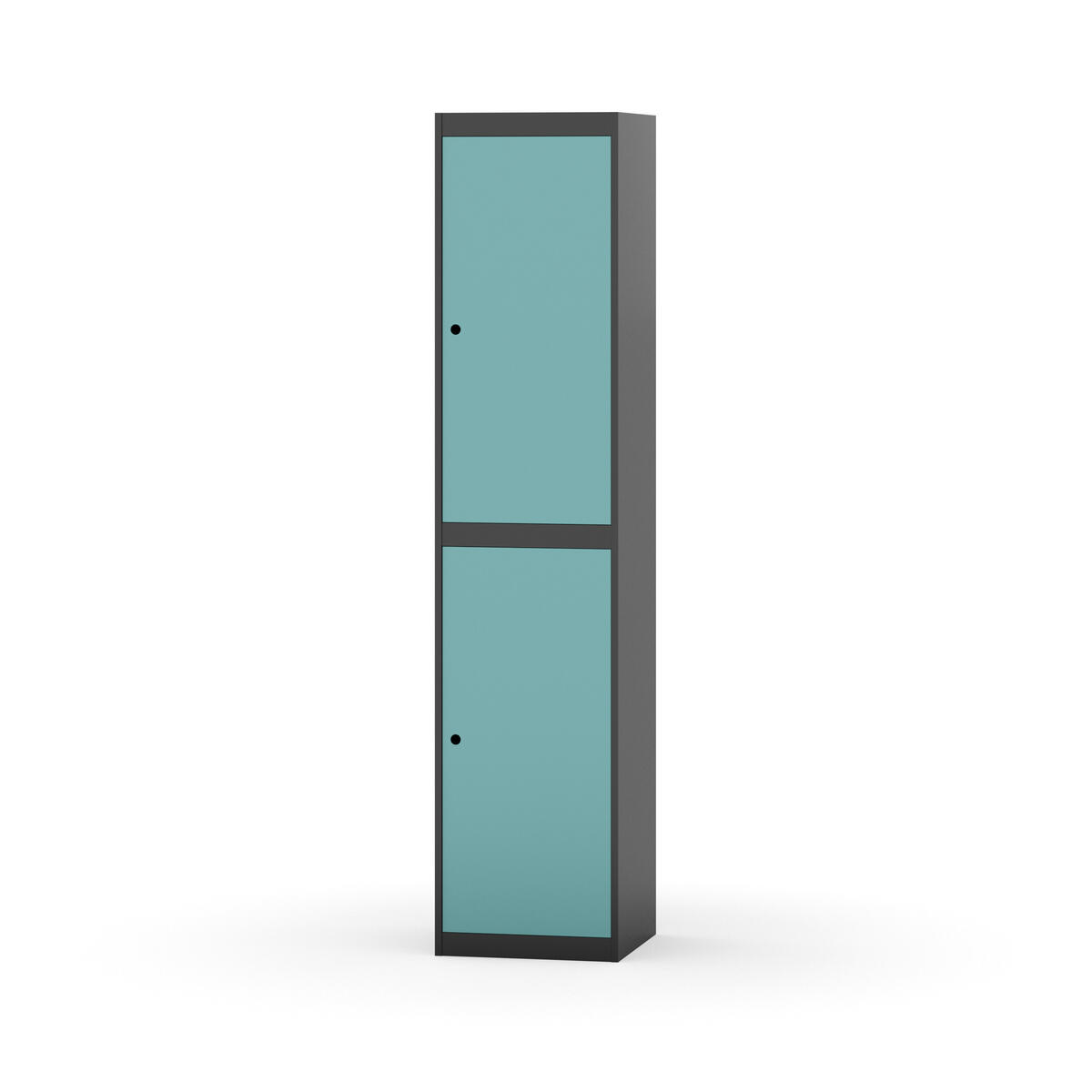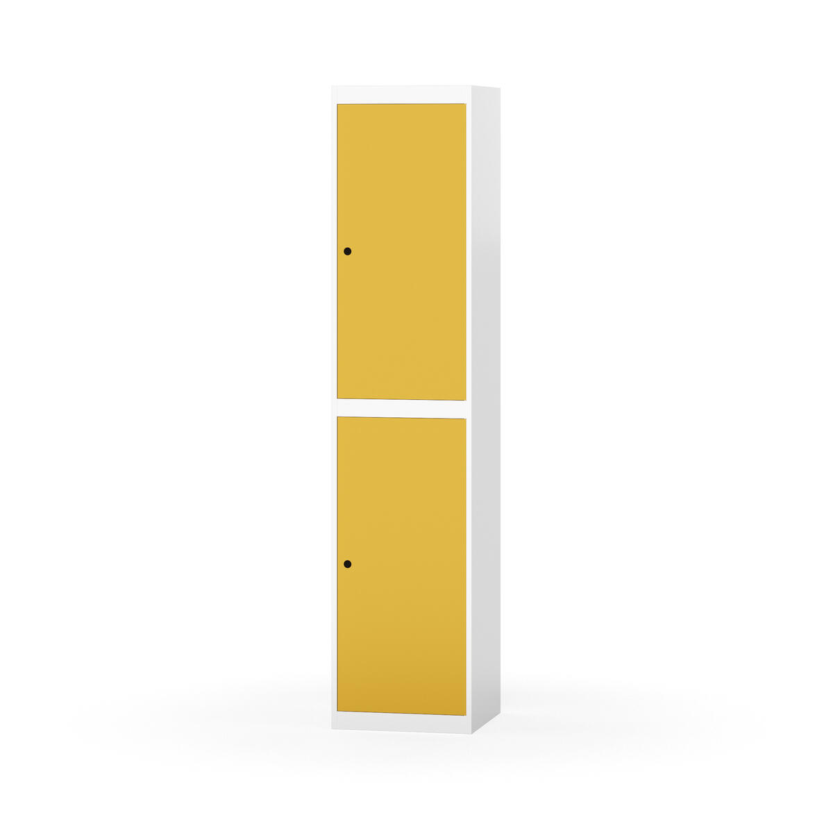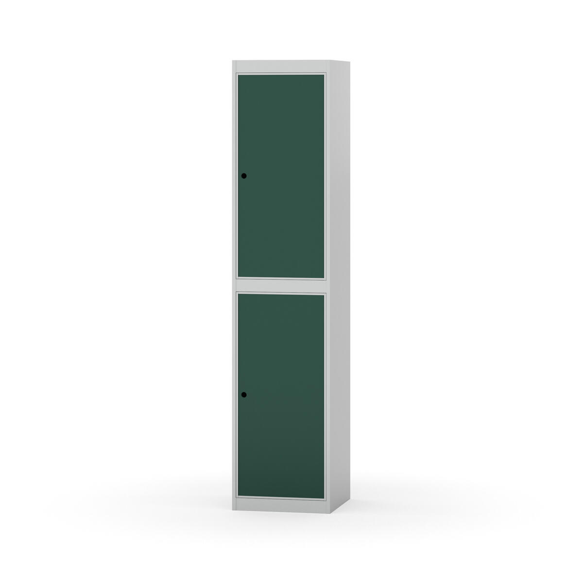 Garderobeskap med helsveiset stamme. Velg mellom dør i metall eller laminat. Metalldøren er utstyrt med dørstopper i stål og innfelt forsterkning rundt låsehullet. Laminatdøren er innfelt i stålramme utstyrt med dørstopper i stål. Dørene kan åpnes 90 grader. Interiør: Hylle og klesstang med to ankerkroker. Glatt gulvflate uten terskel. Ventilasjon gjennom hull i tak/bunnplate. - Vær oppmerksom på at lås/hasp for hengelås og sokkel/ben bestilles på egne artikkelnummer. Lås/hasp for hengelås vil da være montert på skap ved levering. Valgt understell monteres på stedet.