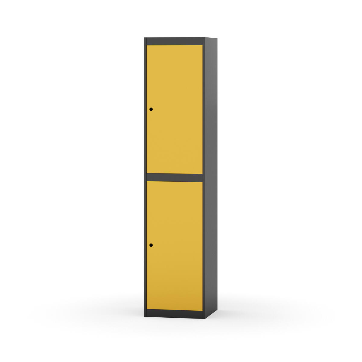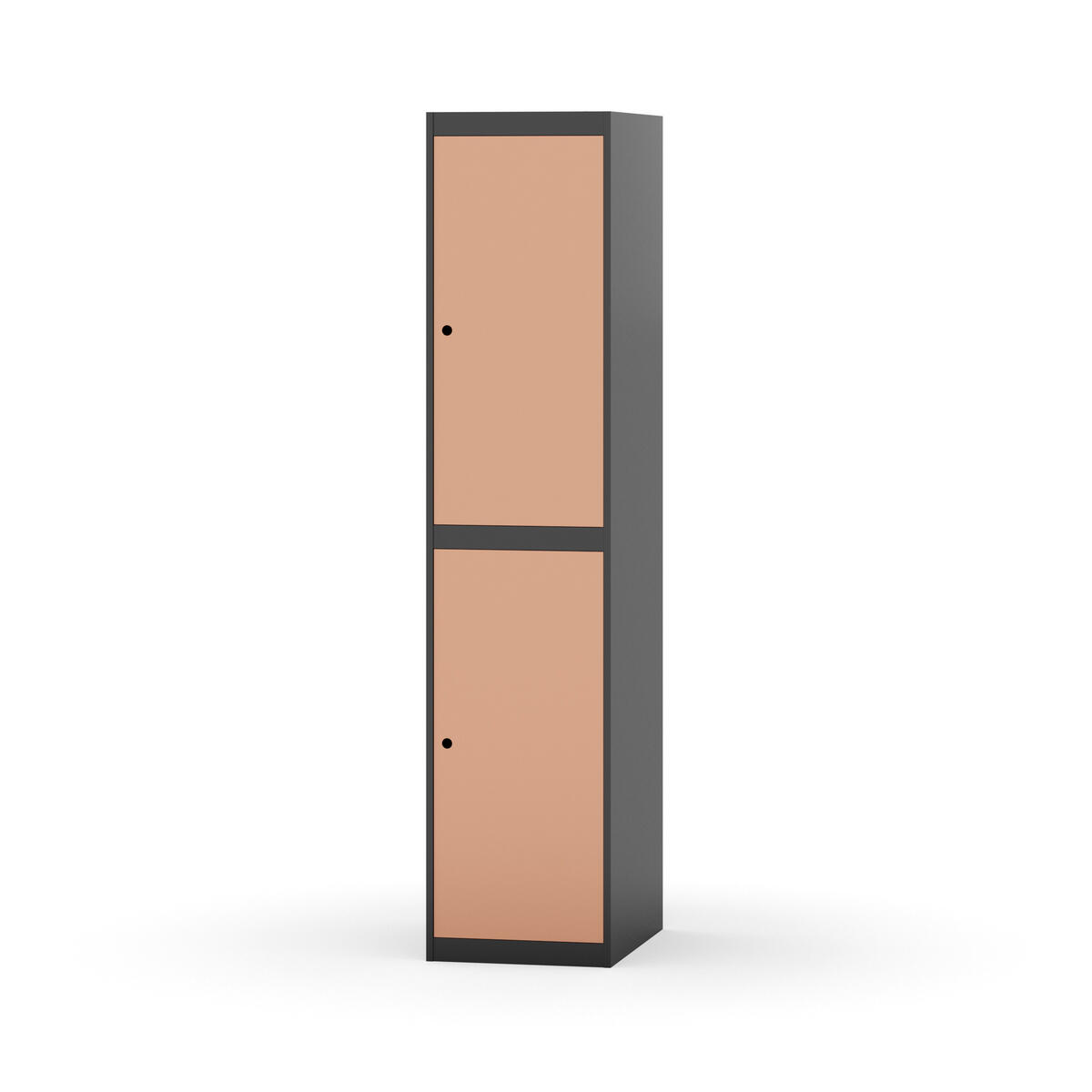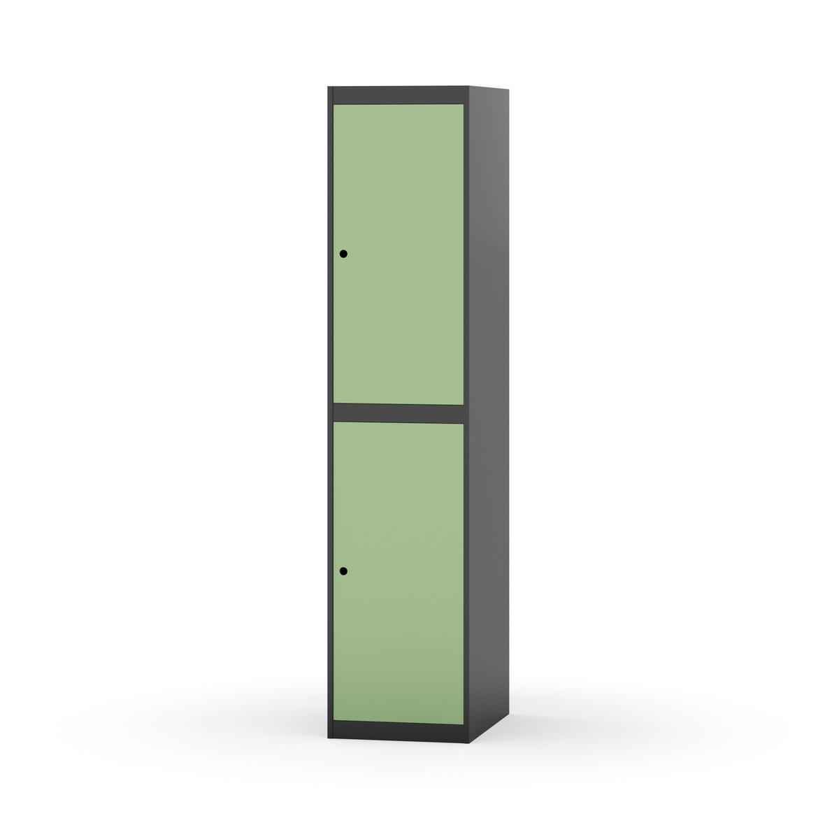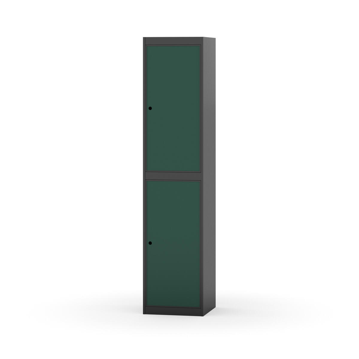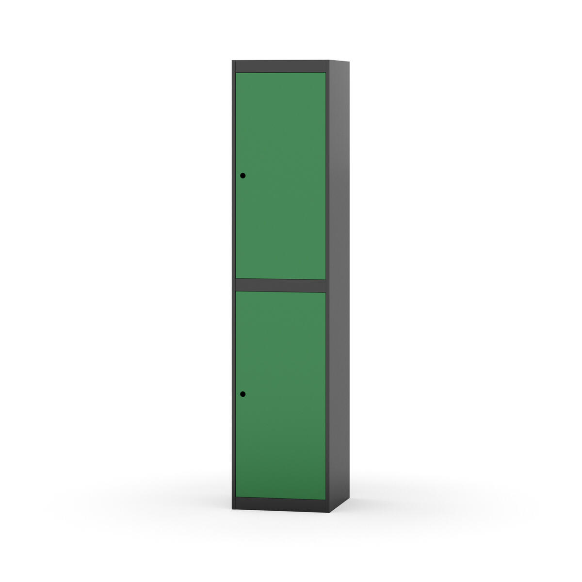 Garderobeskap med helsveiset stamme. Velg mellom dør i metall eller laminat. Metalldøren er utstyrt med dørstopper i stål og innfelt forsterkning rundt låsehullet. Laminatdøren er innfelt i stålramme utstyrt med dørstopper i stål. Dørene kan åpnes 90 grader. Interiør: Hylle og klesstang med to ankerkroker. Glatt gulvflate uten terskel. Ventilasjon gjennom hull i tak/bunnplate. - Vær oppmerksom på at lås/hasp for hengelås og sokkel/ben bestilles på egne artikkelnummer. Lås/hasp for hengelås vil da være montert på skap ved levering. Valgt understell monteres på stedet.