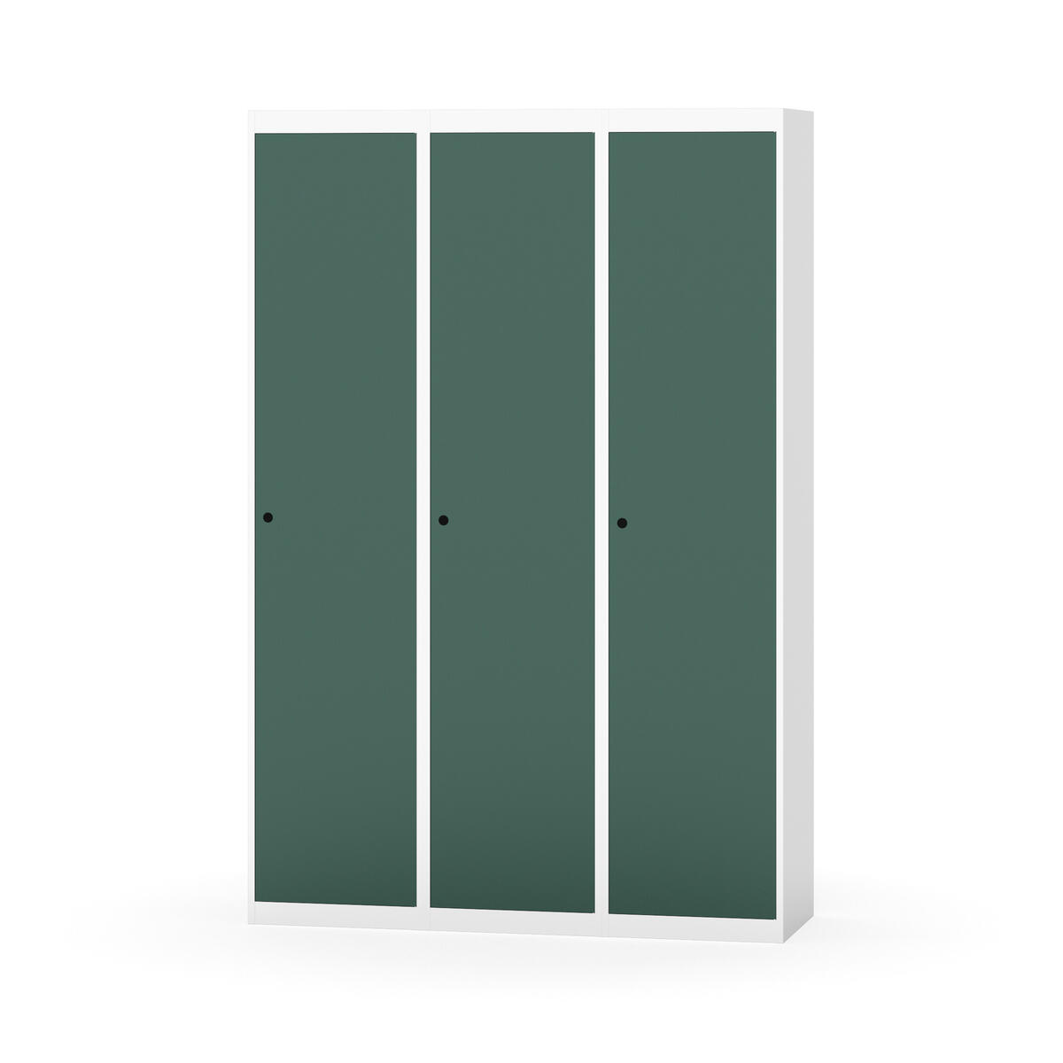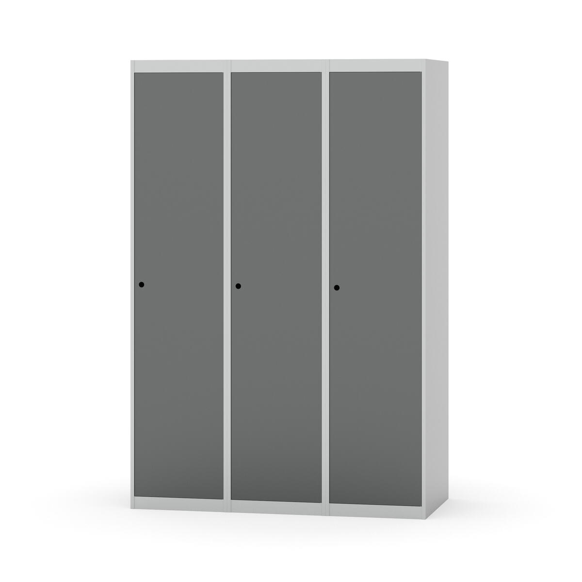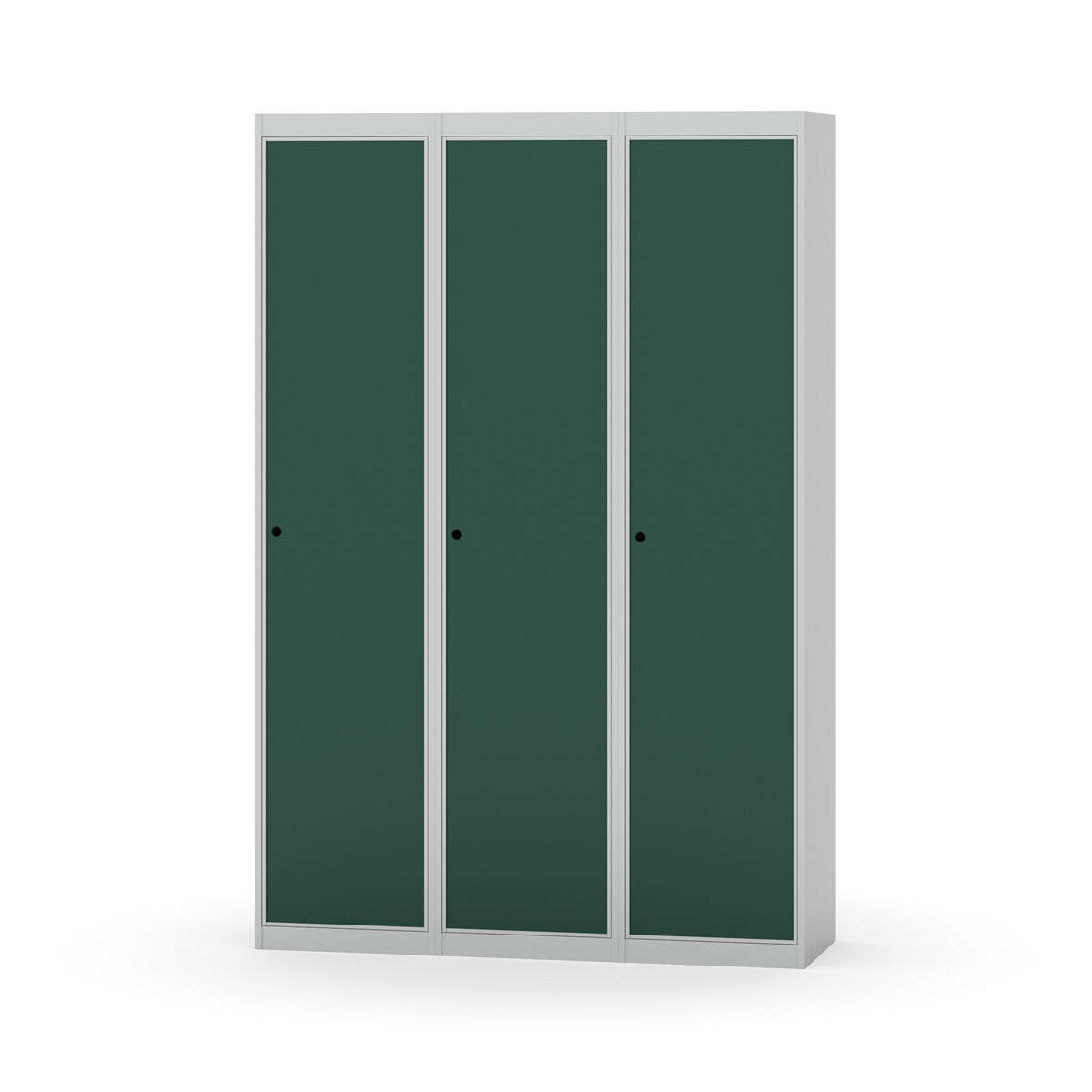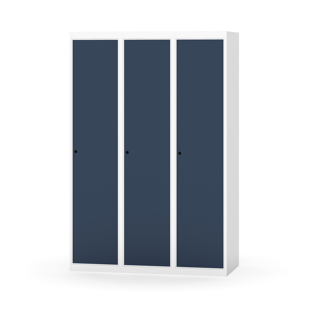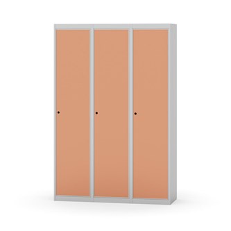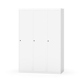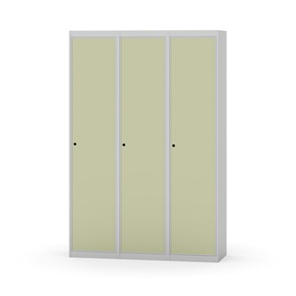 Garderobeskap med helsveiset stamme. Velg mellom dør i metall eller laminat. Metalldøren er utstyrt med dørstopper i stål og innfelt forsterkning rundt låsehullet. Laminatdøren er innfelt i stålramme utstyrt med dørstopper i stål. Dørene kan åpnes 90 grader. Interiør: Hylle og klesstang med to ankerkroker. Glatt gulvflate uten terskel. Ventilasjon gjennom hull i tak/bunnplate. - Vær oppmerksom på at lås/hasp for hengelås og sokkel/ben bestilles på egne artikkelnummer. Lås/hasp for hengelås vil da være montert på skap ved levering. Valgt understell monteres på stedet.