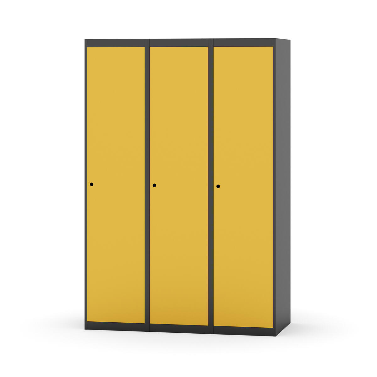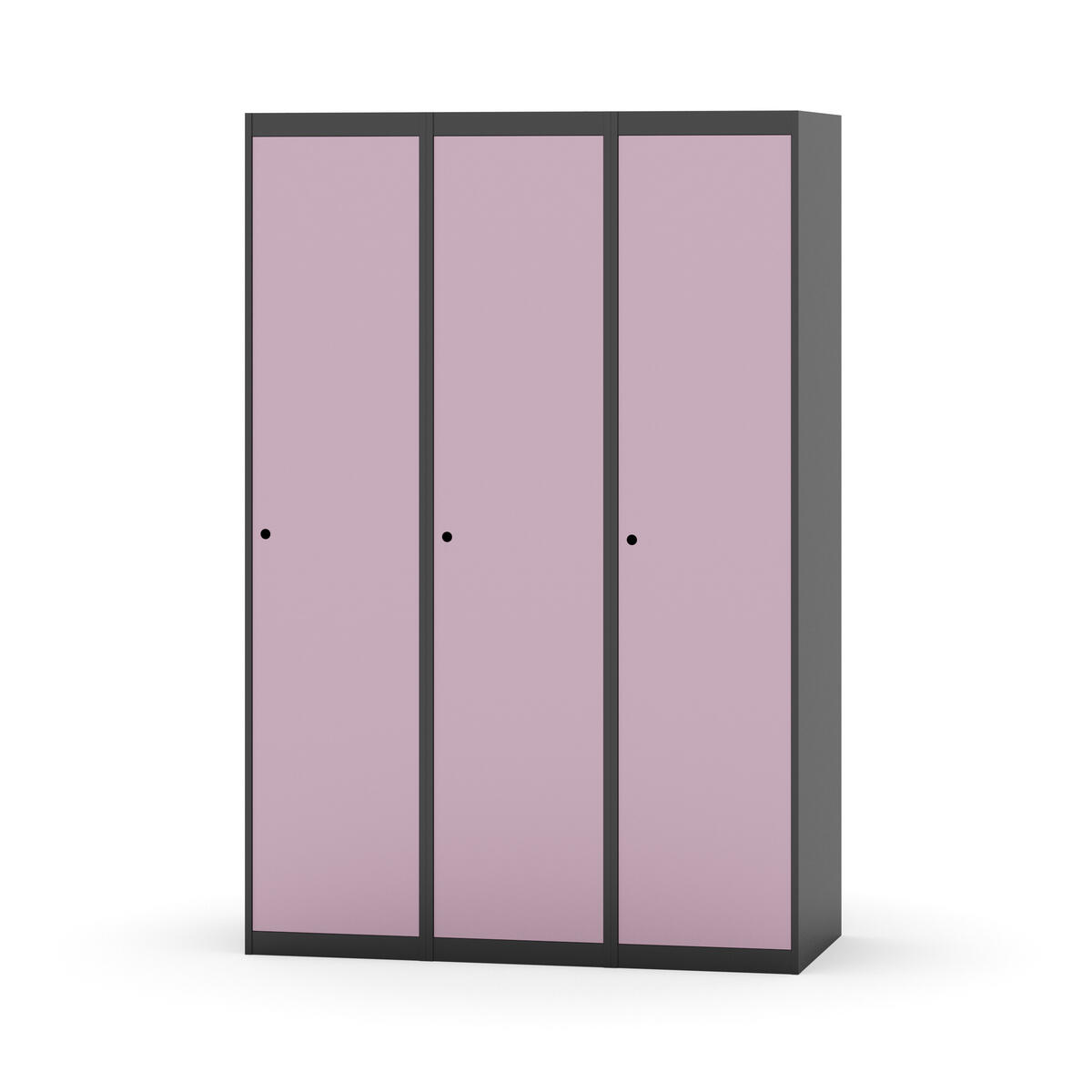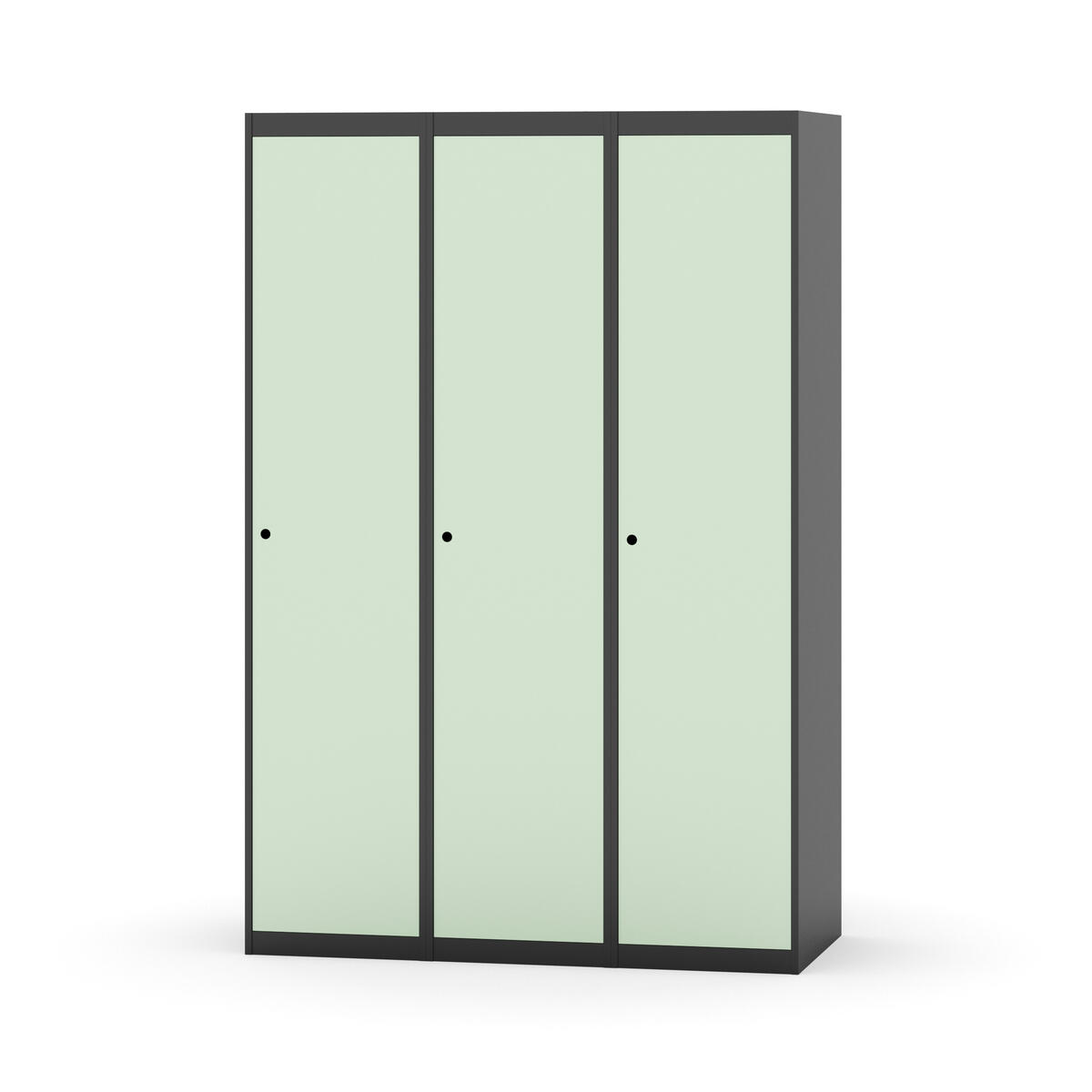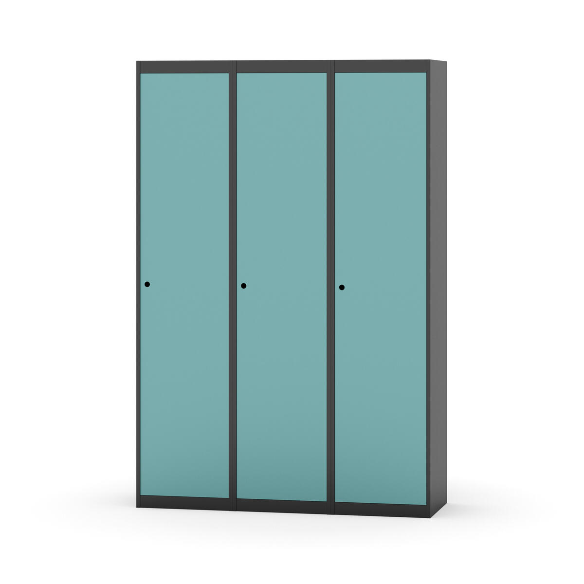 Garderobeskap med helsveiset stamme. Velg mellom dør i metall eller laminat. Metalldøren er utstyrt med dørstopper i stål og innfelt forsterkning rundt låsehullet. Laminatdøren er innfelt i stålramme utstyrt med dørstopper i stål. Dørene kan åpnes 90 grader. Interiør: Hylle og klesstang med to ankerkroker. Glatt gulvflate uten terskel. Ventilasjon gjennom hull i tak/bunnplate. - Vær oppmerksom på at lås/hasp for hengelås og sokkel/ben bestilles på egne artikkelnummer. Lås/hasp for hengelås vil da være montert på skap ved levering. Valgt understell monteres på stedet.