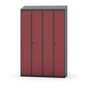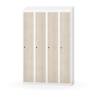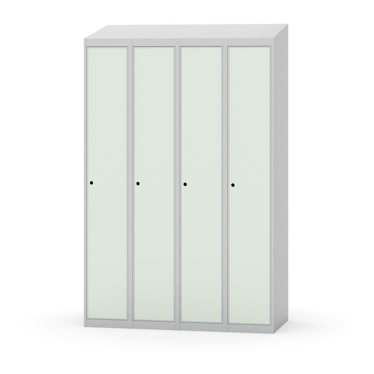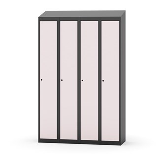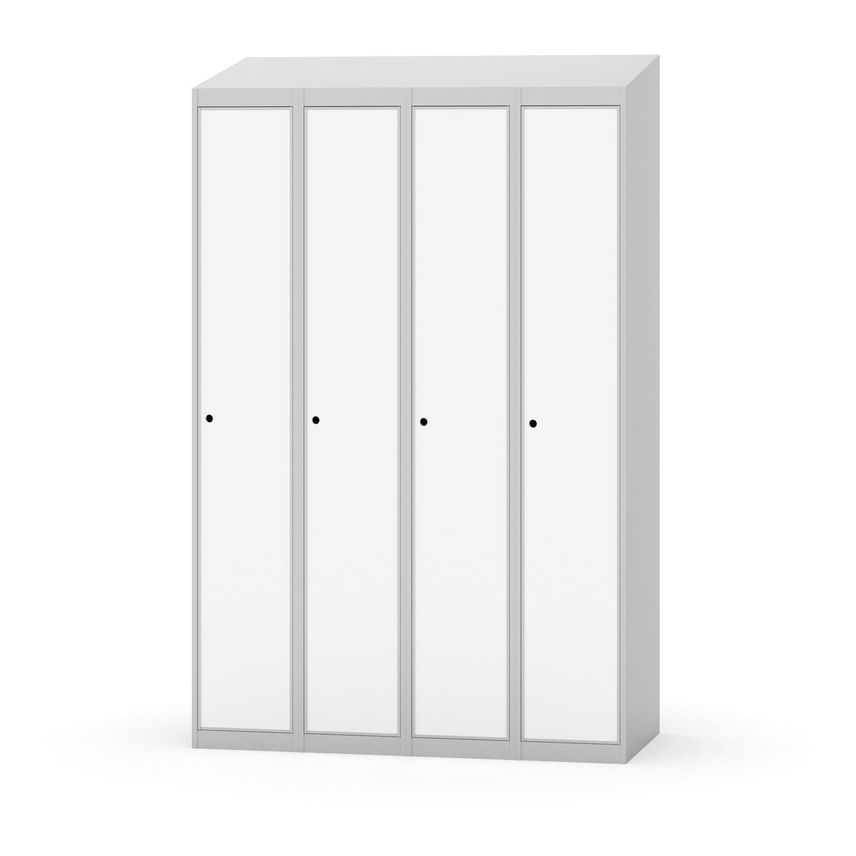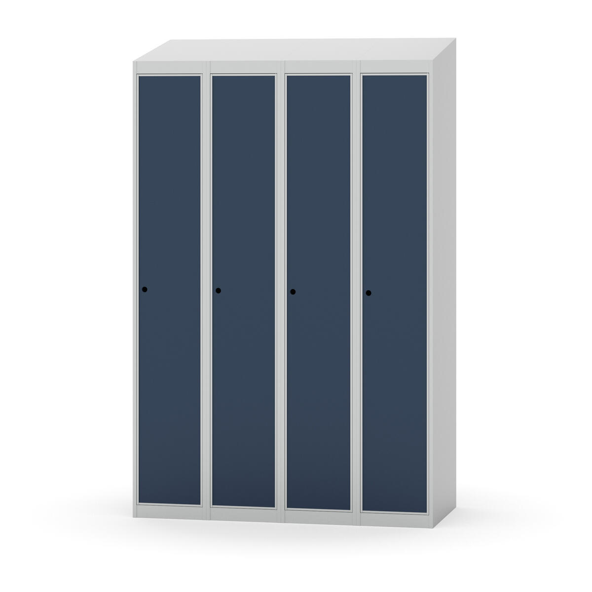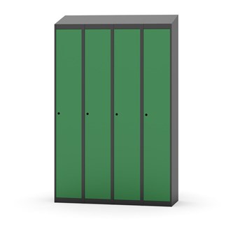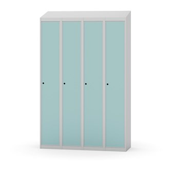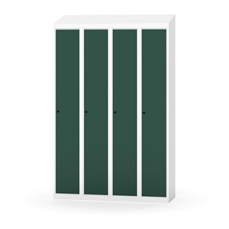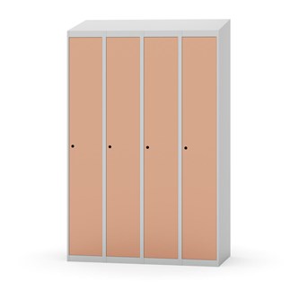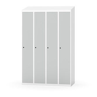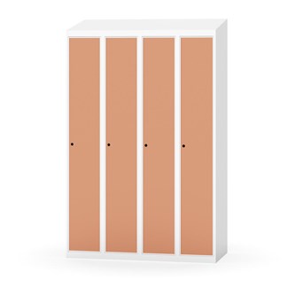 Garderobeskap med helsveiset stamme. Velg mellom dør i metall eller laminat. Metalldøren er utstyrt med dørstopper i stål og innfelt forsterkning rundt låsehullet. Laminatdøren er innfelt i stålramme utstyrt med dørstopper i stål. Dørene kan åpnes 90 grader. Interiør: Hylle og klesstang med to ankerkroker. Glatt gulvflate uten terskel. Ventilasjon gjennom hull i tak/bunnplate. - Vær oppmerksom på at lås/hasp for hengelås og sokkel/ben bestilles på egne artikkelnummer. Lås/hasp for hengelås vil da være montert på skap ved levering. Valgt understell monteres på stedet.