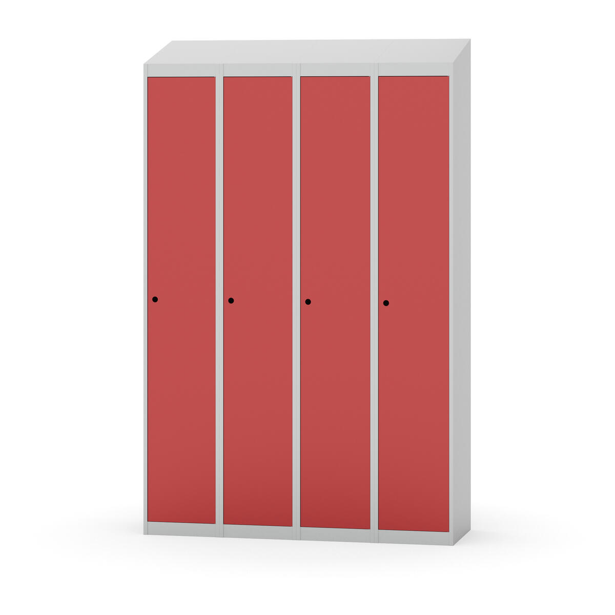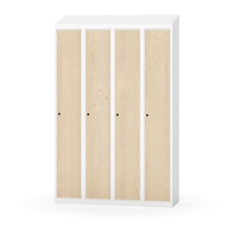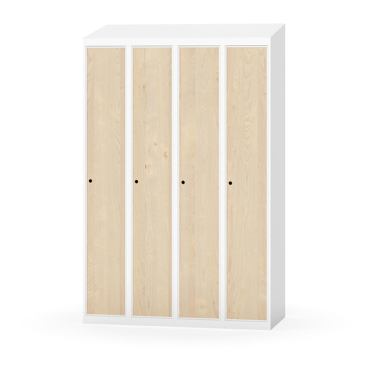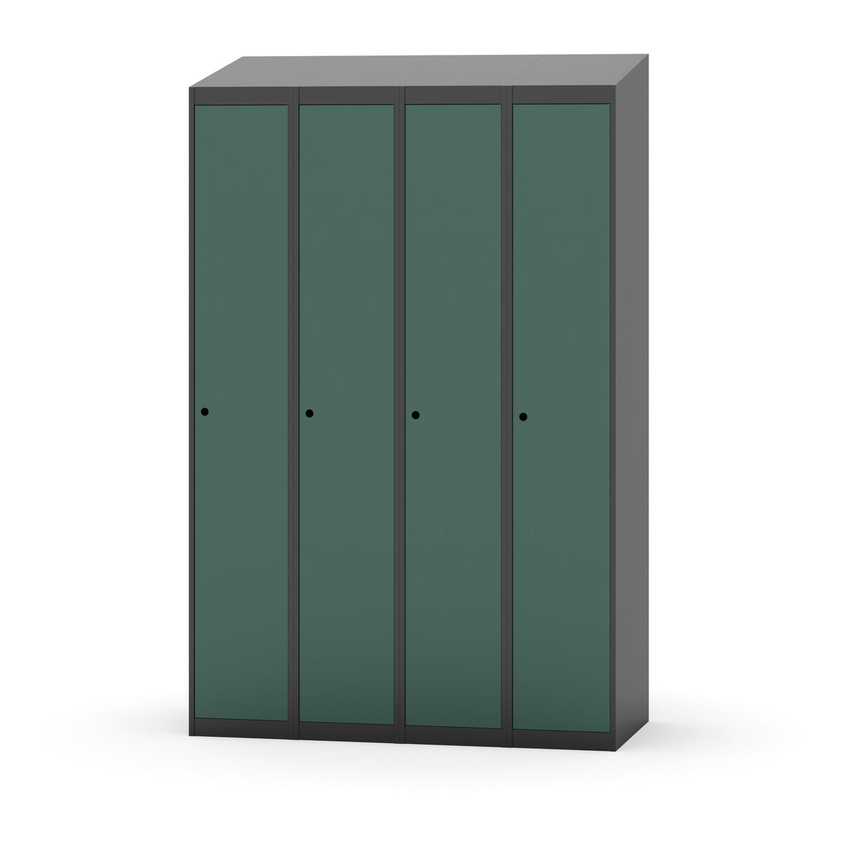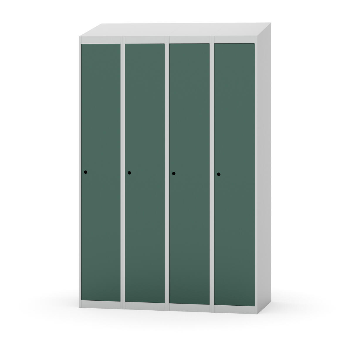 Garderobeskap med helsveiset stamme. Velg mellom dør i metall eller laminat. Metalldøren er utstyrt med dørstopper i stål og innfelt forsterkning rundt låsehullet. Laminatdøren er innfelt i stålramme utstyrt med dørstopper i stål. Dørene kan åpnes 90 grader. Interiør: Hylle og klesstang med to ankerkroker. Glatt gulvflate uten terskel. Ventilasjon gjennom hull i tak/bunnplate. - Vær oppmerksom på at lås/hasp for hengelås og sokkel/ben bestilles på egne artikkelnummer. Lås/hasp for hengelås vil da være montert på skap ved levering. Valgt understell monteres på stedet.