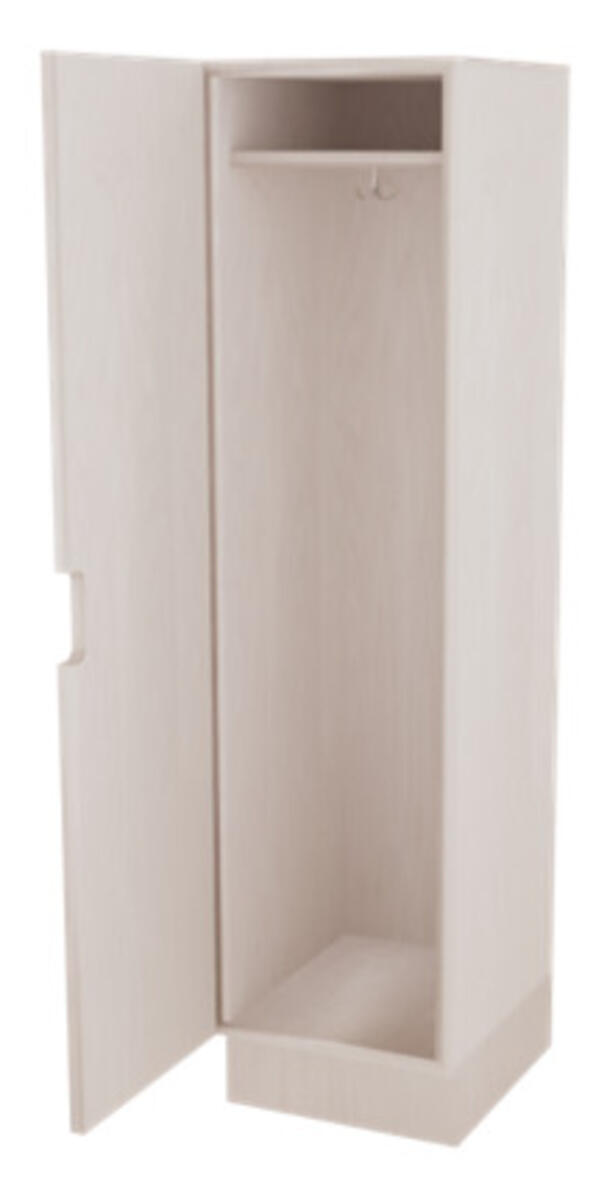 1-roms, gulvstående garderobe på sokkel. Fleksibilitet i forhold til skiftende behov i. Lukkede enheter som skaper et rolig uttrykk og forbedrer det visuelle miljøet i garderoben. Hele garderoben, inkludert bakplate, er laget i bjørk kryssfiner. Hel, tett dør med utfrest håndtak. Solide og kraftige hengsler som er usynlige fra utsiden. 1 hylle på toppen, 3-armet propellkrok, 10 cm høy sokkel. Ventilasjon i overkant. Utfrest lomme med plexiglass, til bilde eller navn, på dør. Heldekkende bakplate. Flat topplate/tak.