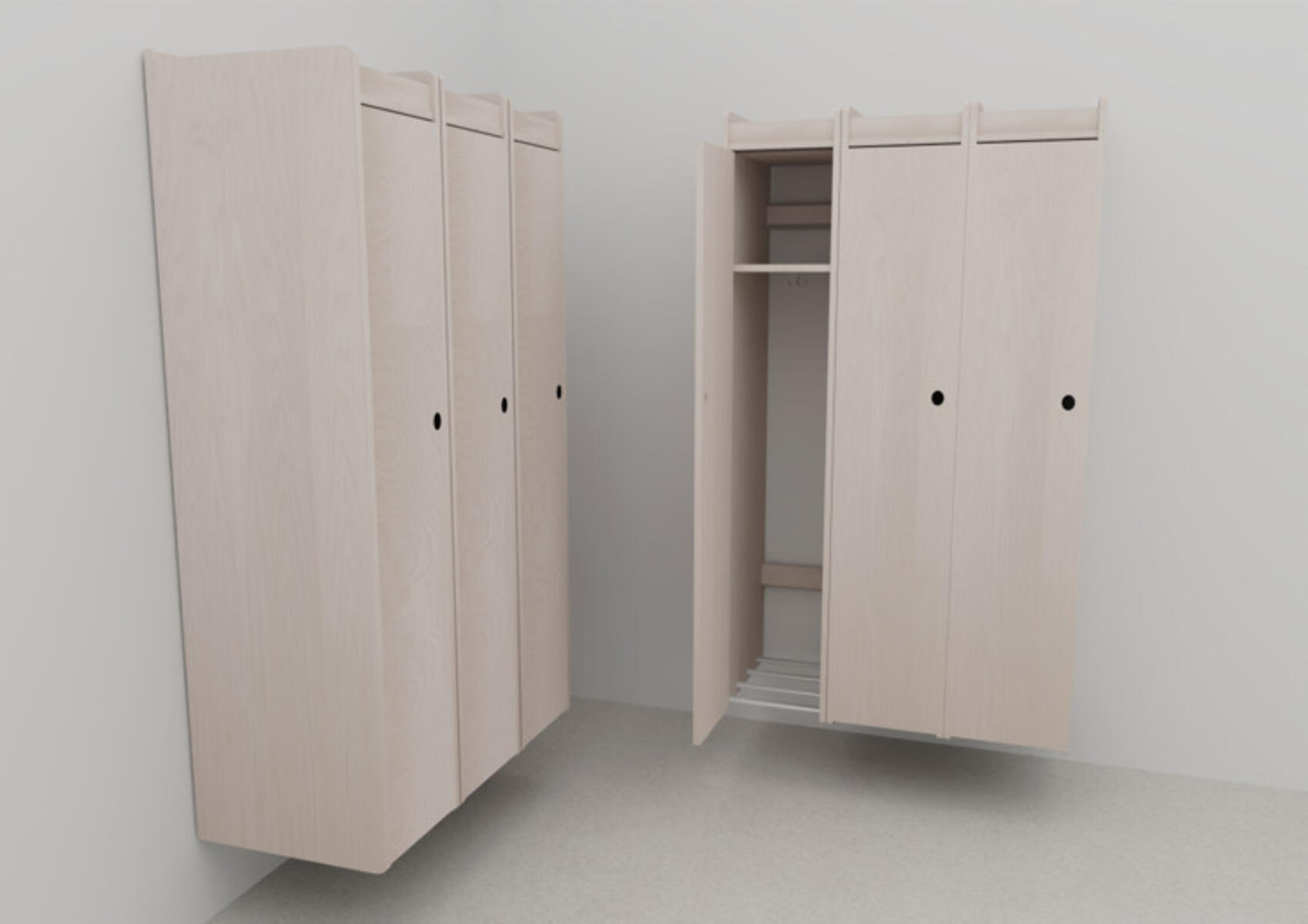 1-roms, vegghengt elevskap med kodelås. Spesielt tilpasset skolemiljøer for ekstra hard bruk .Hele garderoben, inkludert bakplate, er laget i bjørk kryssfiner. Ekstra kraftig, hel dør med manuell kodelås, dørstoppere og gummidempere. Belagt med høytrykkslaminat på overflate. Utfrest håndtak i dør. 3 solide og kraftige hengsler. 1 hylle, 3-armet karusellkrok og en veskekrok for oppheng av sekk montert på sidevegg. Flat topplate med plass til boks/kurv. Oppstikk over dør og rundt skap. Ventilasjon i overkant og nederst. Heldekkende bakplate. Skohylle av metallrør i nedre del av skap.