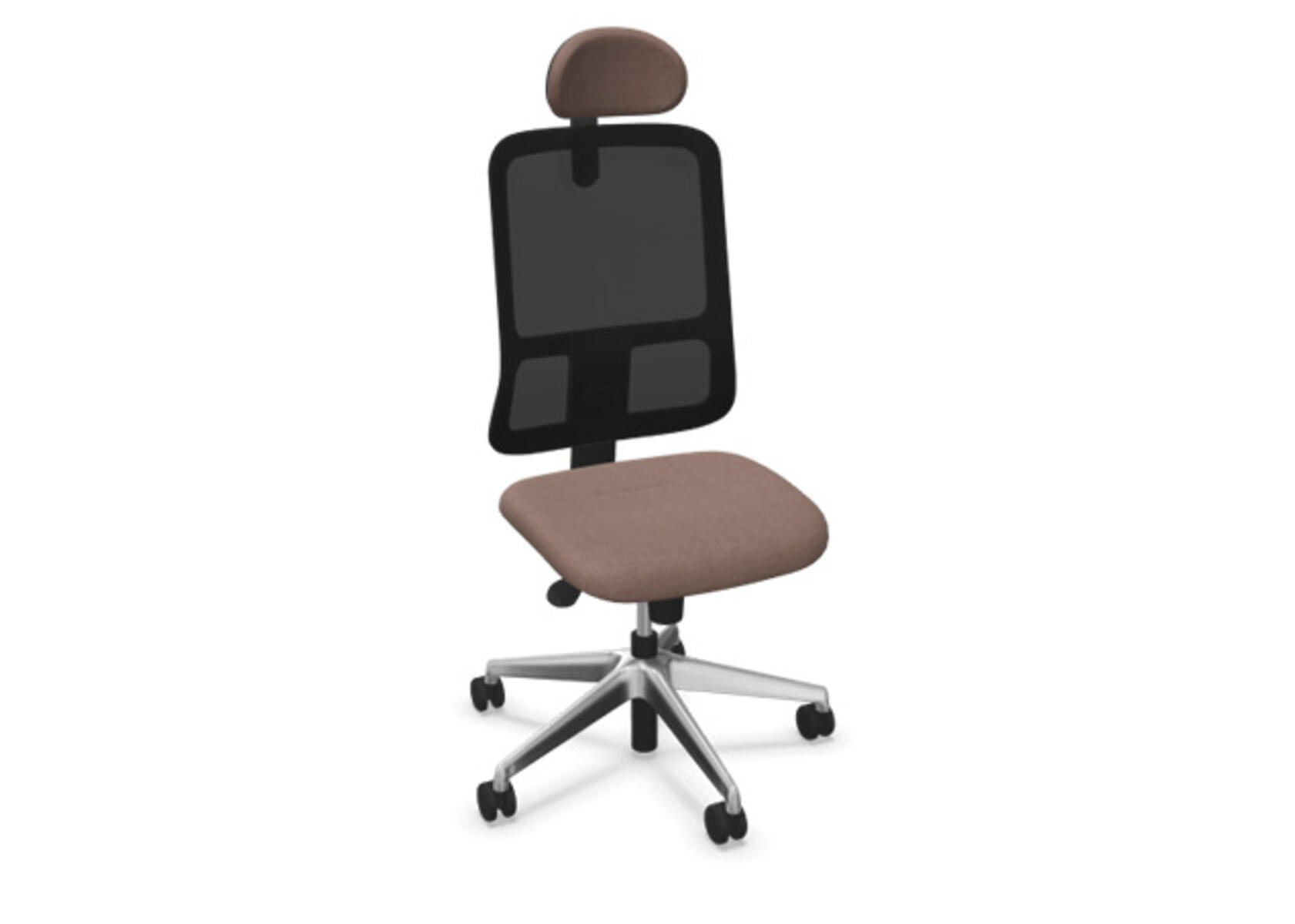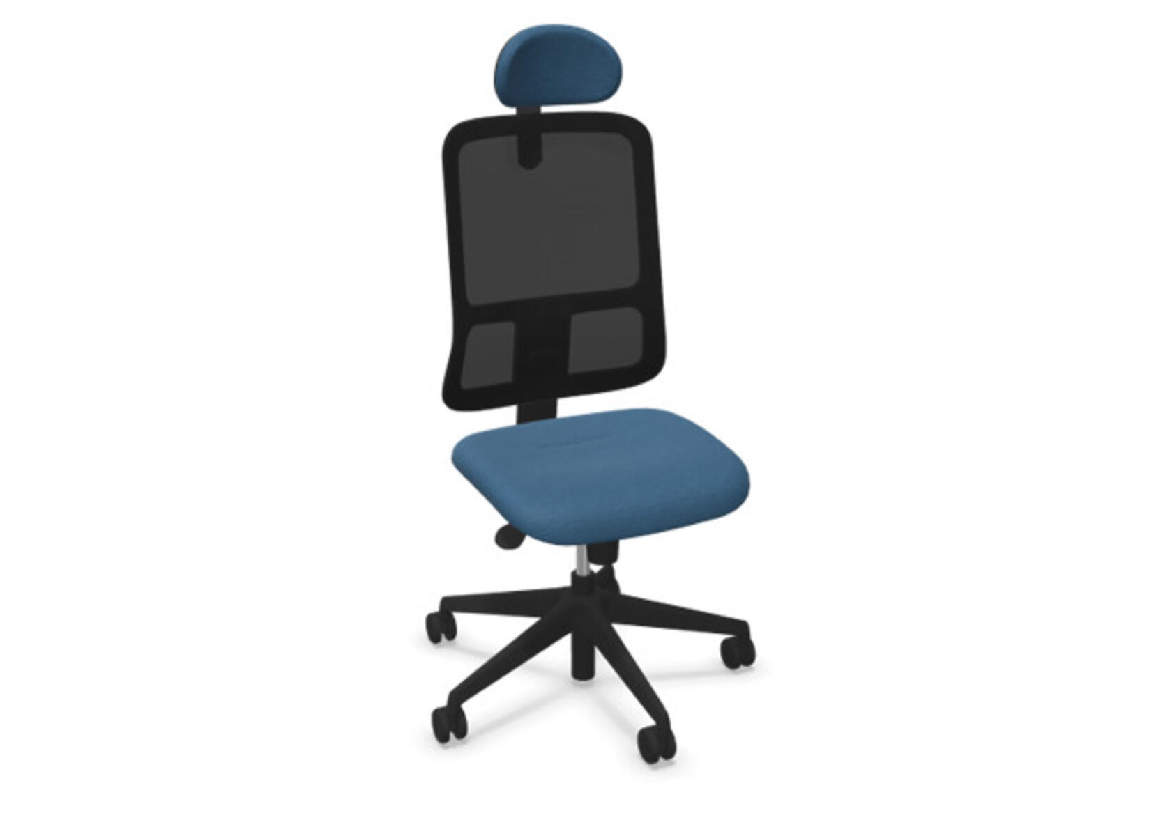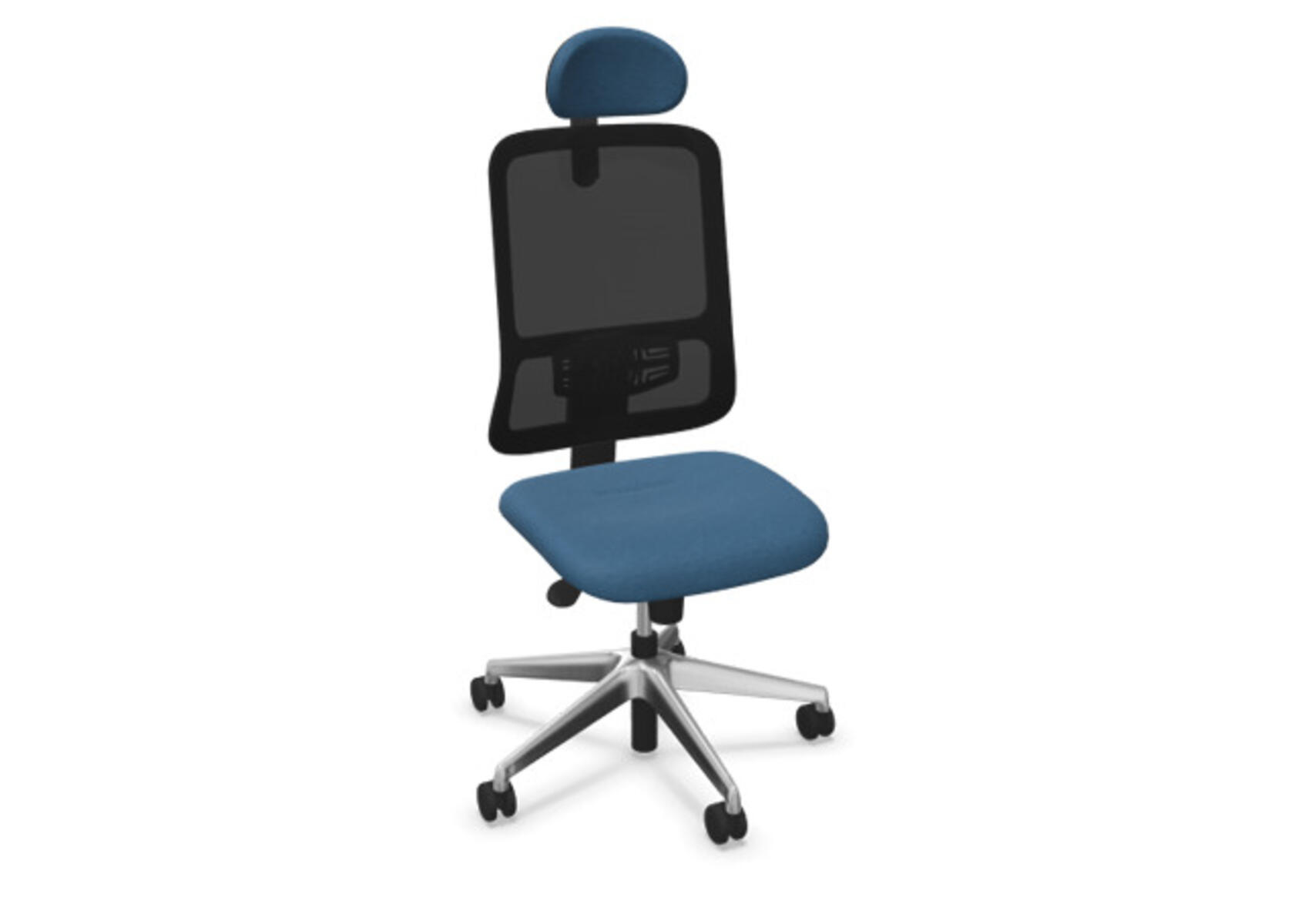 Ergonomisk kontorstol med delvis polstret rygg og synkronmekanisme samt justering av sittedybden, utformet for å gi støtte ved aktiv sitting gjennom hele arbeidsdagen. Polyesterstoff. Den synkroniserte bevegelsen mellom ryggstøtte og sete gir en aktiv og komfortabel sittestilling. Ryggstøttens vippevinkel er 20° synkronisert med setets vippevinkel på 11°. Ryggstøtten kan låses i 5 ulike posisjoner for individuell tilpasning, og motstanden i ryggstøtten justeres enkelt med et dreiehjul. Sittedybden kan justeres innenfor et område på 50 mm. Polstret nakkestøtte, justerbar innenfor intervallene: dybde 20 mm, vinkel 70° og høyde 100 mm. Stolen har også Anti-Shock-funksjon som hindrer ryggstøtten i å slå tilbake når vippen låses opp. Velg mellom kryss i lysgrå polyamid eller polert aluminium samt selvbremsende hjul for myke eller harde gulv. Som tilvalg finnes også regulerbart korsryggstøtte, manuelt justerbart i dybde (15 mm) og høyde (20 mm). Armlener i 2D, 3D eller 4D selges separat.