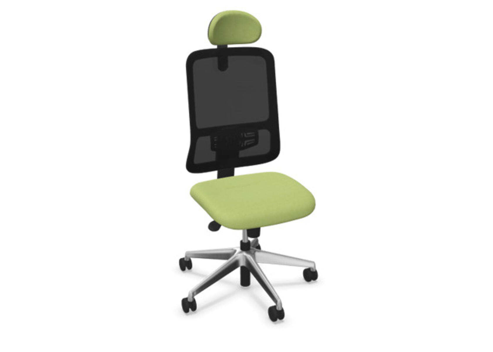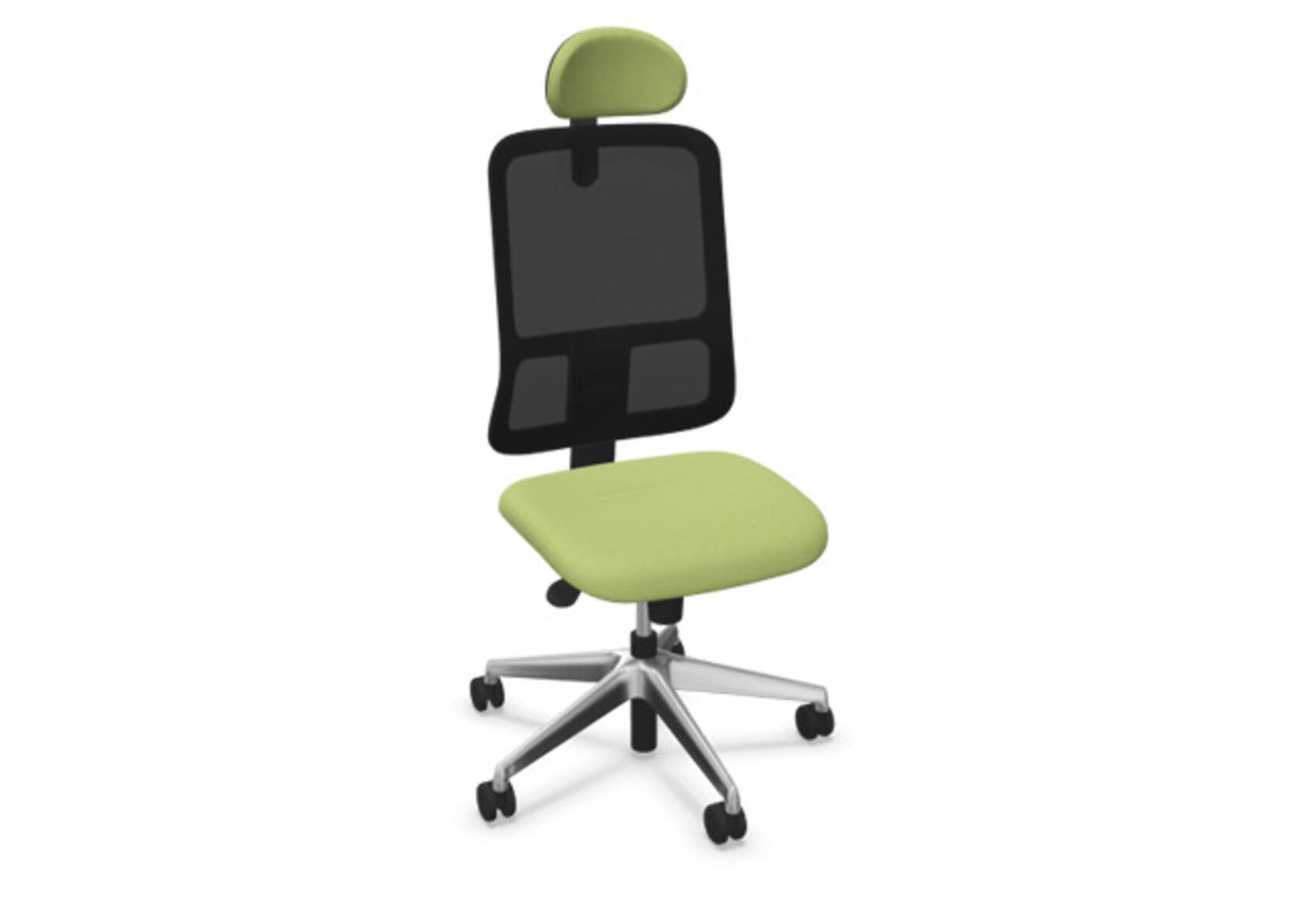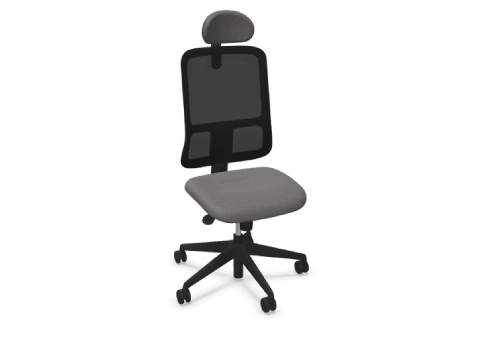 Ergonomisk kontorstol med delvis polstret rygg og synkronmekanisme samt justering av sittedybden, utformet for å gi støtte ved aktiv sitting gjennom hele arbeidsdagen. Polyesterstoff. Den synkroniserte bevegelsen mellom ryggstøtte og sete gir en aktiv og komfortabel sittestilling. Ryggstøttens vippevinkel er 20° synkronisert med setets vippevinkel på 11°. Ryggstøtten kan låses i 5 ulike posisjoner for individuell tilpasning, og motstanden i ryggstøtten justeres enkelt med et dreiehjul. Sittedybden kan justeres innenfor et område på 50 mm. Polstret nakkestøtte, justerbar innenfor intervallene: dybde 20 mm, vinkel 70° og høyde 100 mm. Stolen har også Anti-Shock-funksjon som hindrer ryggstøtten i å slå tilbake når vippen låses opp. Velg mellom kryss i lysgrå polyamid eller polert aluminium samt selvbremsende hjul for myke eller harde gulv. Som tilvalg finnes også regulerbart korsryggstøtte, manuelt justerbart i dybde (15 mm) og høyde (20 mm). Armlener i 2D, 3D eller 4D selges separat.