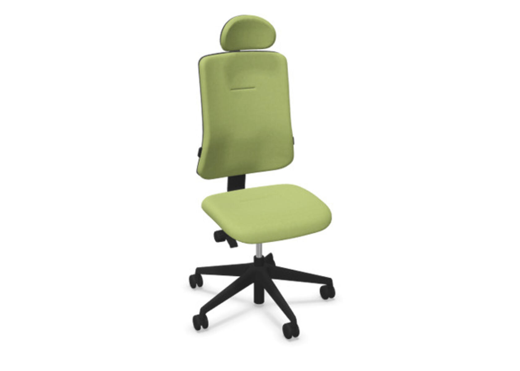 Ergonomisk kontorstol med delvis polstret rygg og synkronmekanisme samt justering av sittedybden, utformet for å gi støtte ved aktiv sitting gjennom hele arbeidsdagen. Polyesterstoff. Den synkroniserte bevegelsen mellom ryggstøtte og sete gir en aktiv og komfortabel sittestilling. Ryggstøttens vippevinkel er 20° synkronisert med setets vippevinkel på 11°. Ryggstøtten kan låses i 5 ulike posisjoner for individuell tilpasning, og motstanden i ryggstøtten justeres enkelt med et dreiehjul. Sittedybden kan justeres innenfor et område på 50 mm. Polstret nakkestøtte, justerbar innenfor intervallene: dybde 20 mm, vinkel 70° og høyde 100 mm. Stolen har også Anti-Shock-funksjon som hindrer ryggstøtten i å slå tilbake når vippen låses opp. Velg mellom kryss i lysgrå polyamid eller polert aluminium samt selvbremsende hjul for myke eller harde gulv. Som tilvalg finnes også regulerbart korsryggstøtte, manuelt justerbart i dybde (15 mm) og høyde (20 mm). Armlener i 2D, 3D eller 4D selges separat.