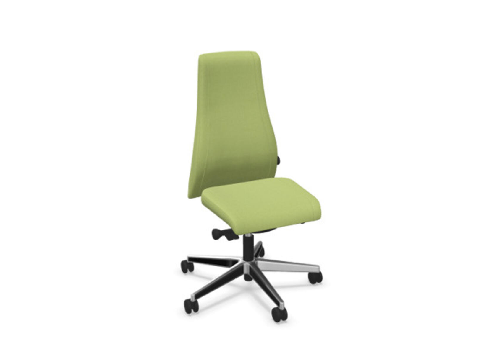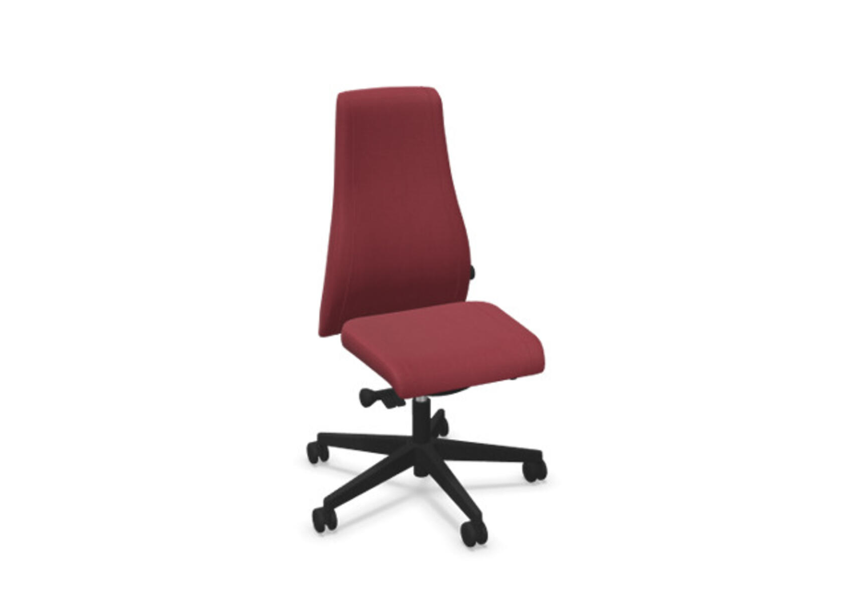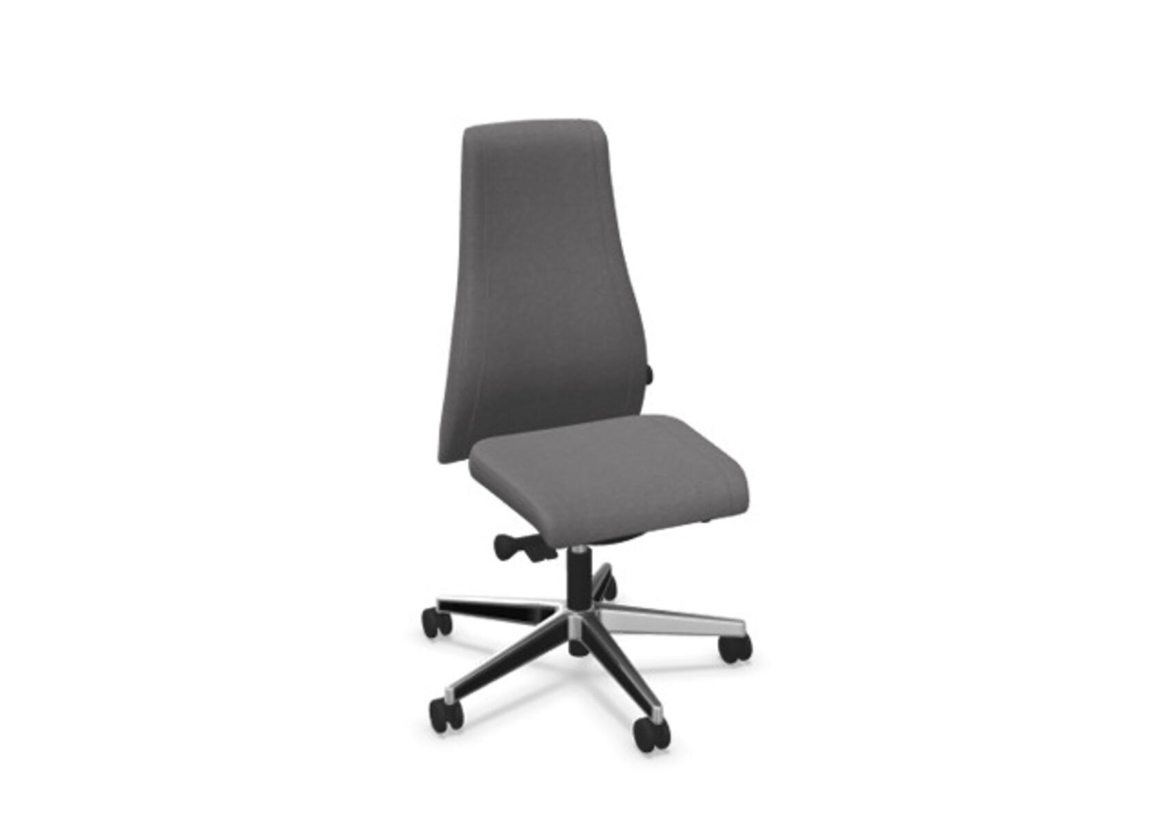 En stilren og ergonomisk kontorstol med heltrukket høy rygg og synkronmekanisme samt justering av sittedybde, utformet for å gi støtte ved aktiv sitting gjennom hele arbeidsdagen. Trukket i polyesterstoff. Den synkroniserte vippen mellom ryggstøtte og sete gir en aktiv og komfortabel sittestilling. Ryggstøttens vippevinkel er 23° synkronisert med setets vippevinkel på 10°. Ryggstøtten kan låses i 5 ulike posisjoner for individuell tilpasning, og motstanden i ryggstøtten justeres enkelt med et dreiehjul i 7 trinn. Ryggstøtten er høydejusterbar innenfor et område på 70 mm med 13 låseposisjoner. Sittedybden kan justeres innenfor et område på 60 mm. Negativ setevinkel på –2° synkronisert med ryggstøtte ved 5°, noe som sikrer optimalt ryggstøtte i alle vippeposisjoner. Stolen har også Anti-Shock-funksjon som hindrer ryggstøtten i å slå tilbake når vippen låses opp. Velg mellom kryss i svart polyamid eller polert aluminium samt selvbremsende hjul for myke eller harde gulv. Som tilvalg finnes også korsryggstøtte, manuelt justerbar i dybden (20 mm) med et dreiehjul. Armlener i 2D, 3D eller 4D selges separat.