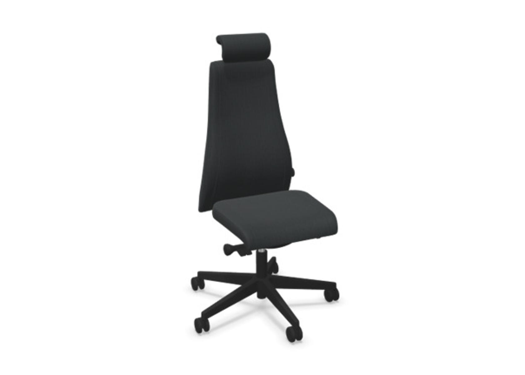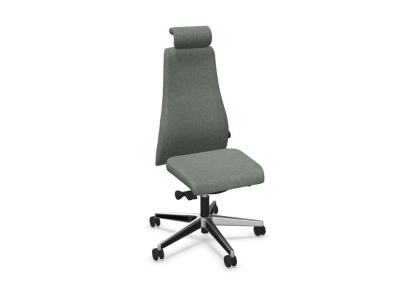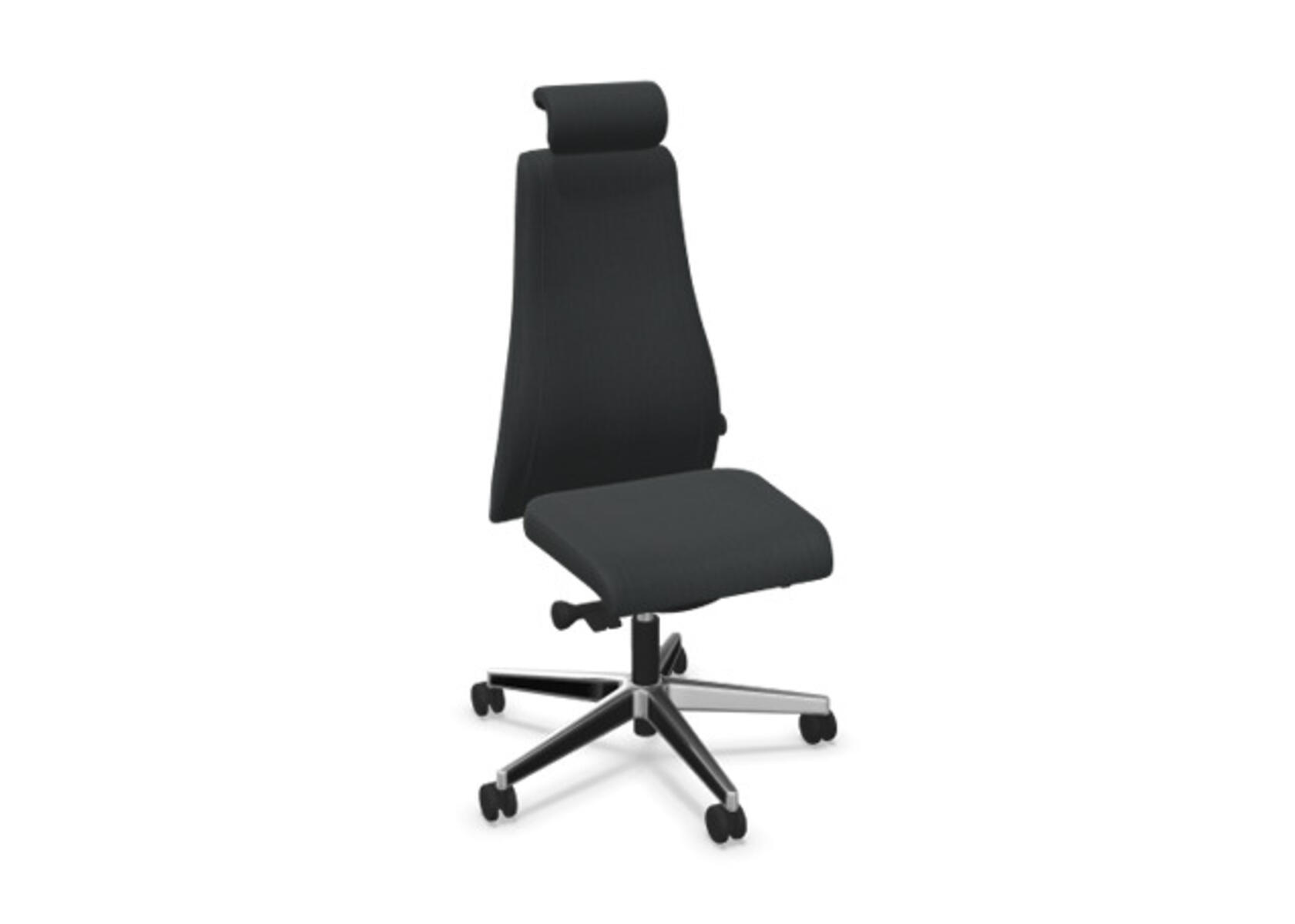 En stilren og ergonomisk kontorstol med heltrukket høy rygg og synkronmekanisme samt justering av sittedybde, utformet for å gi støtte ved aktiv sitting gjennom hele arbeidsdagen. Trukket i polyesterstoff. Den synkroniserte vippen mellom ryggstøtte og sete gir en aktiv og komfortabel sittestilling. Ryggstøttens vippevinkel er 23° synkronisert med setets vippevinkel på 10°. Ryggstøtten kan låses i 5 ulike posisjoner for individuell tilpasning, og motstanden i ryggstøtten justeres enkelt med et dreiehjul i 7 trinn. Ryggstøtten er høydejusterbar innenfor et område på 70 mm med 13 låseposisjoner. Sittedybden kan justeres innenfor et område på 60 mm. Negativ setevinkel på –2° synkronisert med ryggstøtte ved 5°, noe som sikrer optimalt ryggstøtte i alle vippeposisjoner. Justerbart, polstret nakkestøtte med vinkel- og høydejustering innenfor et område på 75 mm. Stolen har også Anti-Shock-funksjon som hindrer ryggstøtten i å slå tilbake når vippen låses opp. Velg mellom kryss i svart polyamid eller polert aluminium samt selvbremsende hjul for myke eller harde gulv. Som tilvalg finnes også korsryggstøtte, manuelt justerbar i dybden (20 mm) med et dreiehjul. Armlener i 2D, 3D eller 4D selges separat.