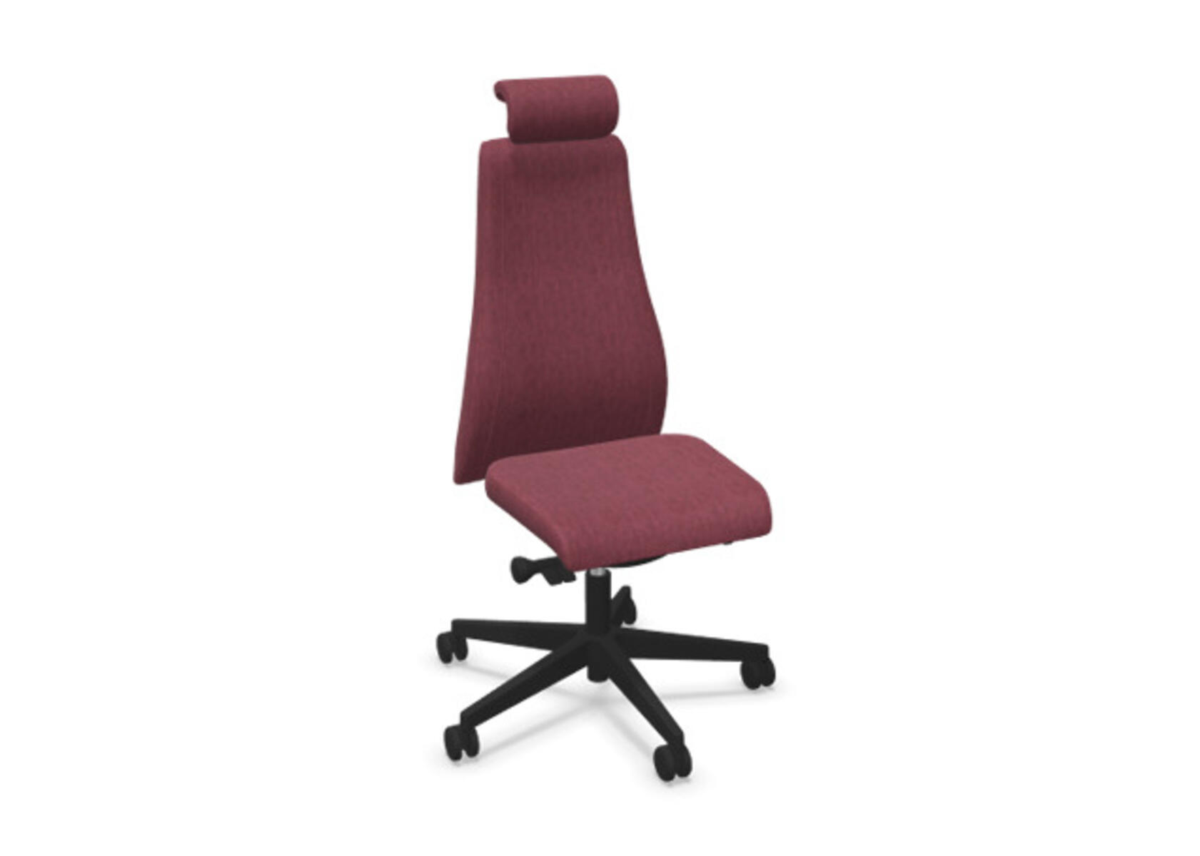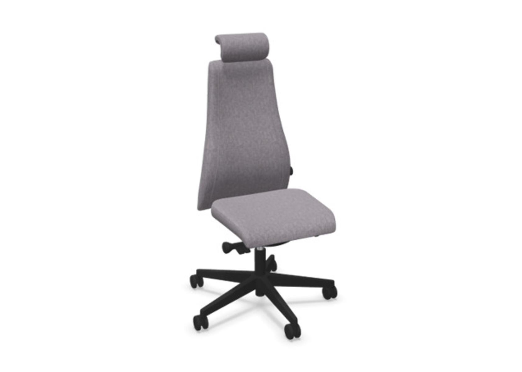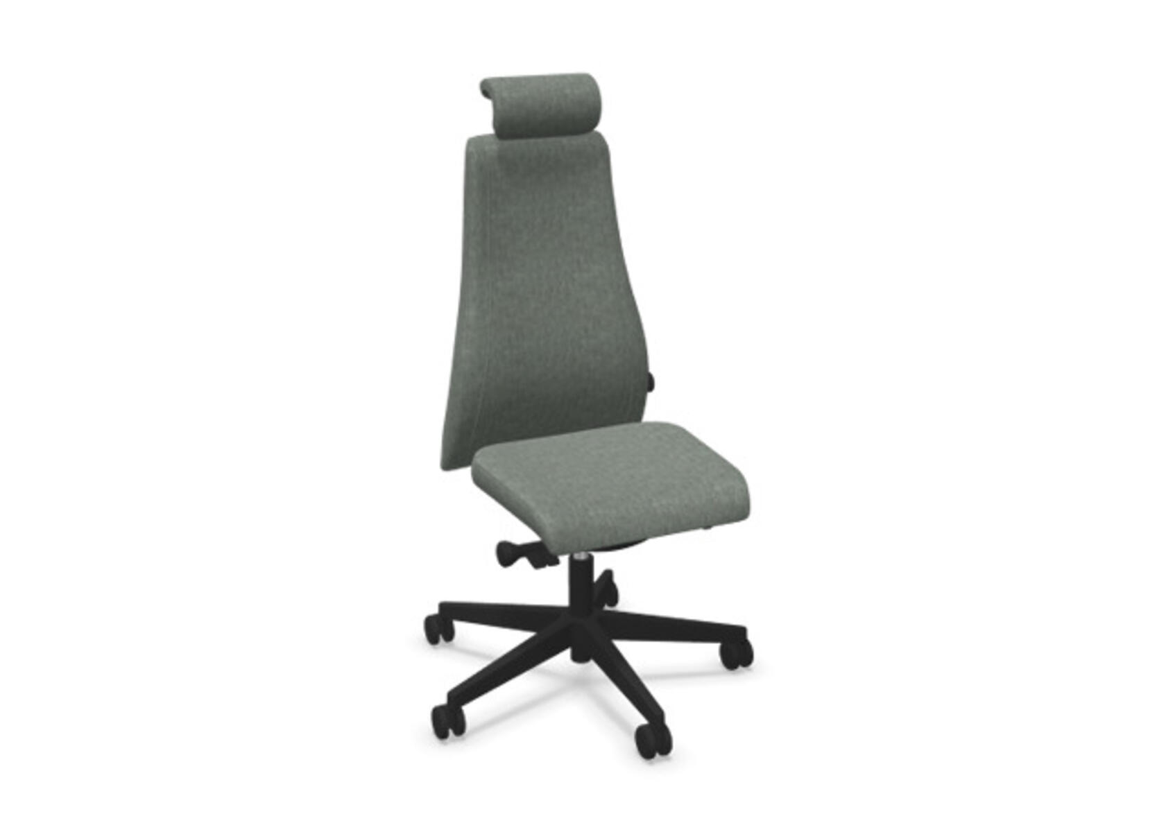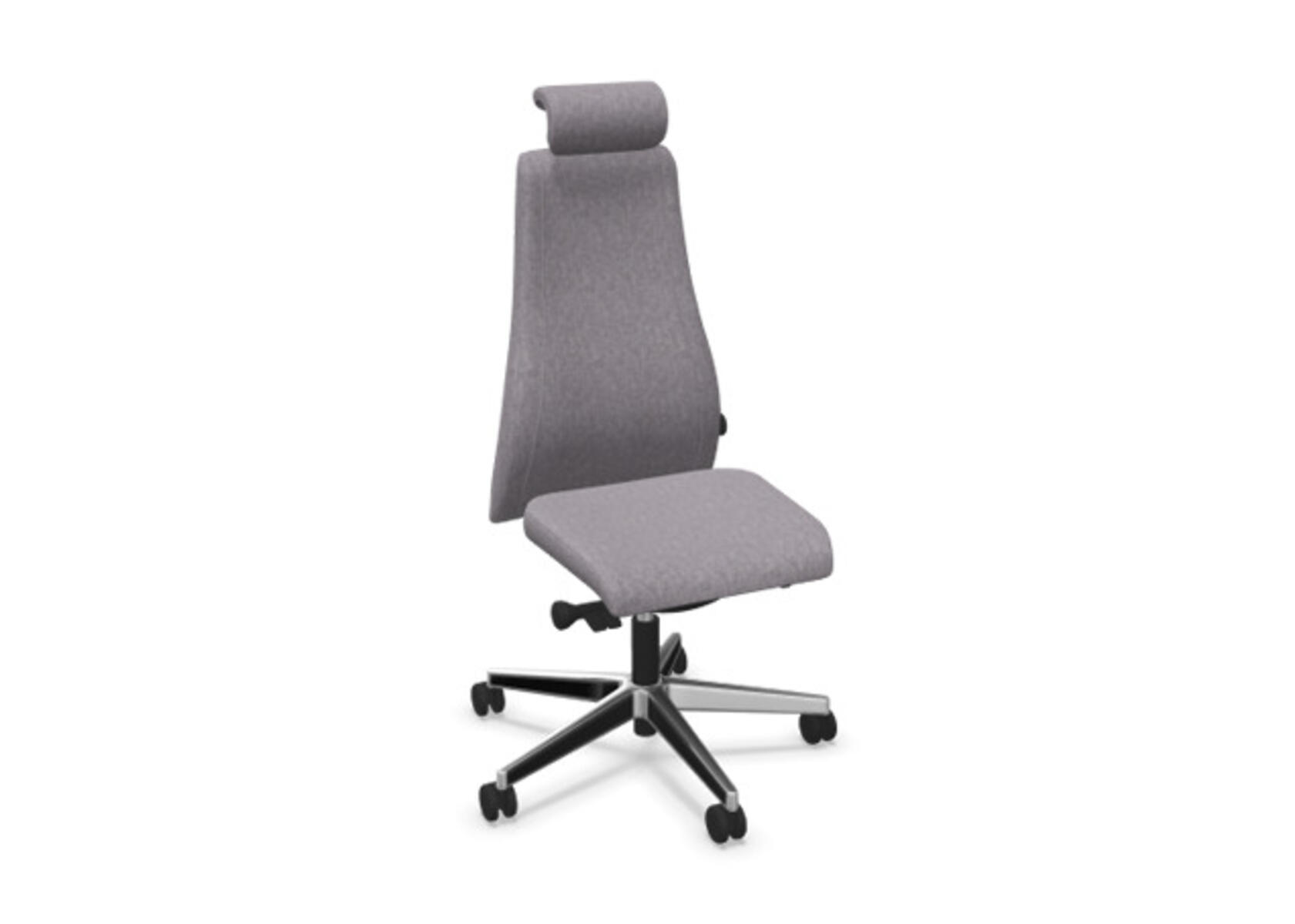 En stilren og ergonomisk kontorstol med heltrukket høy rygg og synkronmekanisme samt justering av sittedybde, utformet for å gi støtte ved aktiv sitting gjennom hele arbeidsdagen. Trukket i polyesterstoff. Den synkroniserte vippen mellom ryggstøtte og sete gir en aktiv og komfortabel sittestilling. Ryggstøttens vippevinkel er 23° synkronisert med setets vippevinkel på 10°. Ryggstøtten kan låses i 5 ulike posisjoner for individuell tilpasning, og motstanden i ryggstøtten justeres enkelt med et dreiehjul i 7 trinn. Ryggstøtten er høydejusterbar innenfor et område på 70 mm med 13 låseposisjoner. Sittedybden kan justeres innenfor et område på 60 mm. Negativ setevinkel på –2° synkronisert med ryggstøtte ved 5°, noe som sikrer optimalt ryggstøtte i alle vippeposisjoner. Justerbart, polstret nakkestøtte med vinkel- og høydejustering innenfor et område på 75 mm. Stolen har også Anti-Shock-funksjon som hindrer ryggstøtten i å slå tilbake når vippen låses opp. Velg mellom kryss i svart polyamid eller polert aluminium samt selvbremsende hjul for myke eller harde gulv. Som tilvalg finnes også korsryggstøtte, manuelt justerbar i dybden (20 mm) med et dreiehjul. Armlener i 2D, 3D eller 4D selges separat.