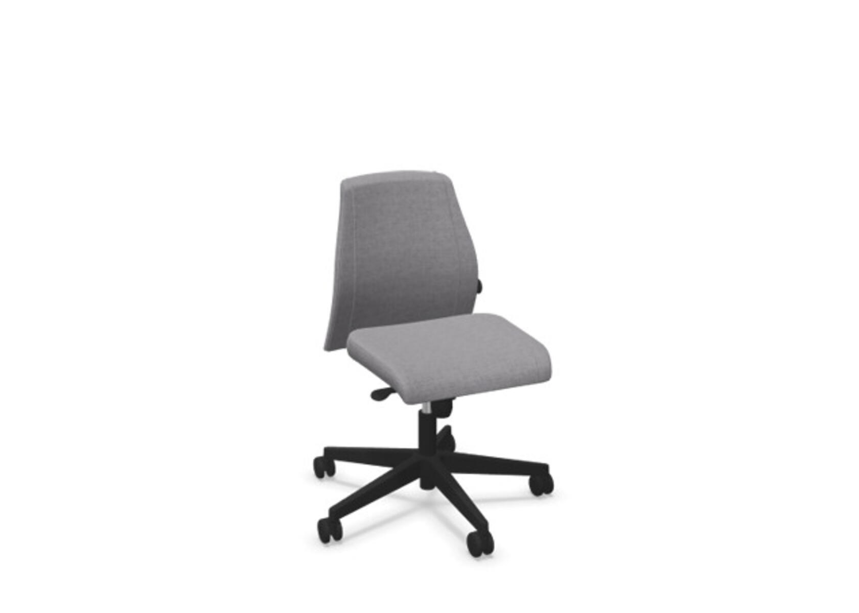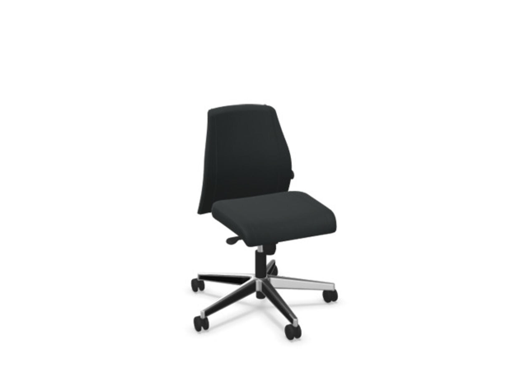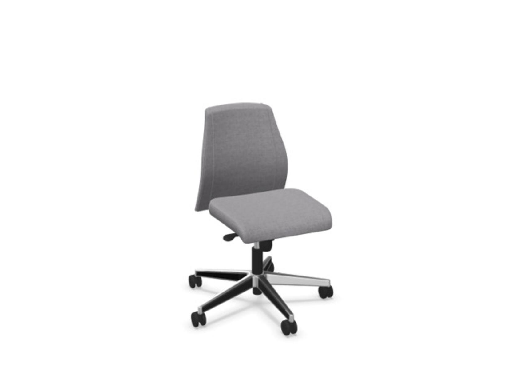 En stilren og ergonomisk kontorstol med heltrukket lav rygg og synkronmekanisme, utformet for å gi støtte ved aktiv sitting gjennom hele arbeidsdagen. Trukket i polyesterstoff. Den synkroniserte bevegelsen mellom ryggstøtte og sete gir en aktiv og komfortabel sittestilling. Ryggstøttets vippevinkel er 20° synkronisert med setets vippevinkel på 11°. Ryggstøtten kan låses i 5 ulike posisjoner for individuell tilpasning, og motstanden i ryggstøtten justeres enkelt med et dreiehjul. Ryggstøtten er høydejusterbar innenfor et område på 70 mm med 13 låseposisjoner. Stolen har også Anti-Shock-funksjon som hindrer ryggstøtten i å slå tilbake når vippen låses opp. Velg mellom kryss i svart polyamid eller polert aluminium samt selvbremsende hjul for myke eller harde gulv. Som tilvalg finnes også lumbalstøtte (Shukra-mekanisme), manuelt justerbar i dybden (20 mm) med et dreiehjul. Armlener i 1D, 2D, 3D eller 4D selges separat.