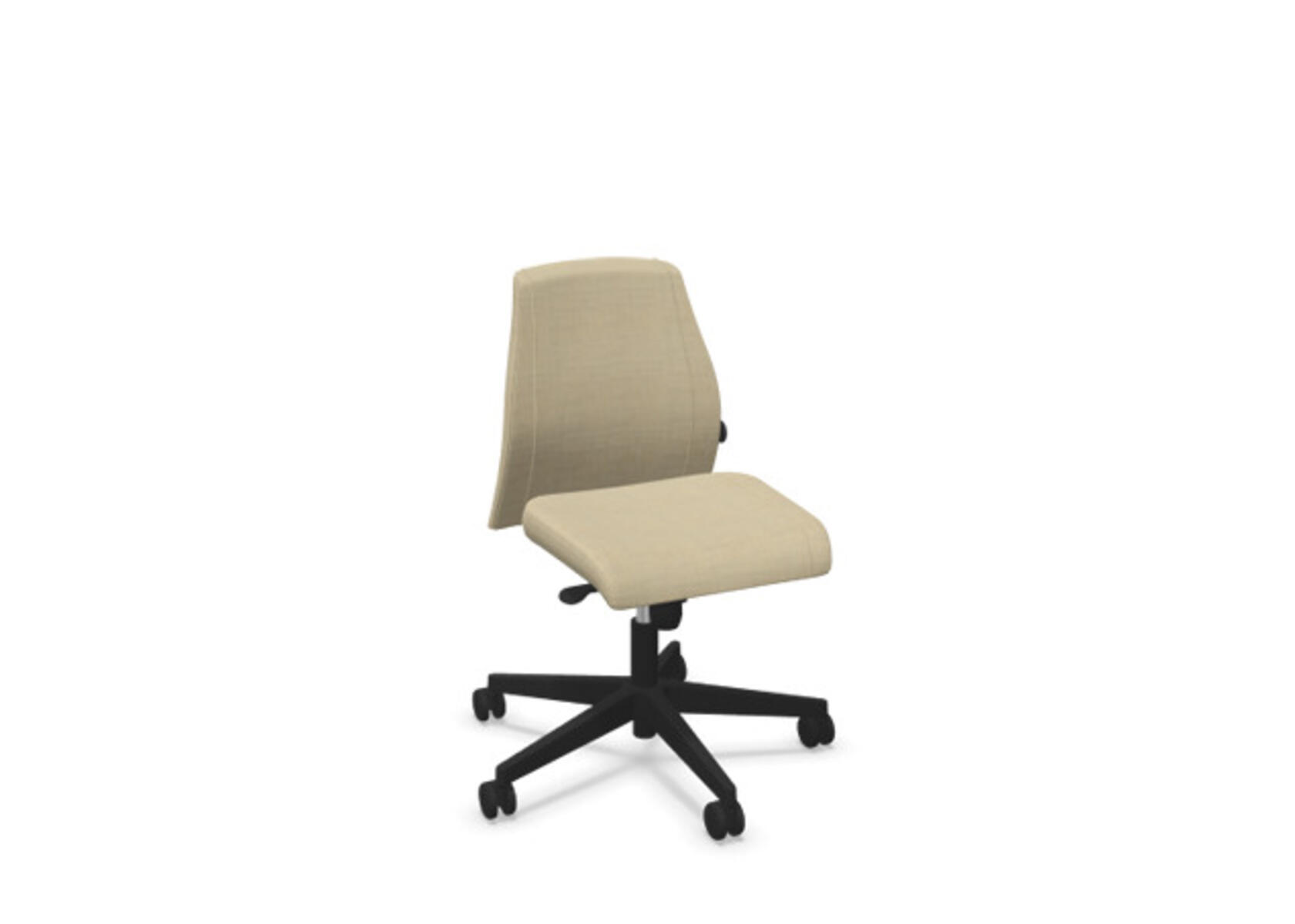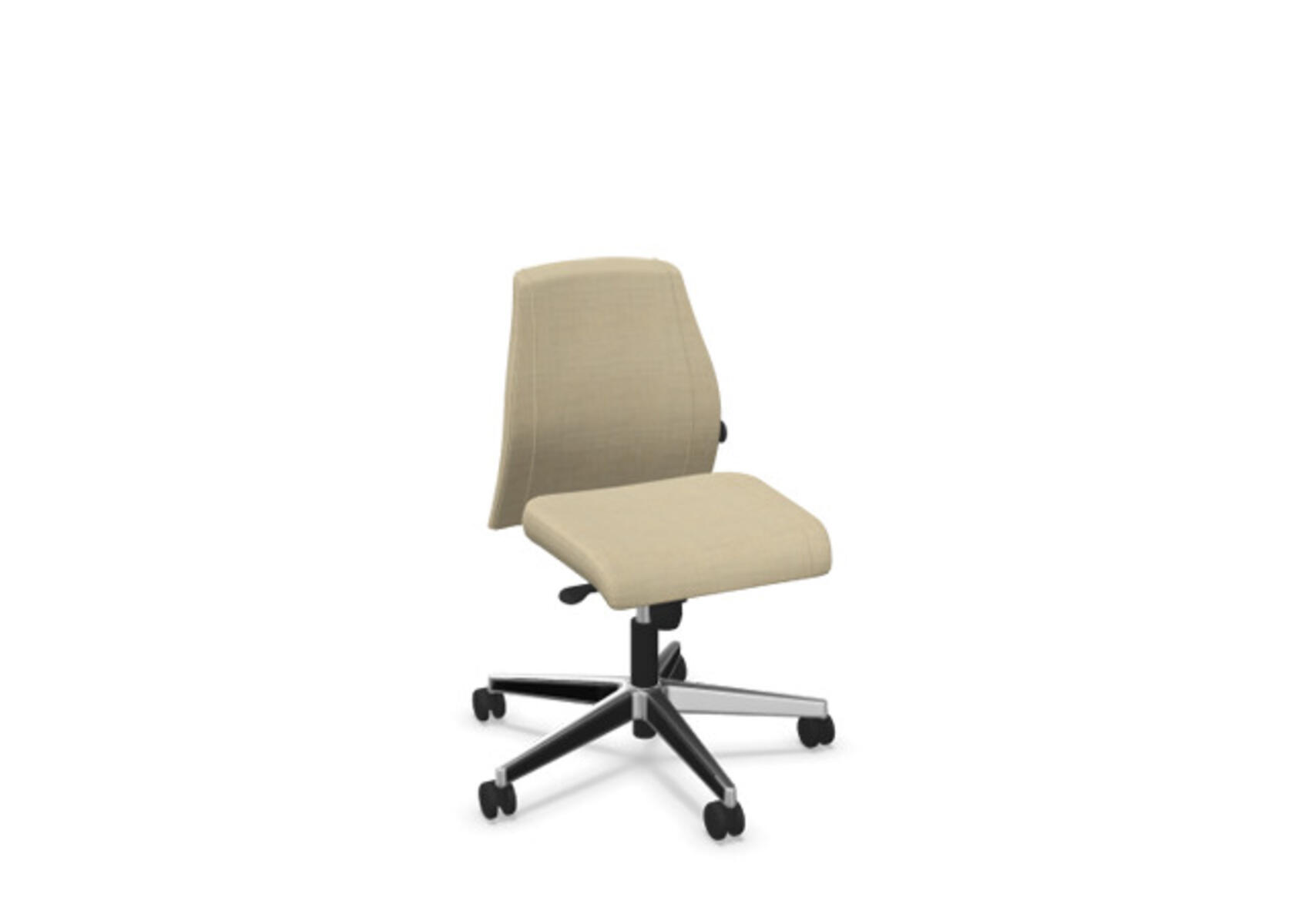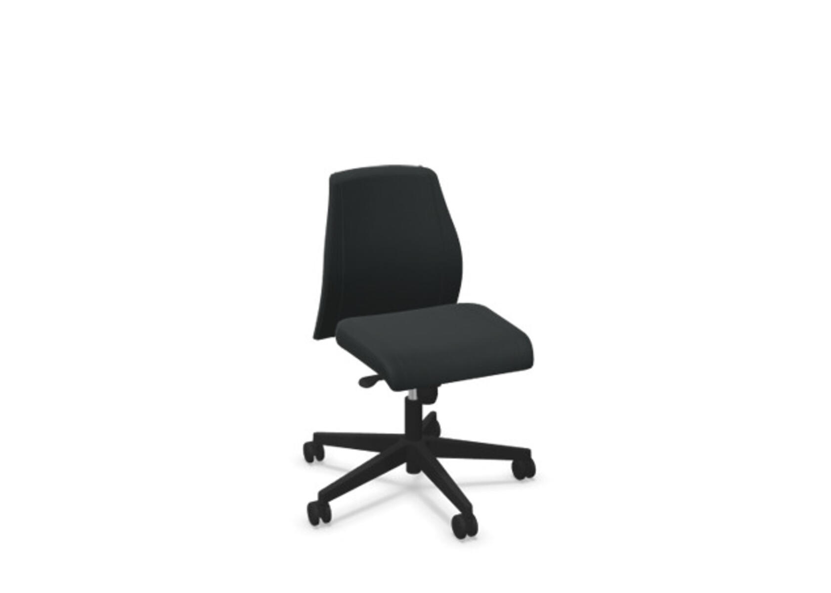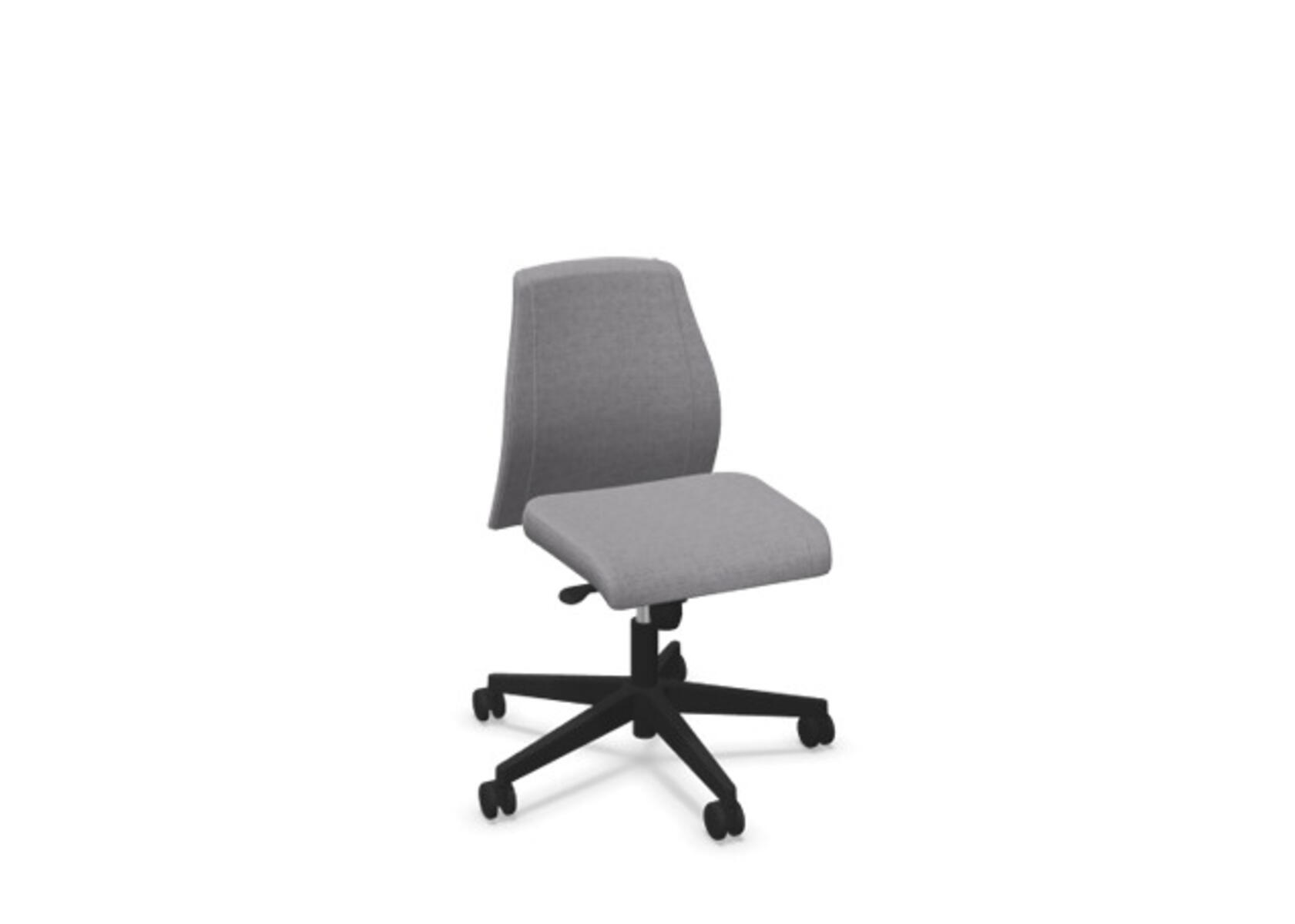 En stilren og ergonomisk kontorstol med heltrukket lav rygg og synkronmekanisme, utformet for å gi støtte ved aktiv sitting gjennom hele arbeidsdagen. Trukket i polyesterstoff. Den synkroniserte bevegelsen mellom ryggstøtte og sete gir en aktiv og komfortabel sittestilling. Ryggstøttets vippevinkel er 20° synkronisert med setets vippevinkel på 11°. Ryggstøtten kan låses i 5 ulike posisjoner for individuell tilpasning, og motstanden i ryggstøtten justeres enkelt med et dreiehjul. Ryggstøtten er høydejusterbar innenfor et område på 70 mm med 13 låseposisjoner. Stolen har også Anti-Shock-funksjon som hindrer ryggstøtten i å slå tilbake når vippen låses opp. Velg mellom kryss i svart polyamid eller polert aluminium samt selvbremsende hjul for myke eller harde gulv. Som tilvalg finnes også lumbalstøtte (Shukra-mekanisme), manuelt justerbar i dybden (20 mm) med et dreiehjul. Armlener i 1D, 2D, 3D eller 4D selges separat.