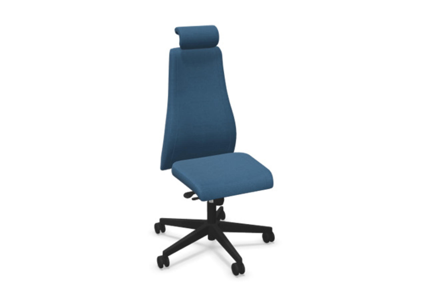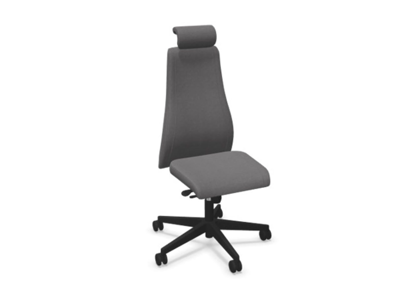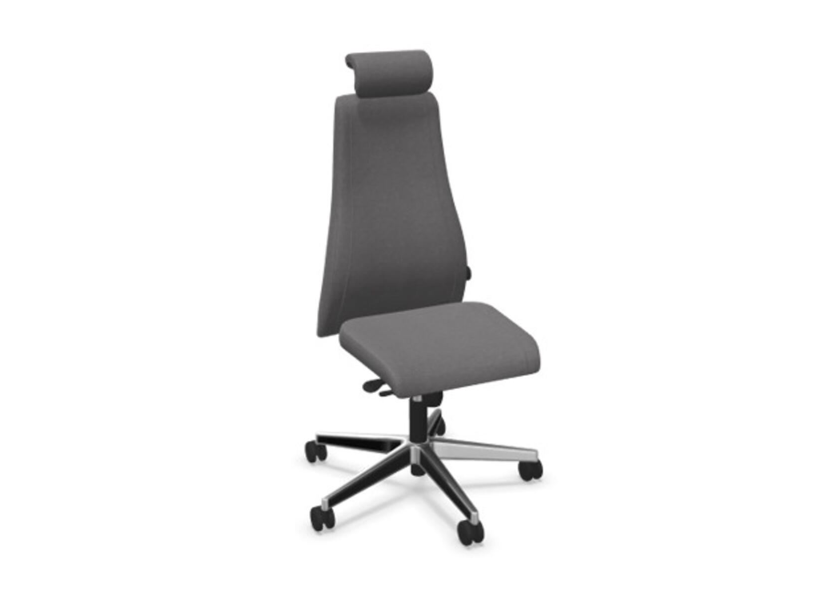 En stilren og ergonomisk kontorstol med heltrukket høy rygg og synkronmekanisme samt justering av sittedybde, utformet for å gi støtte ved aktiv sitting gjennom hele arbeidsdagen. Trukket i polyesterstoff. Den synkroniserte vippen mellom ryggstøtte og sete gir en aktiv og komfortabel sittestilling. Ryggstøttens vippevinkel er 20° synkronisert med setets vippevinkel på 11°. Ryggstøtten kan låses i 5 ulike posisjoner for individuell tilpasning, og motstanden i ryggstøtten justeres enkelt med et dreiehjul. Ryggstøtten er høydejusterbar innenfor et område på 70 mm med 13 låseposisjoner. Justerbart, polstret nakkestøtte med vinkel- og høydejustering innenfor et område på 75 mm. Sittedybden kan justeres innenfor et område på 50 mm. Stolen har også Anti-Shock-funksjon som hindrer ryggstøtten i å slå tilbake når vippen låses opp. Velg mellom kryss i svart polyamid eller polert aluminium samt selvbremsende hjul for myke eller harde gulv. Som tilvalg finnes også korsryggstøtte, manuelt justerbar i dybden (20 mm) med et dreiehjul. Armlener i 2D, 3D eller 4D selges separat.