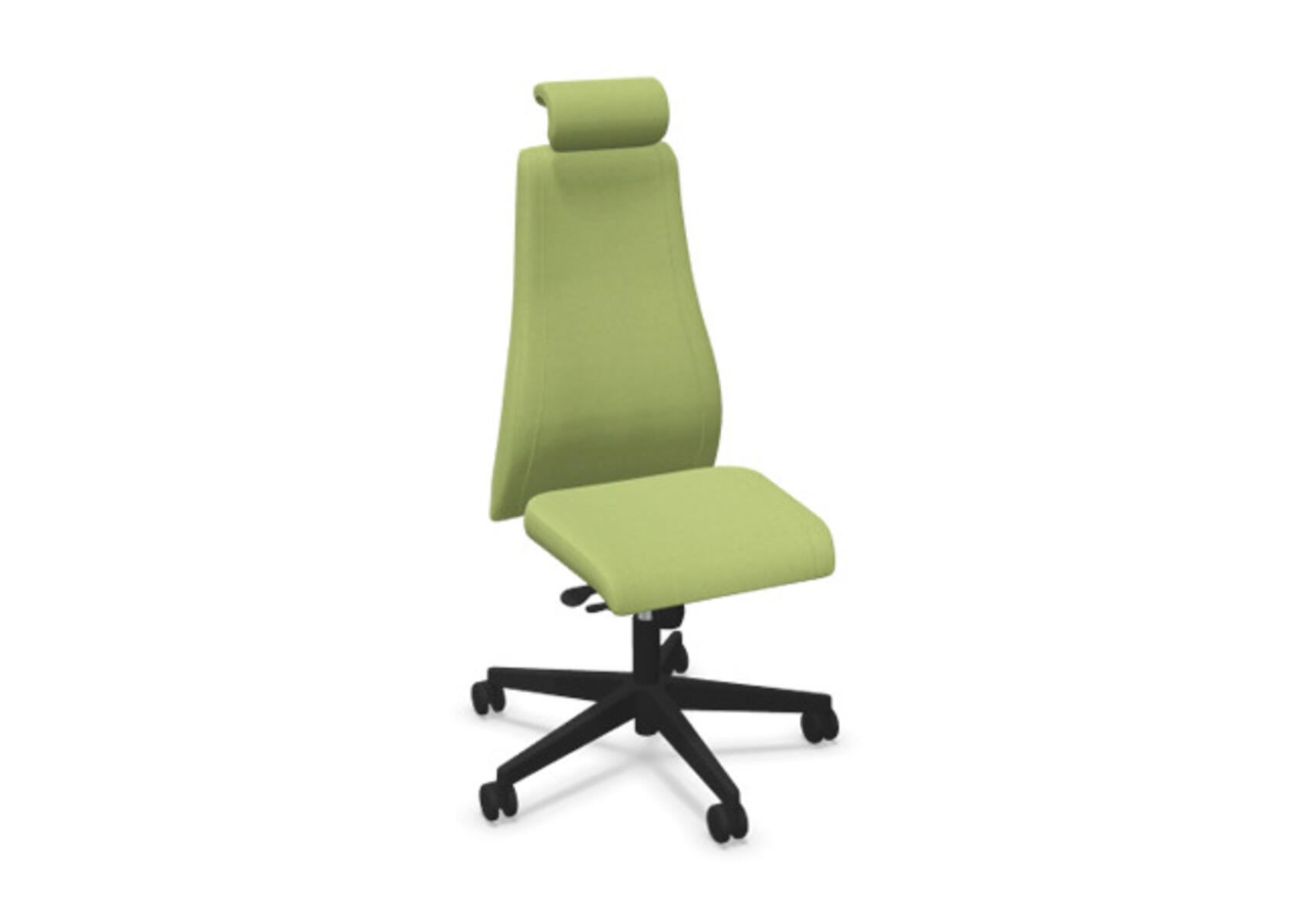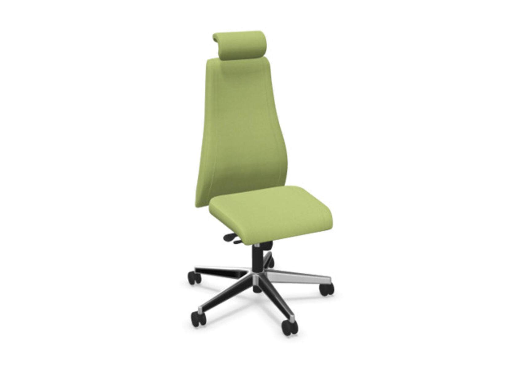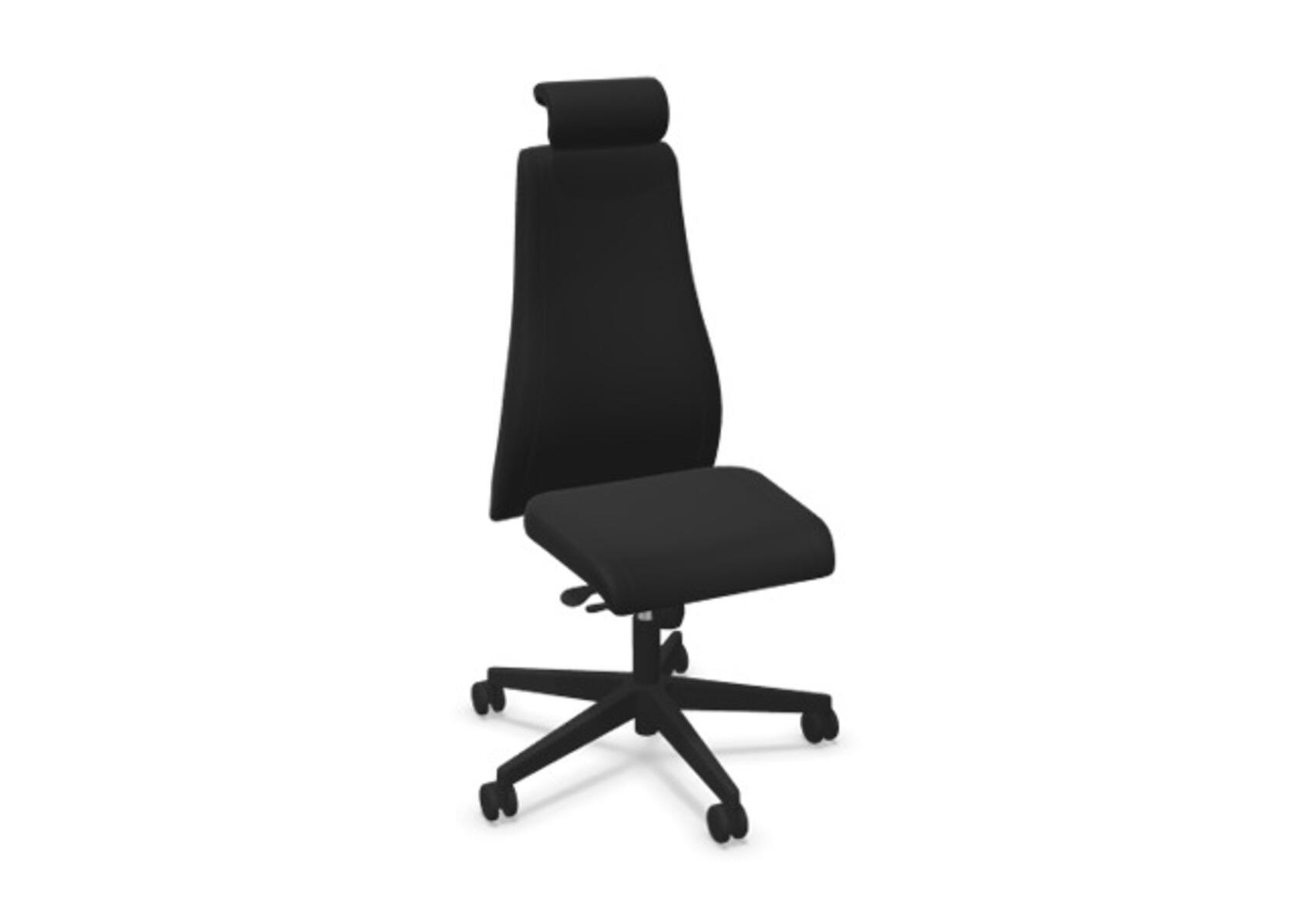 En stilren og ergonomisk kontorstol med heltrukket høy rygg og synkronmekanisme samt justering av sittedybde, utformet for å gi støtte ved aktiv sitting gjennom hele arbeidsdagen. Trukket i polyesterstoff. Den synkroniserte vippen mellom ryggstøtte og sete gir en aktiv og komfortabel sittestilling. Ryggstøttens vippevinkel er 20° synkronisert med setets vippevinkel på 11°. Ryggstøtten kan låses i 5 ulike posisjoner for individuell tilpasning, og motstanden i ryggstøtten justeres enkelt med et dreiehjul. Ryggstøtten er høydejusterbar innenfor et område på 70 mm med 13 låseposisjoner. Justerbart, polstret nakkestøtte med vinkel- og høydejustering innenfor et område på 75 mm. Sittedybden kan justeres innenfor et område på 50 mm. Stolen har også Anti-Shock-funksjon som hindrer ryggstøtten i å slå tilbake når vippen låses opp. Velg mellom kryss i svart polyamid eller polert aluminium samt selvbremsende hjul for myke eller harde gulv. Som tilvalg finnes også korsryggstøtte, manuelt justerbar i dybden (20 mm) med et dreiehjul. Armlener i 2D, 3D eller 4D selges separat.