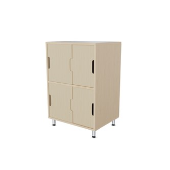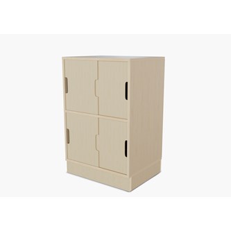 Komplett modul med valg av ben, hjul eller sokkel. Ved valg av ben og sokkel følger det med vinkelbeslag for å feste til veggen. Hjul inkluderer to faste og to bevegelige med låser. Ramme laget av 18 mm kryssfiner. Skyvedører med håndhull i 4 mm bjørkefiner.
