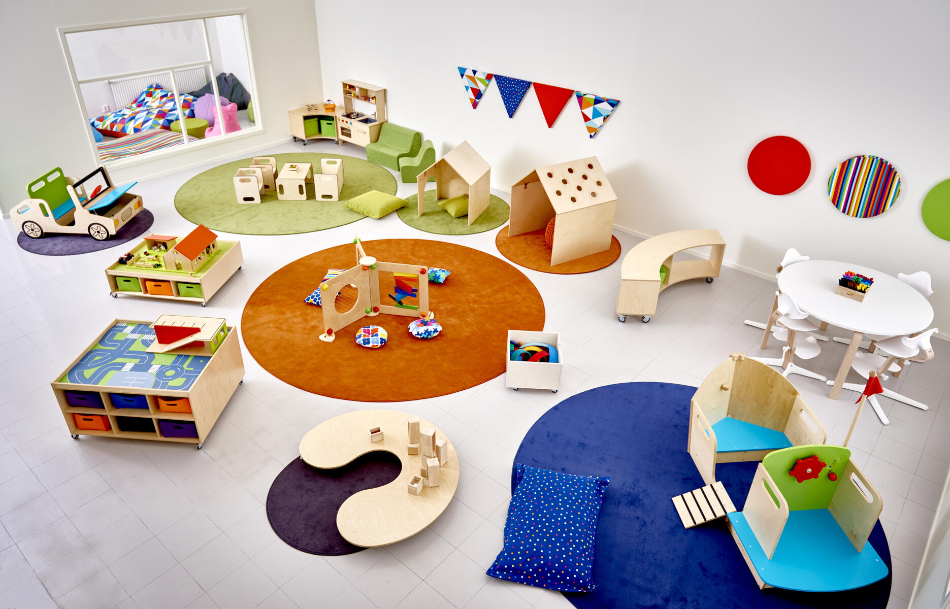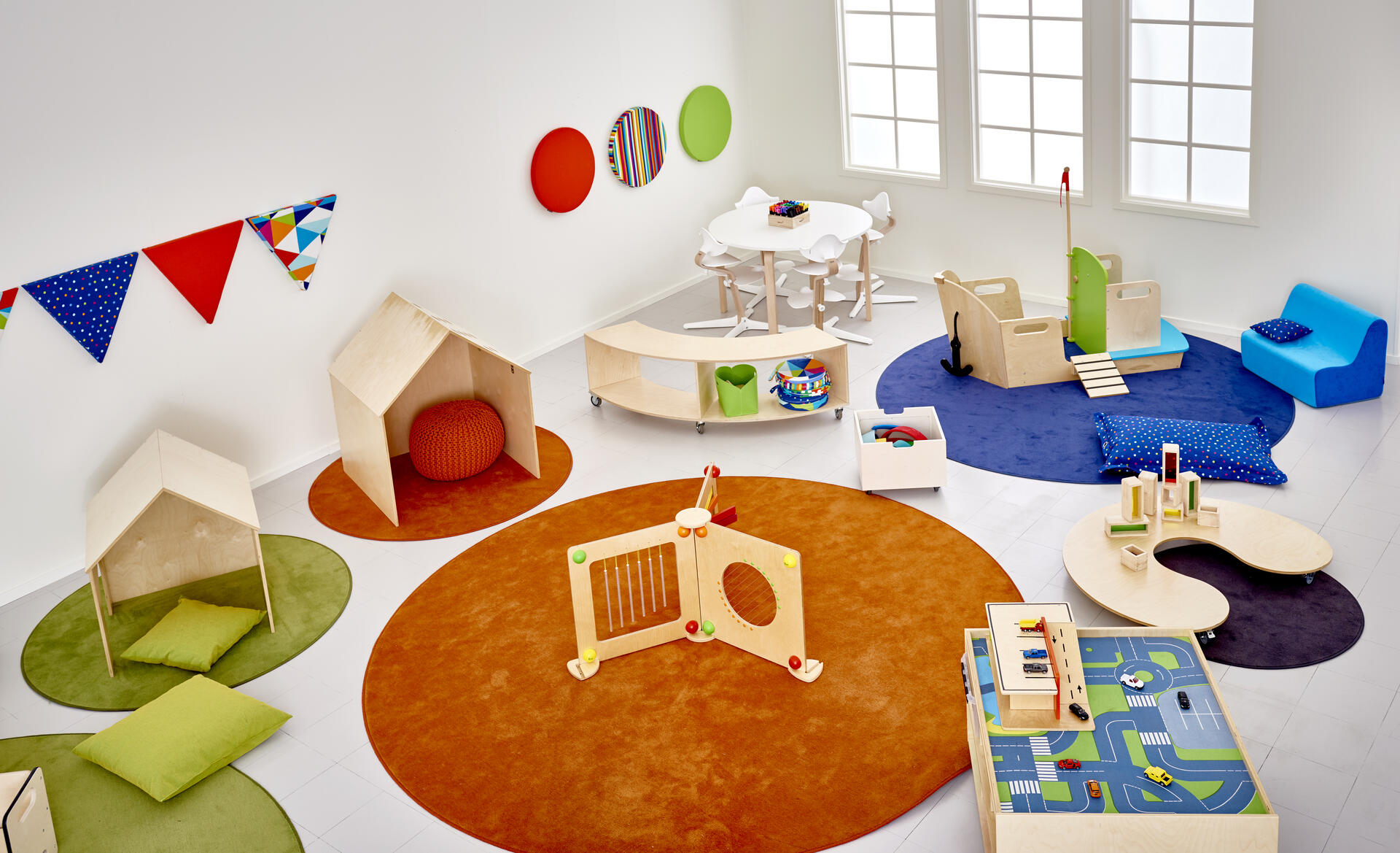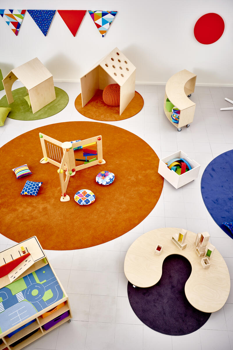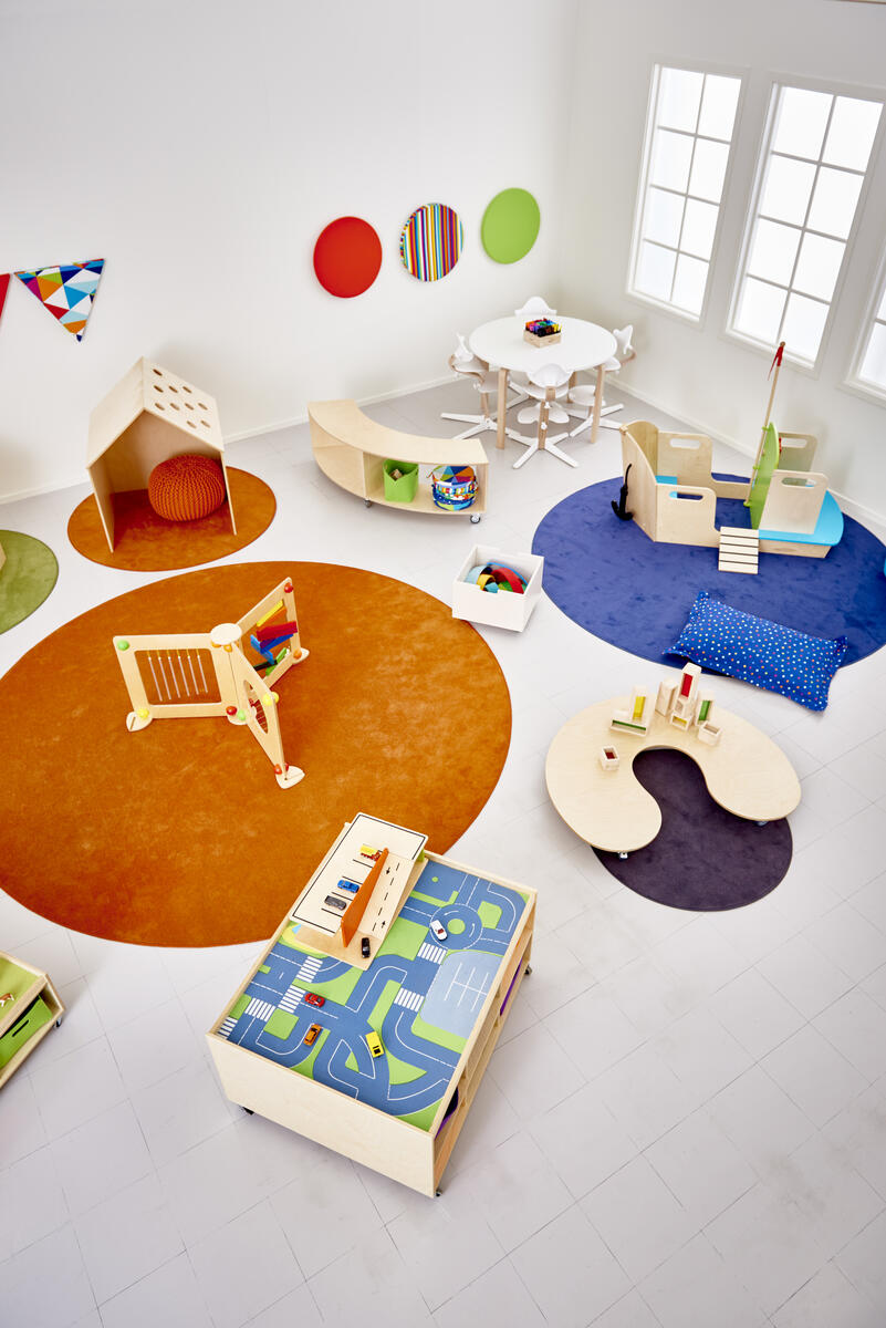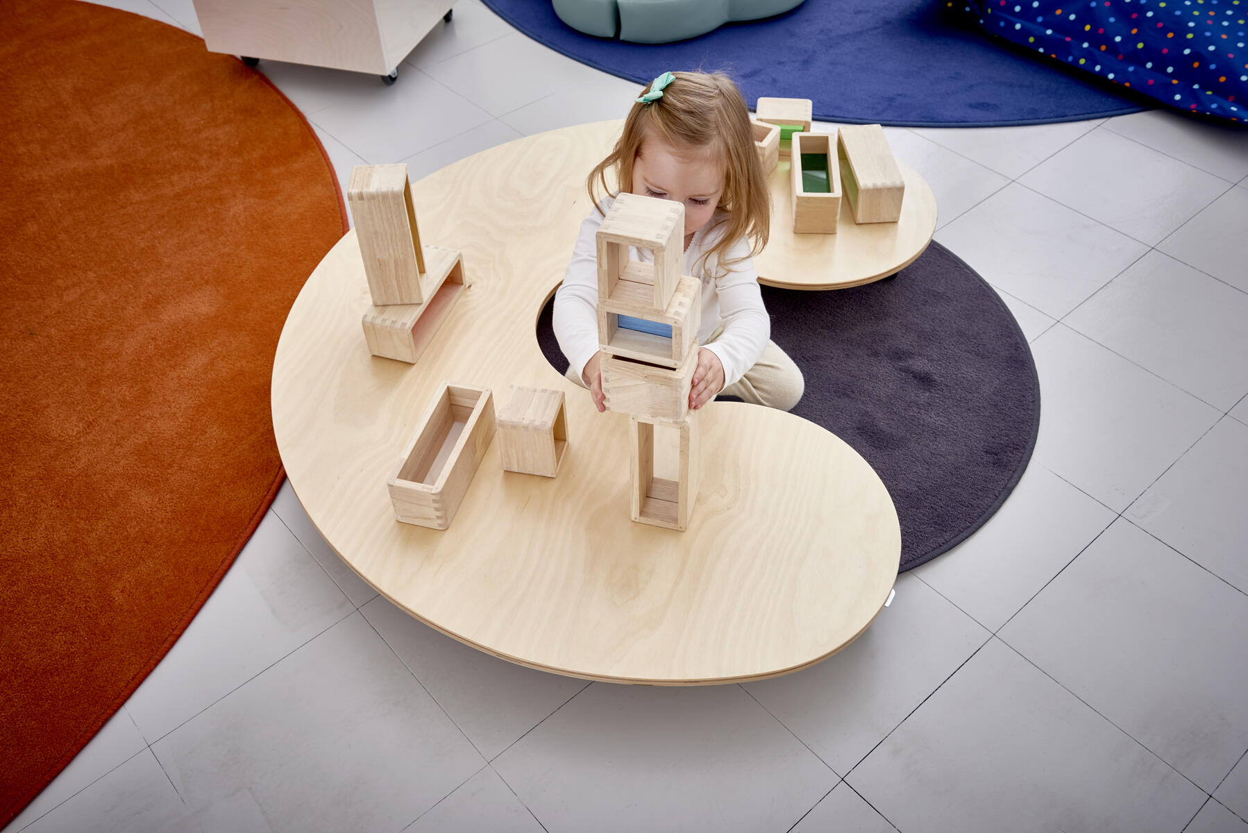 Praktisk lekebord med rund bordplate og 8 oppbevaringskasser. Laget av hvitpigmentert bjørk kryssfiner. Mål: 80x80xh50 cm inkl hjul. Bordplate Ø117 cm.