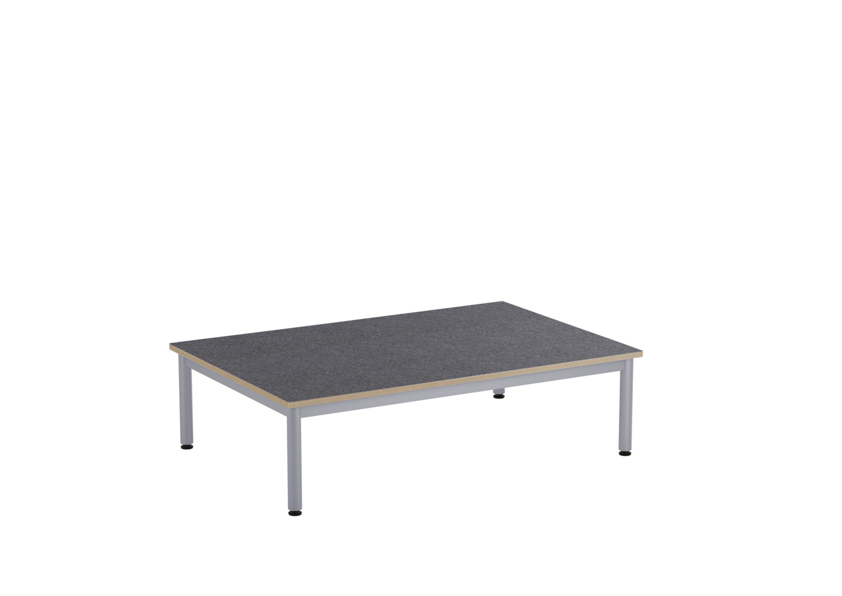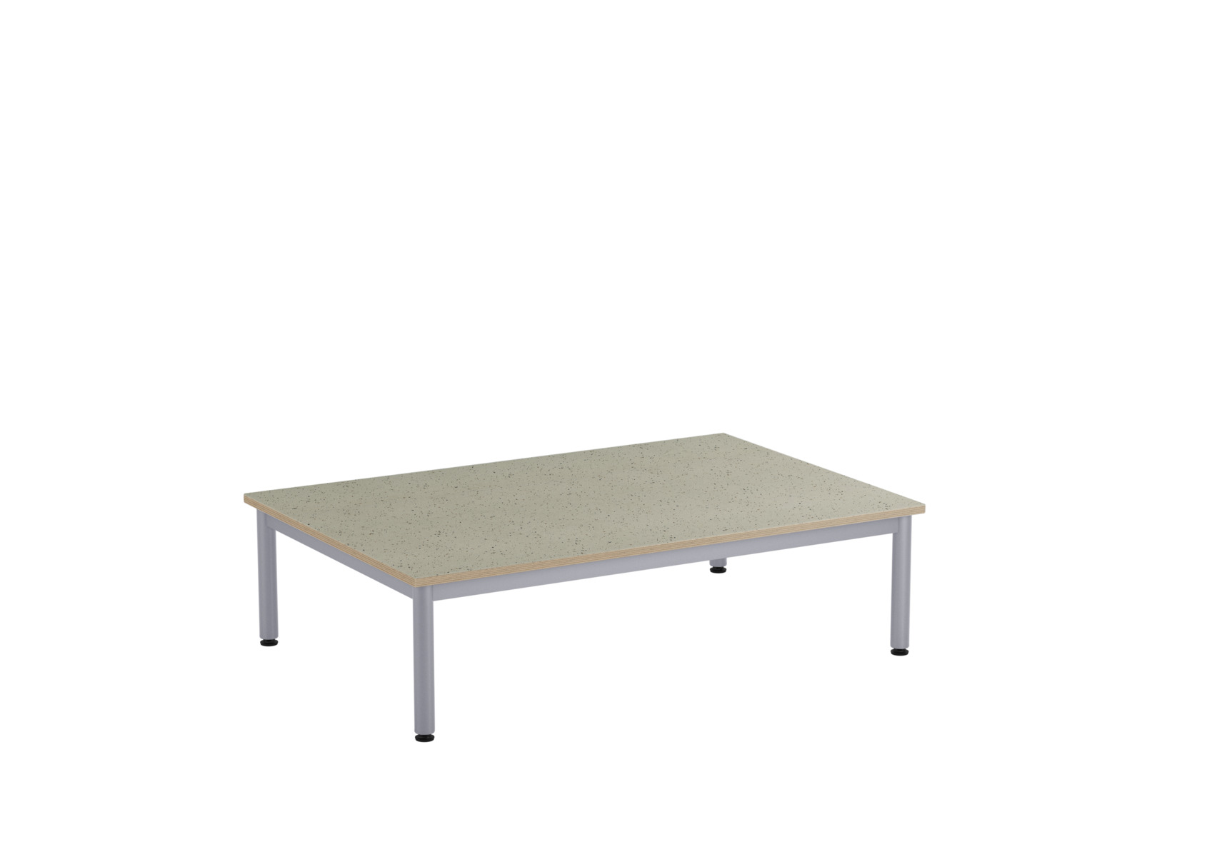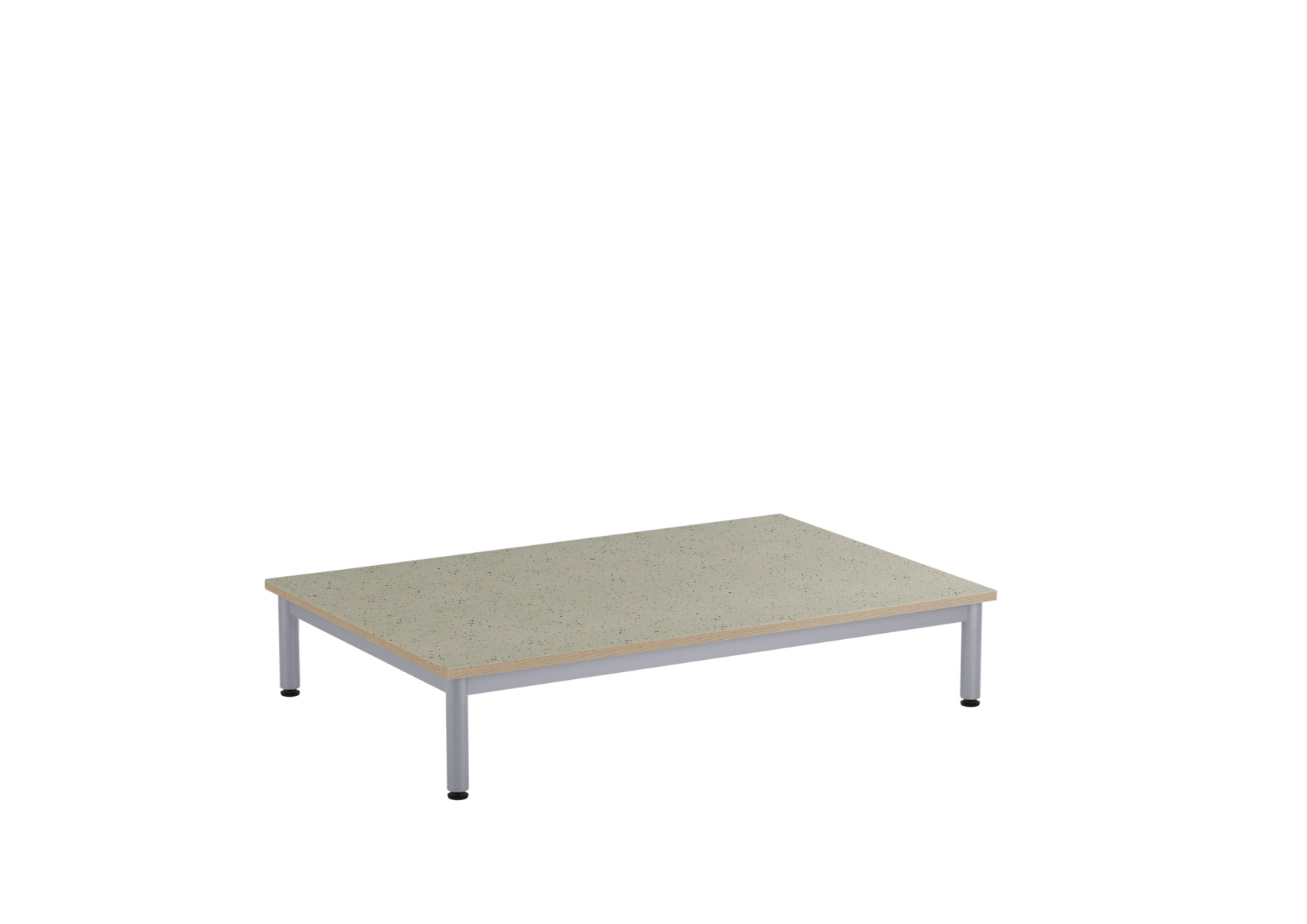Et lekebord med bordplate i akustisk linoleum, som bidrar til et bedre lydmiljø takket være linoleumens lydabsorberende egenskaper. Stabil sokkel med ramme og ben i dimensjon ø 40 mm, lakkert i sølv. Justerbare føtter for tilpasning til ujevne overflater.