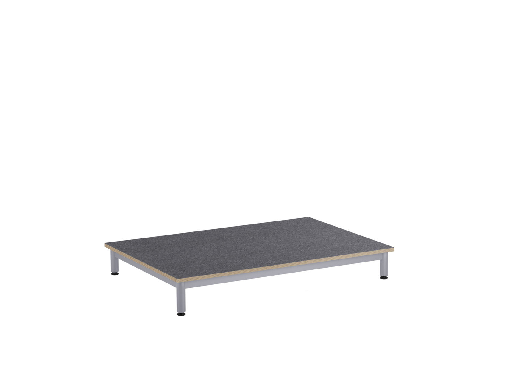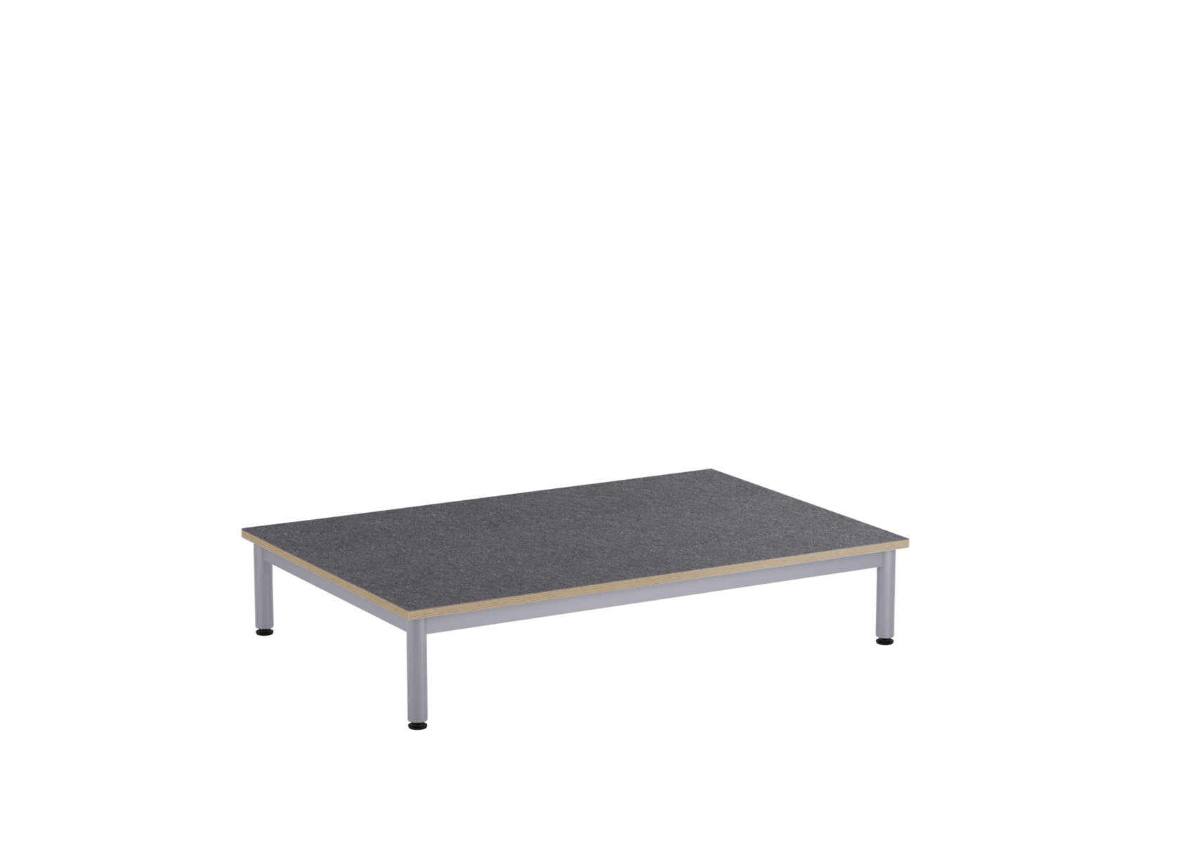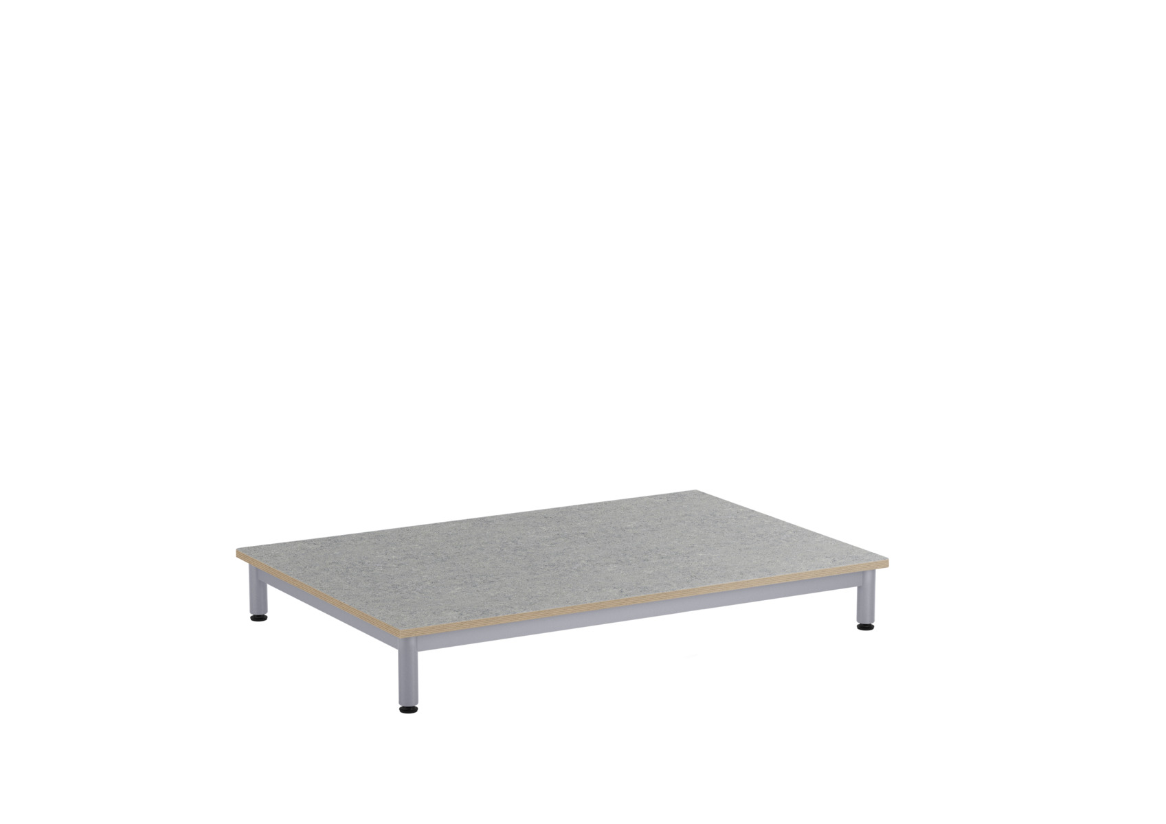 Et lekebord med bordplate i akustisk linoleum, som bidrar til et bedre lydmiljø takket være linoleumens lydabsorberende egenskaper. Stabil sokkel med ramme og ben i dimensjon ø 40 mm, lakkert i sølv. Justerbare føtter for tilpasning til ujevne overflater.