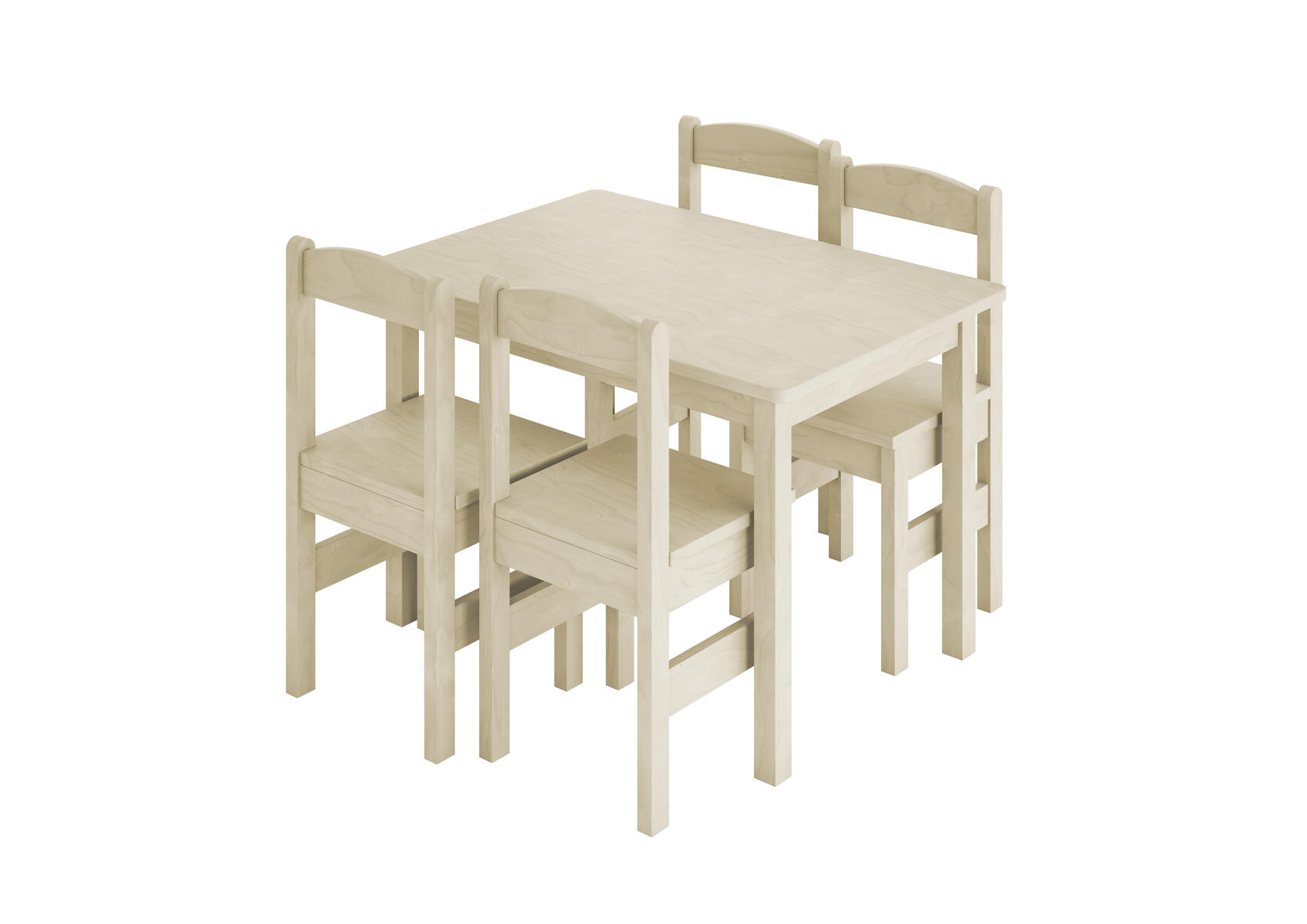 Massiv bjørk natur. Bord 80x55xh53cm. Stolene har sittehøyde 34 cm. Benk lengde 60cm, sittehøyde 34cm.