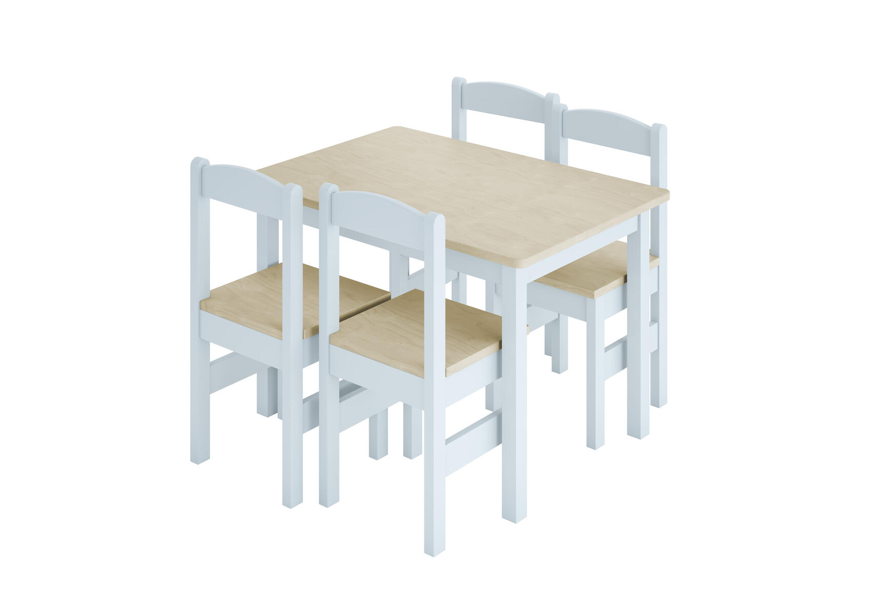 Lekebord i hvitbeiset massiv bjørk, med natur bjørk på sitteplate og bordplate. Bord 80x55xh53cm. Stolene har sittehøyde 34 cm. Benk lengde 60cm, sittehyde 34cm