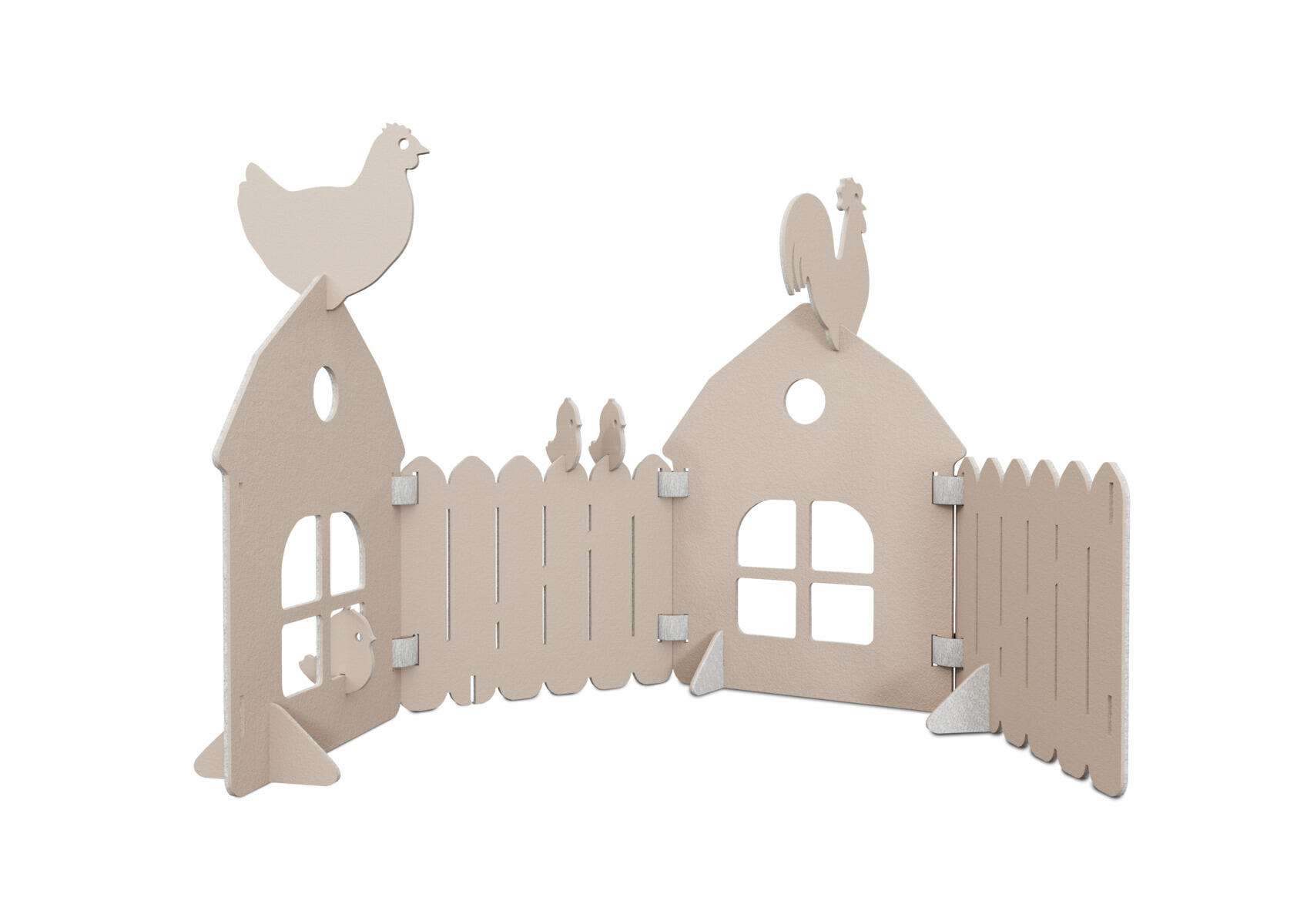 Lekeskjermer i støydempende filt. Brukes til scenografi, som romdeler eller som et forsterkende element i leken. Alle delene i Saga-serien kan brukes sammen. En huskombinasjon fra en bondegård med 4 skjermer, 4 føtter og 6 hengsler. Dette inkluderer også en hane, en høne og tre kyllinger som kan monteres på lekeskjermene. Skjermene er tofargede, den ene siden er alltid lysegrå. Føtter følger samme fargekombinasjon som fargevalg. Hengsler er lysegrå. Mål på skjermer: B58xH70 cm. Minst 50 % resirkulert materiale. 100 % resirkulerbar.
