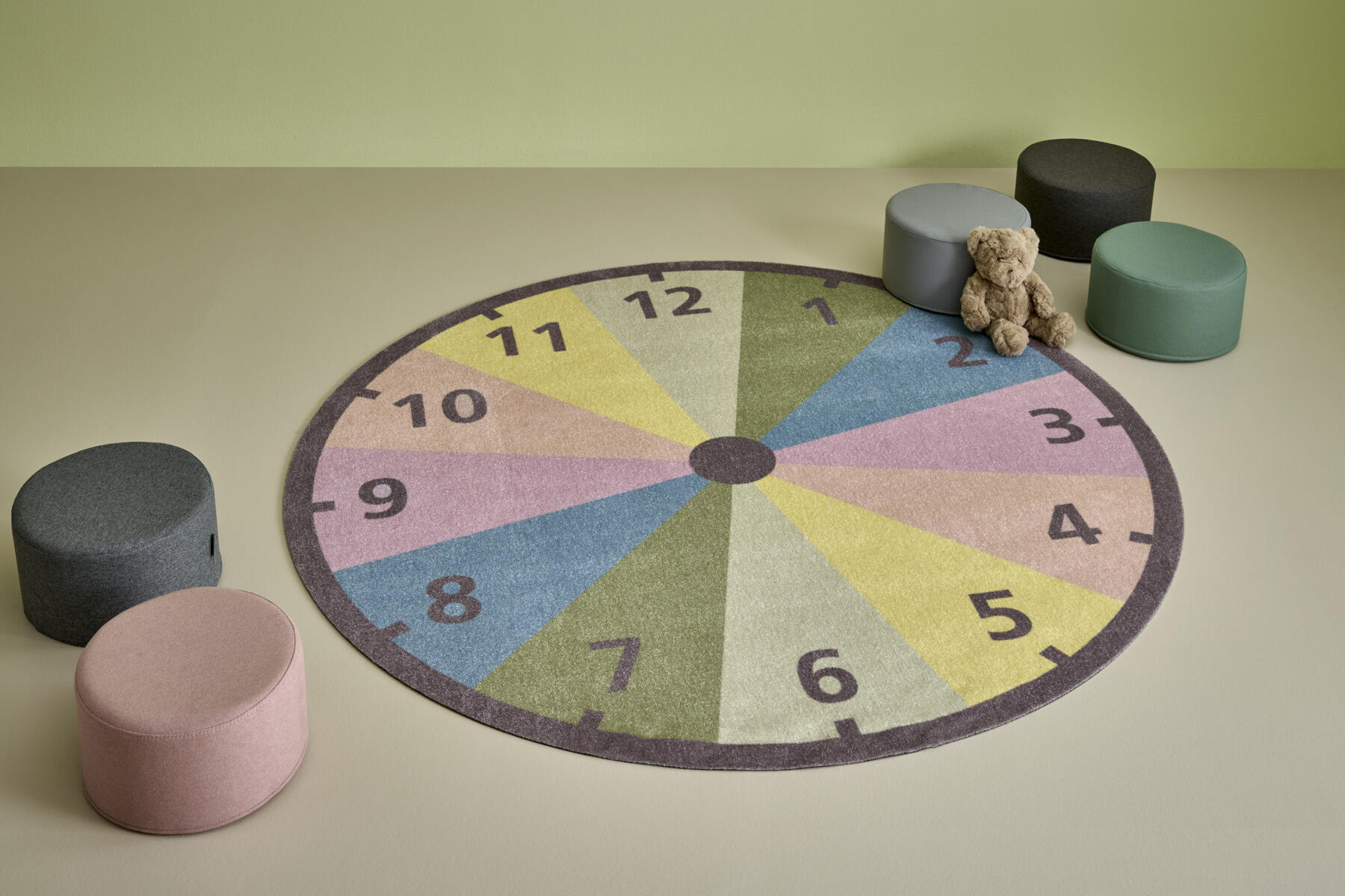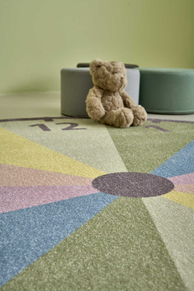 Matte med digitalt trykk i form av en klokke. Friséstruktur. 100 % polyamid. Lugghøyde 6 mm, luggvekt 1300 g/m². Bakside med sklisikker gummibelegg, PVC‑fri og ftalatfri. Kan brukes på tørre gulv med gulvvarme.