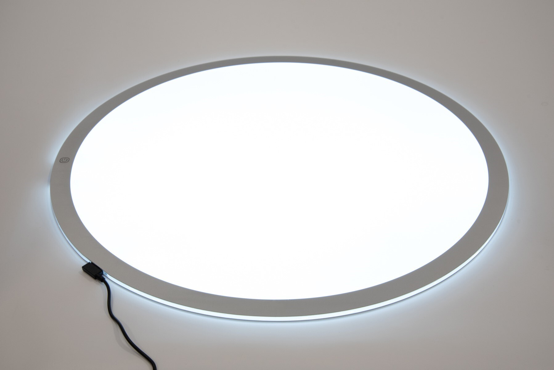 Lysbord med LED og tre lysnivåinnstillinger. Magnetisk kontakt. Tålige, bærbare og lette å tørke av. Enkel håndtering med låsefunksjon for å forhindre at de slås av utilsiktet. Størrelse: Ø60 cm. Betraktningsflate: Ø55 cm. Brenntid 50 000 timer. Adapter inkludert. Bruk under tilsyn av voksen.