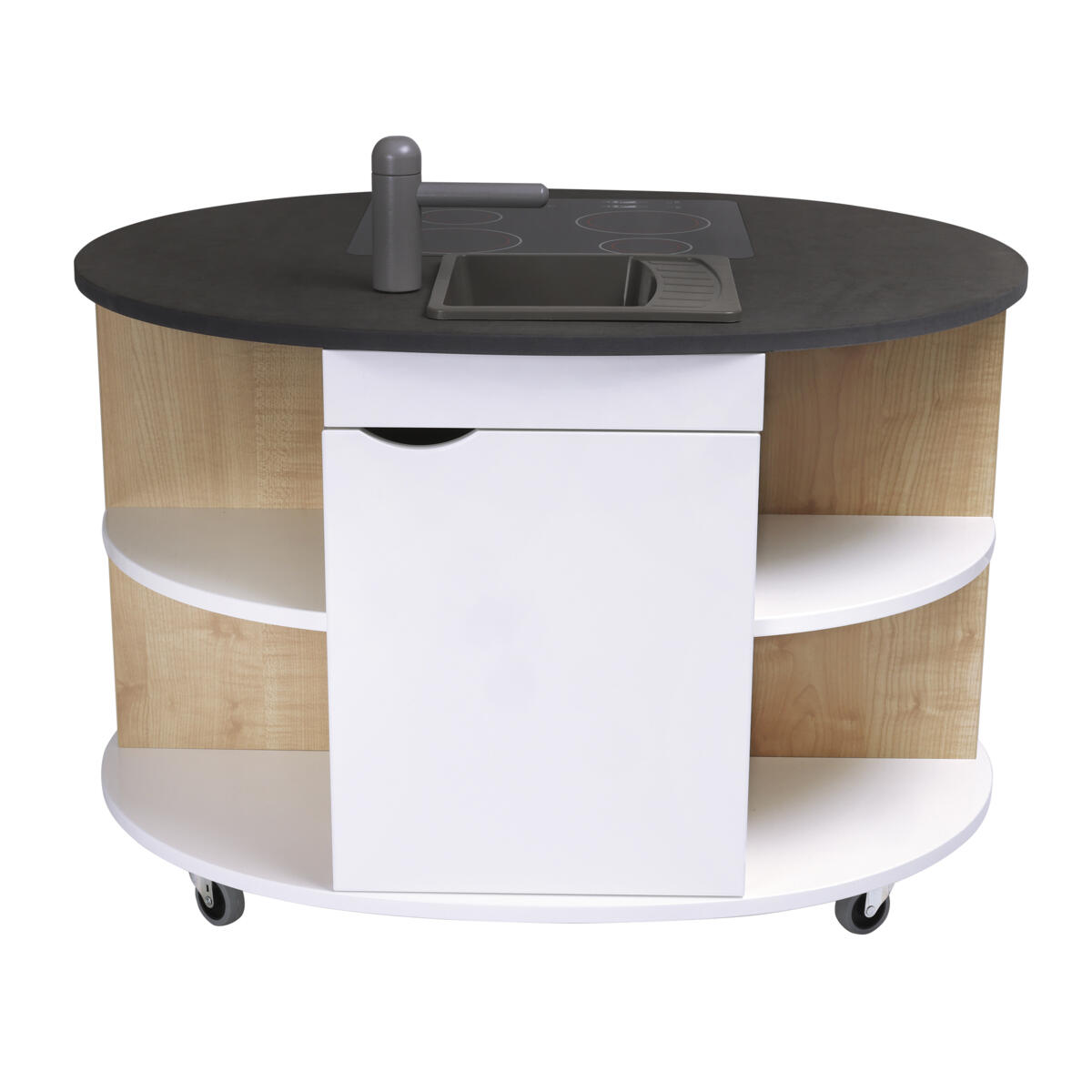 Lekekjøkken som passer fint i barnehagen. Den ene siden er komfyr og den andre oppvaskbenk. Står på 4 hjul, to låsbare. Materiale: 16 mm sponplate, 16 mm MDF for stamme og plate. oppvaskbalje i PP. Vindu i akrylplast. Mål: 70x115x62 cm. Passer fra 3 år. Vekt 47 kg. Lekekjøkken leveres montert.