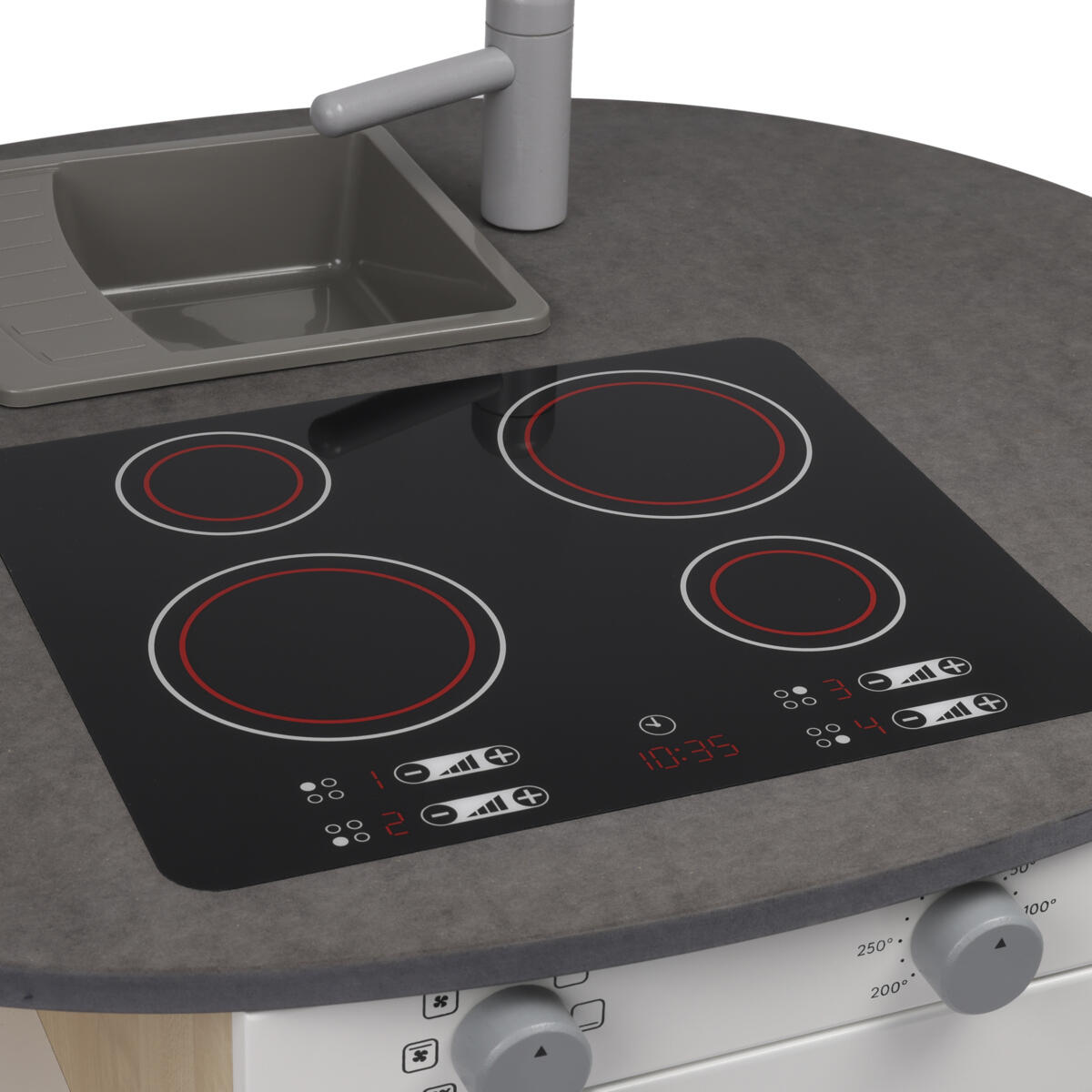 Liten kjøkkenøy for de litt mindre barna. Med induksjonstopp, stekeovn,oppvaskkum, skap og vribare knappet. Kjøkkenlyen har 4 hjul, to av dem er låsbare.