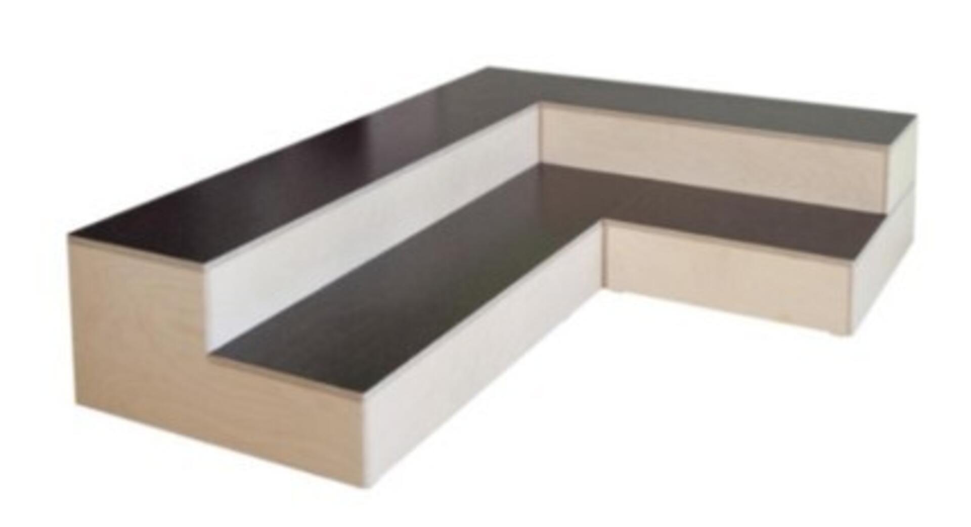 Scenemodul med riflet overflate i fenolfilm for bedre grep og sklibeskyttelse. Med utfreste håndtak. Mål: 60x60x30 cm. Hvitpigmentert bjørk kryssfiner med grå topp.