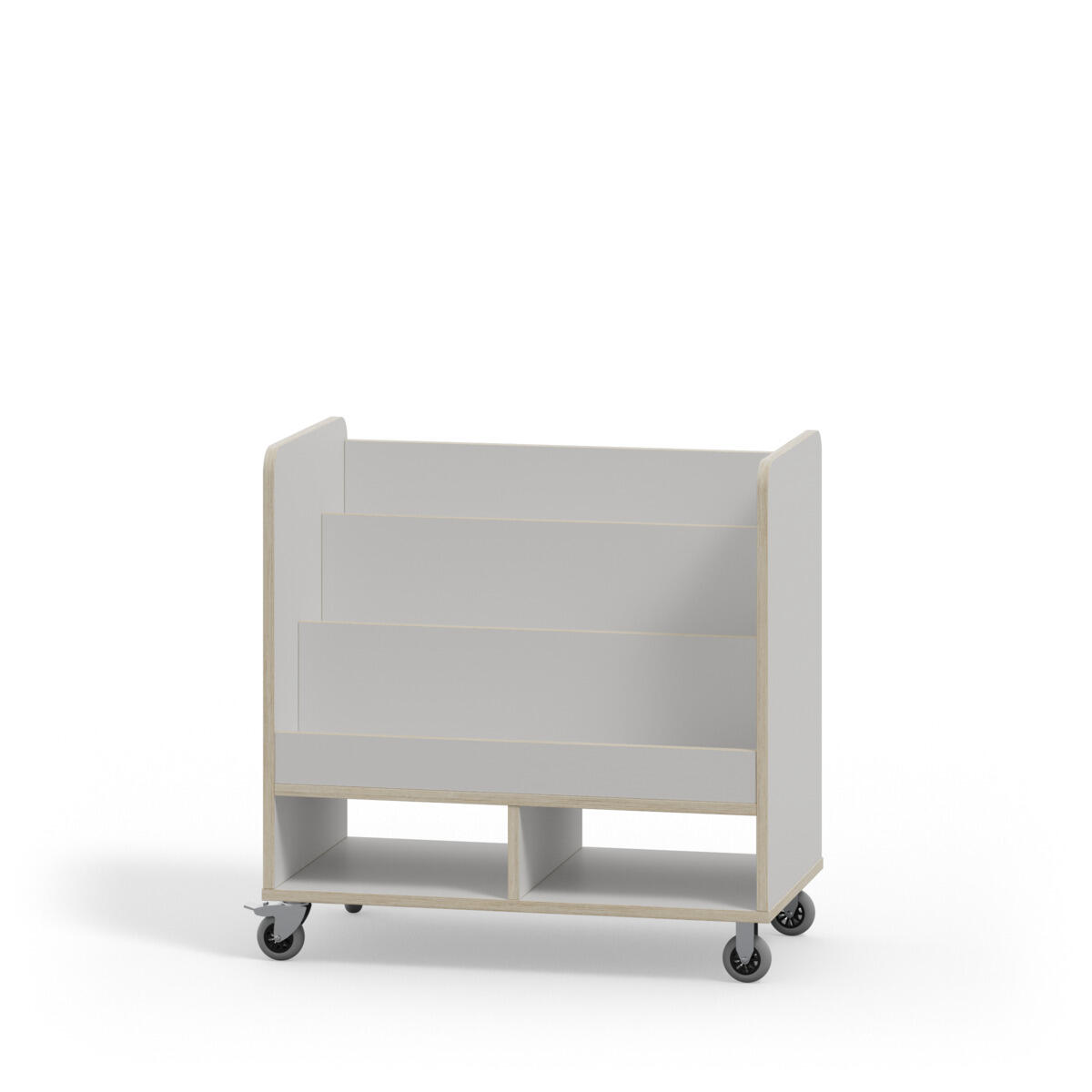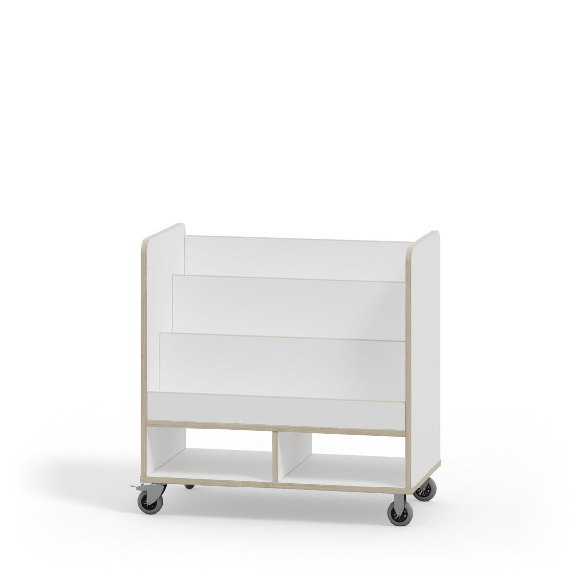 Enkeltsidig bokvogn som kan plasseres mot vegg. Laget av 18 mm hvitpigmentert bjørkekryssfiner. 4 låsbare hjul. Kurver følger ikke med, men kan bestilles separat. Mål: 64,5x40xh71 cm.