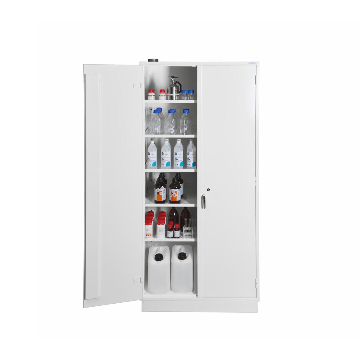 Brannisoleret kjemikalieskap for oppbevaring av brannfarlige og giftige kjemikalier. Produsert i kraftig stålplate, med dører, gavler, tak og bunn i sandwichkonstruksjon med brannisolasjon i henhold til Euroclass A1. Innfelte dører med forsterkningsprofil og håndtak med bruddpunkt for økt sikkerhet. En sveiset sperre på hengselsiden hindrer oppbryting selv om hengslene fjernes. Skapet leveres med kraftig espanjolettlås og ASSA‑sylinderlås med to nøkler (ikke montert ved levering).