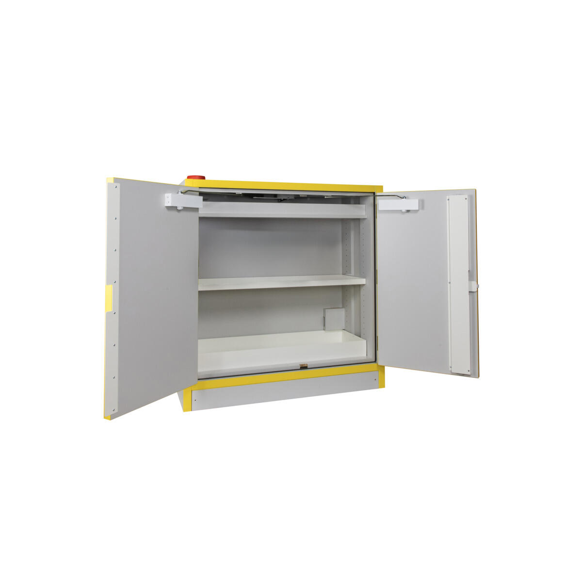 Brannklassifisert kjemikalieskap F30 for oppbevaring av brannfarlige og giftige kjemikalier. Skapet leveres med håndtakslås med to nøkler (montert ved levering). 1 flyttbar hylle og 1 bunnkar med perforert bunnplate. Oppsamlingsvolum: 31 liter. Hyllekapasitet: 50 kg jevnt fordelt belastning. Utstyrt med ventilasjonsstuss i bakvegg (Ø 100 mm) for tilluft og tilkobling til avtrekk.