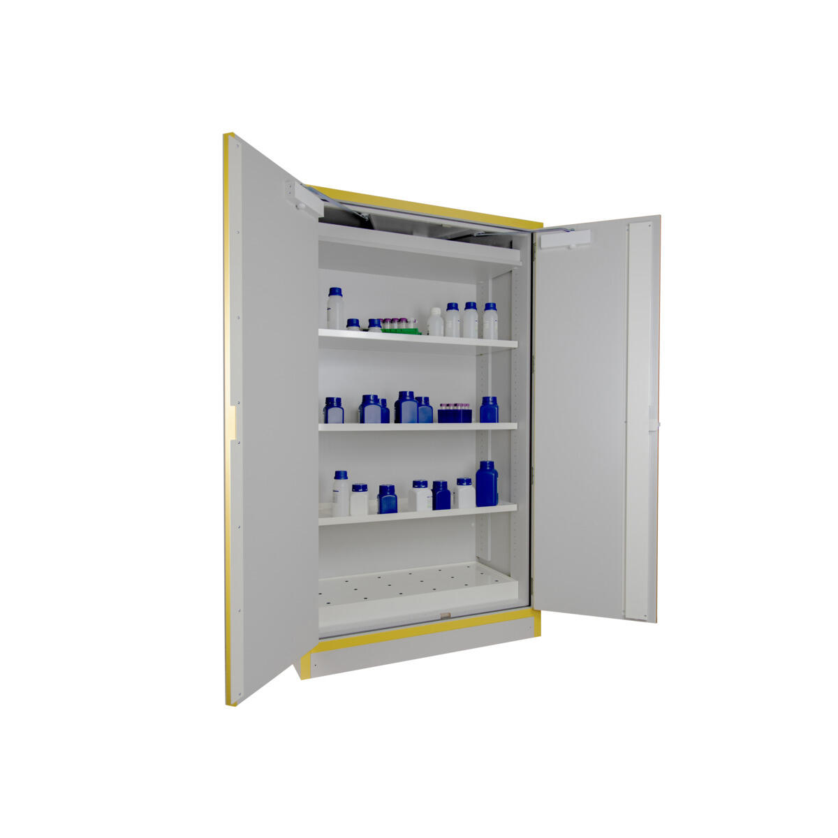 Brannklassifisert kjemikalieskap F30 for oppbevaring av brannfarlige og giftige kjemikalier. Skapet leveres med håndtakslås med to nøkler (montert ved levering). 3 flyttbare hylleplan samt 1 bunnkar med perforert bunnplate. Oppsamlingsvolum: 20 liter. Hyllekapasitet: 50 kg jevnt fordelt belastning. Utstyrt med ventilasjonsstuss i toppen (Ø 100 mm) for tilluft og tilkobling til avtrekk.