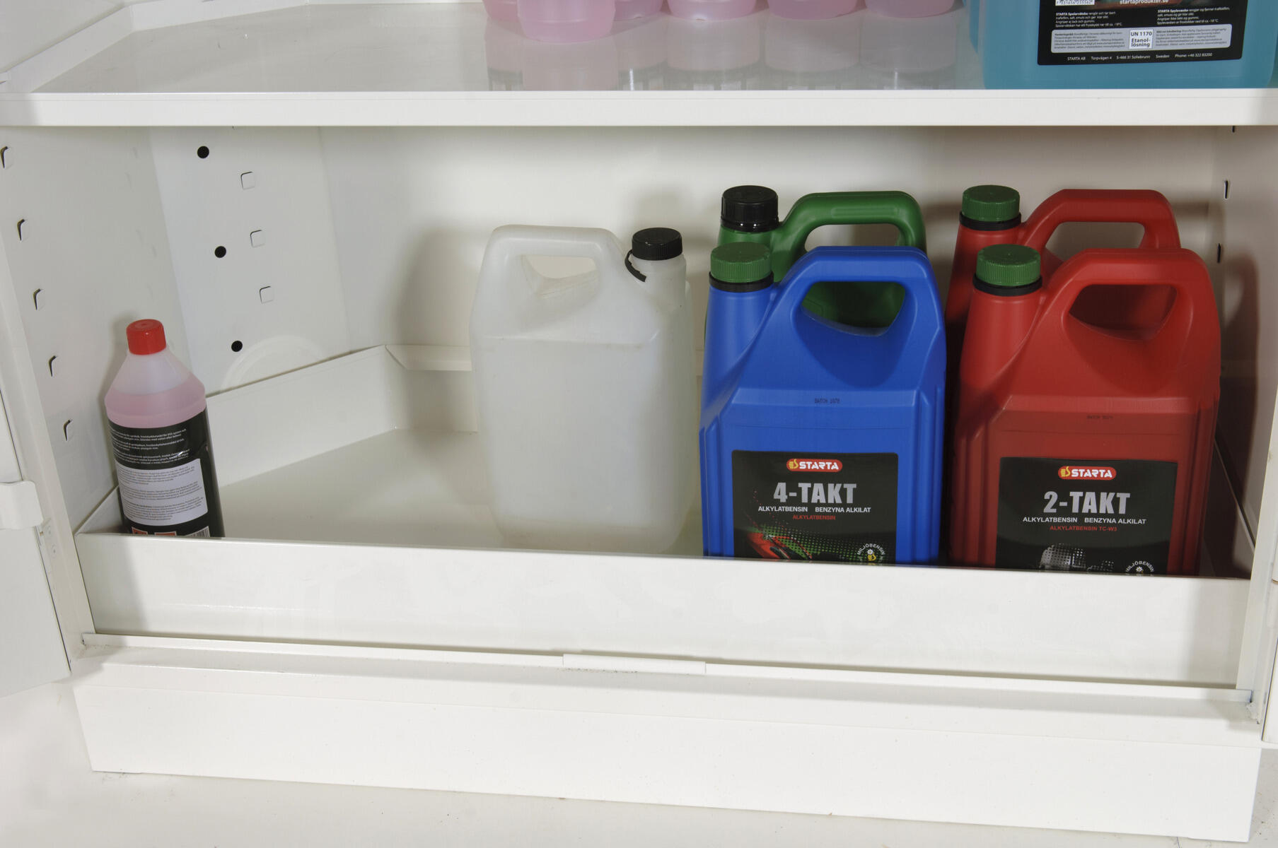 Brannklassifisert kjemikalieskap F30 for oppbevaring av brannfarlige og giftige kjemikalier. Skapet leveres med håndtakslås med to nøkler (montert ved levering). 3 flyttbare hylleplan samt 1 bunnkar med perforert bunnplate. Oppsamlingsvolum: 20 liter. Hyllekapasitet: 50 kg jevnt fordelt belastning. Utstyrt med ventilasjonsstuss i toppen (Ø 100 mm) for tilluft og tilkobling til avtrekk.